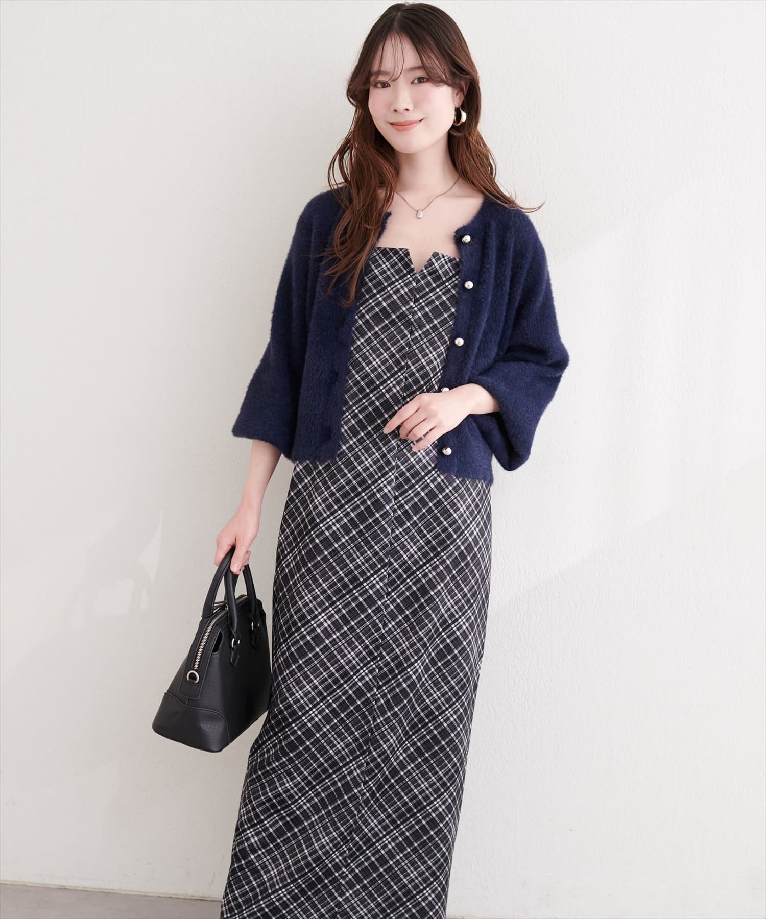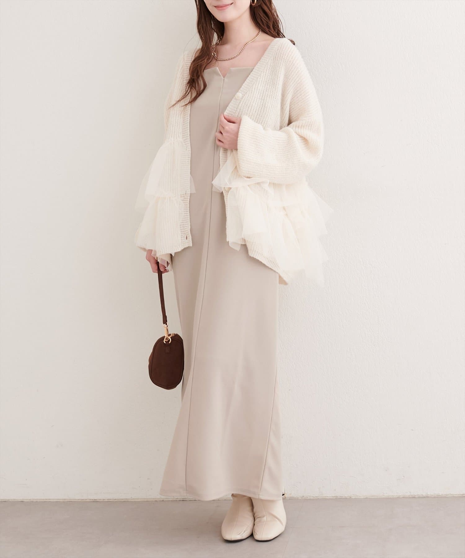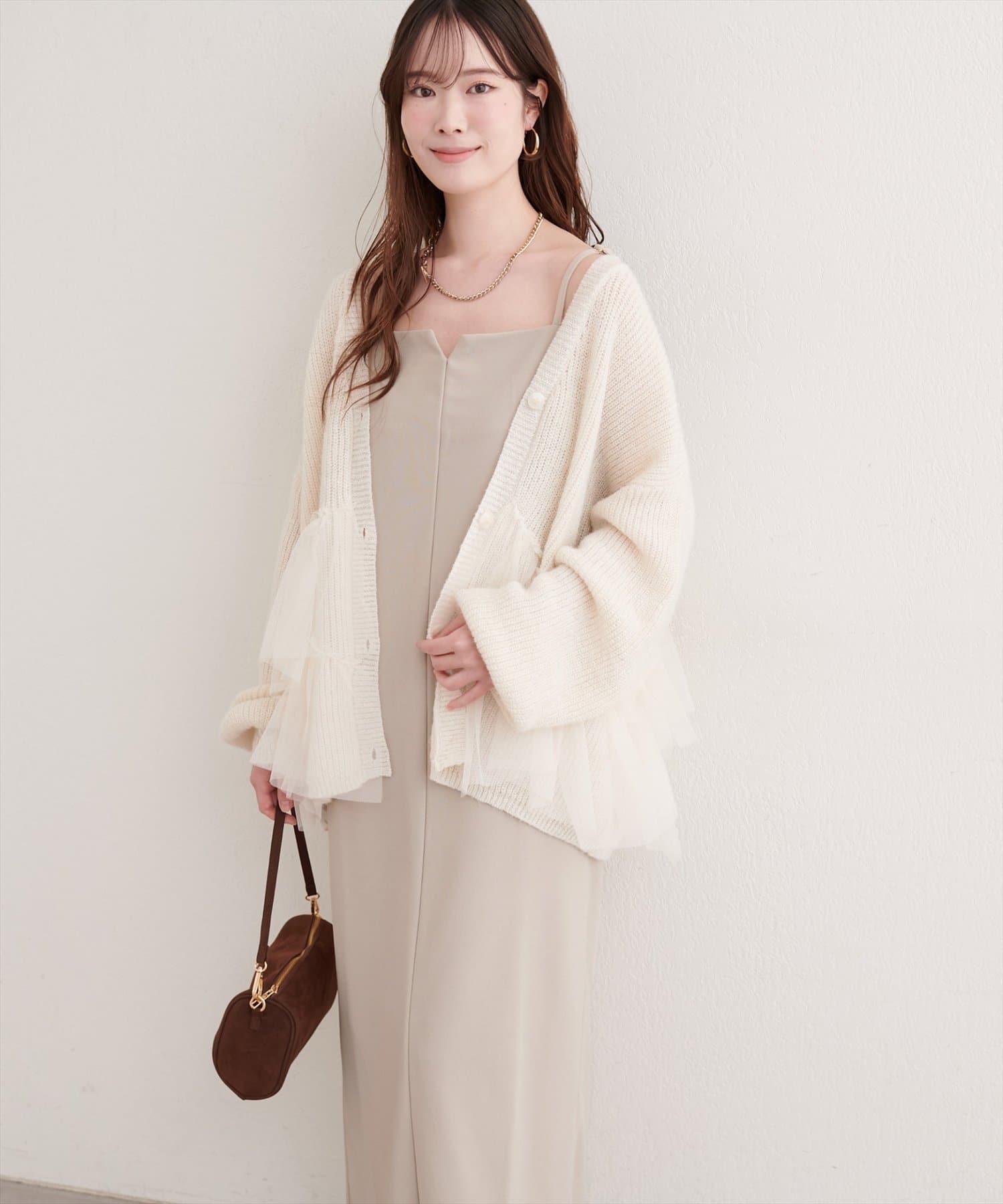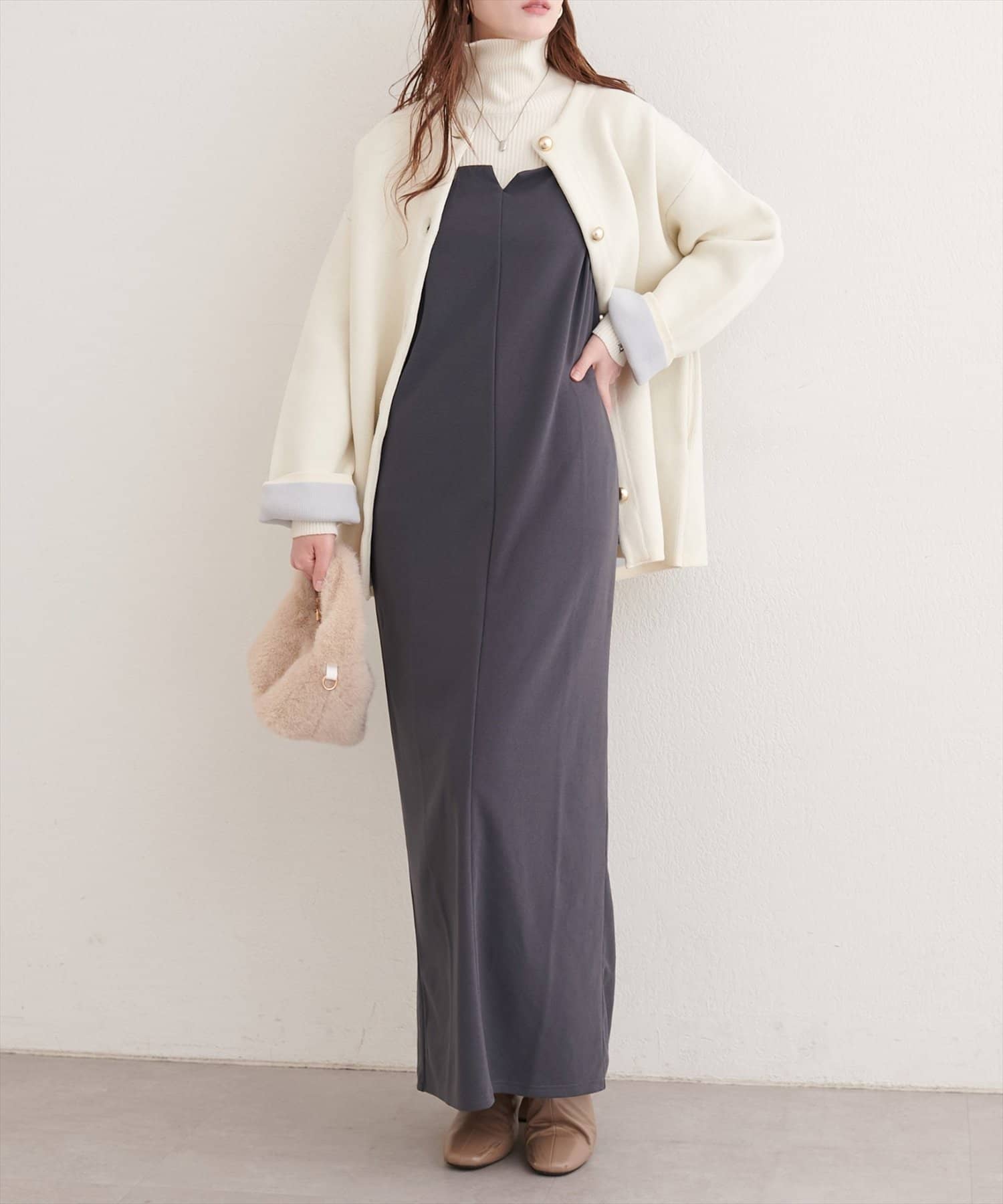 これからの季節には少しゆとりのある羽織や、シャギーカーディガンなどと
