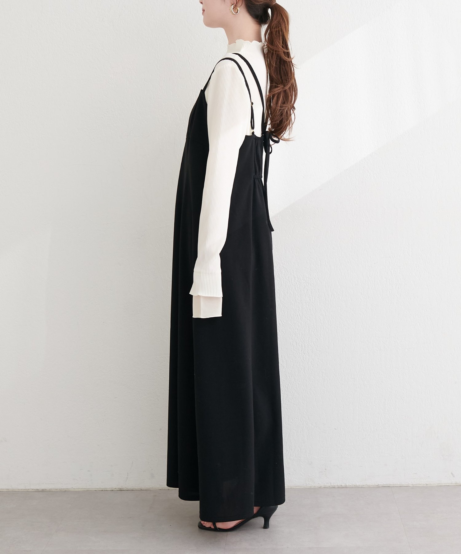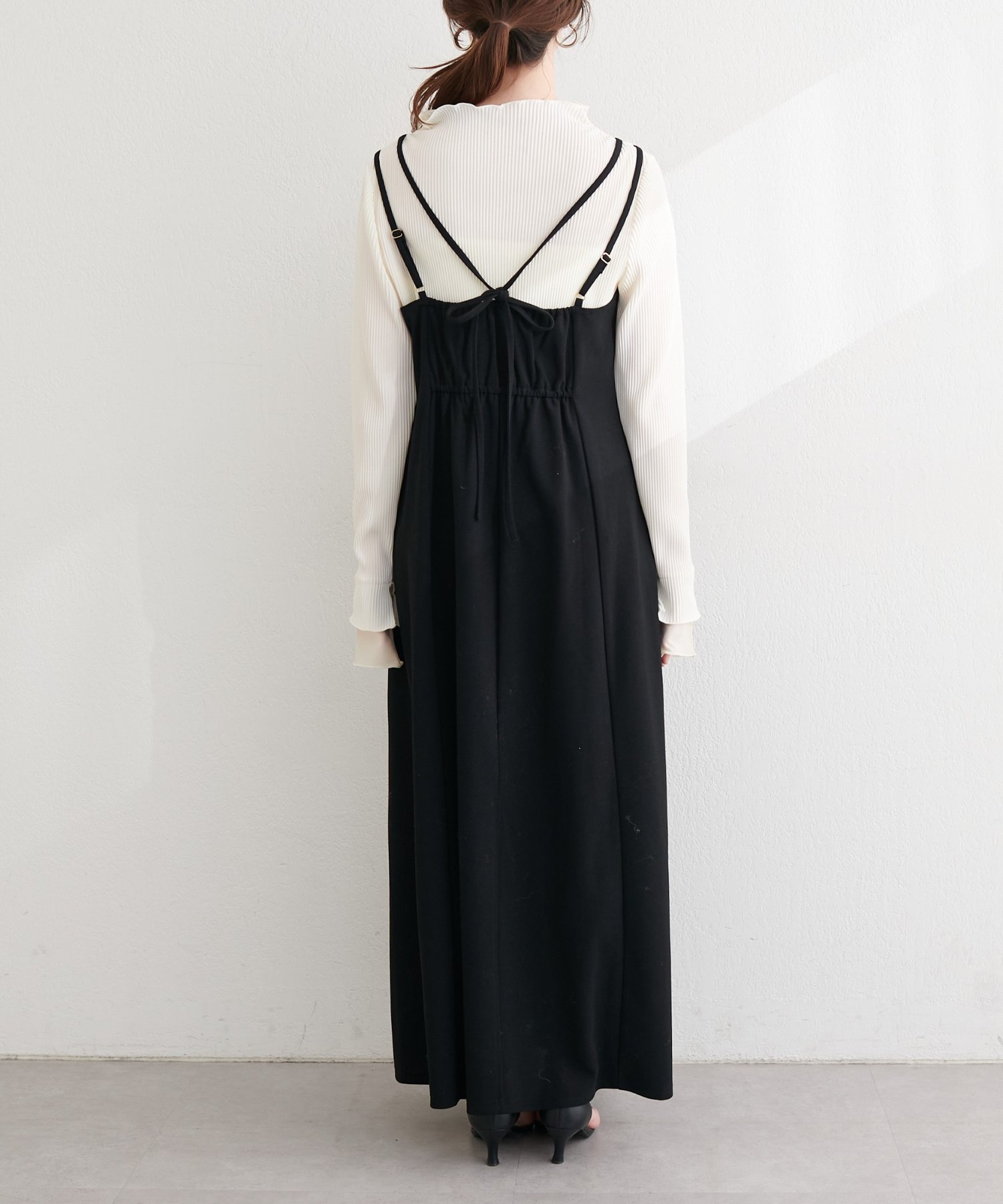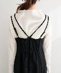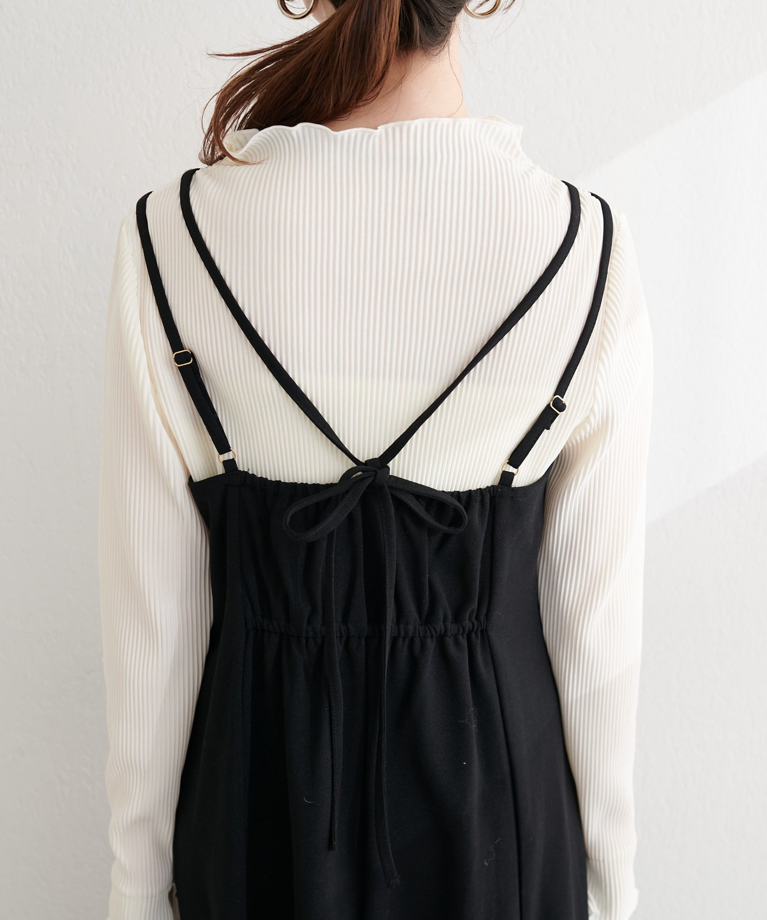 肩ヒモとリボンの2本使いで後ろ姿まで抜かりなく!アジャスターで着丈の調節もラクラクです。