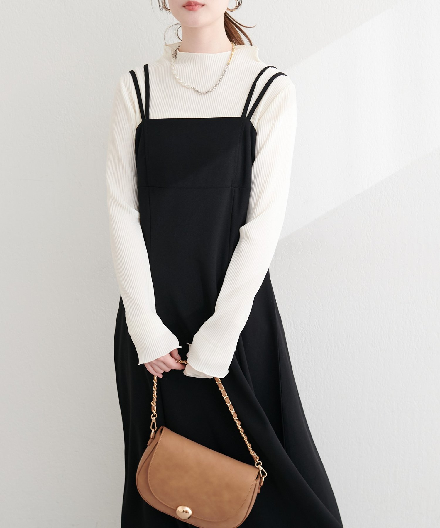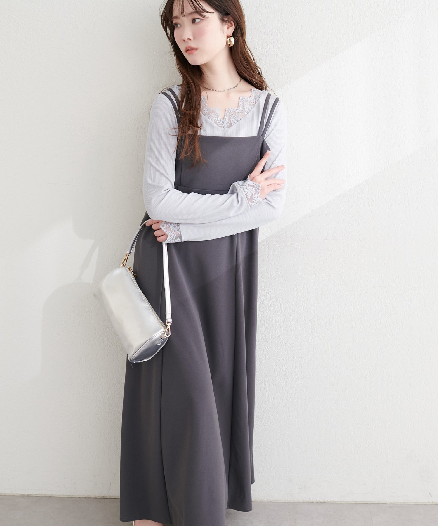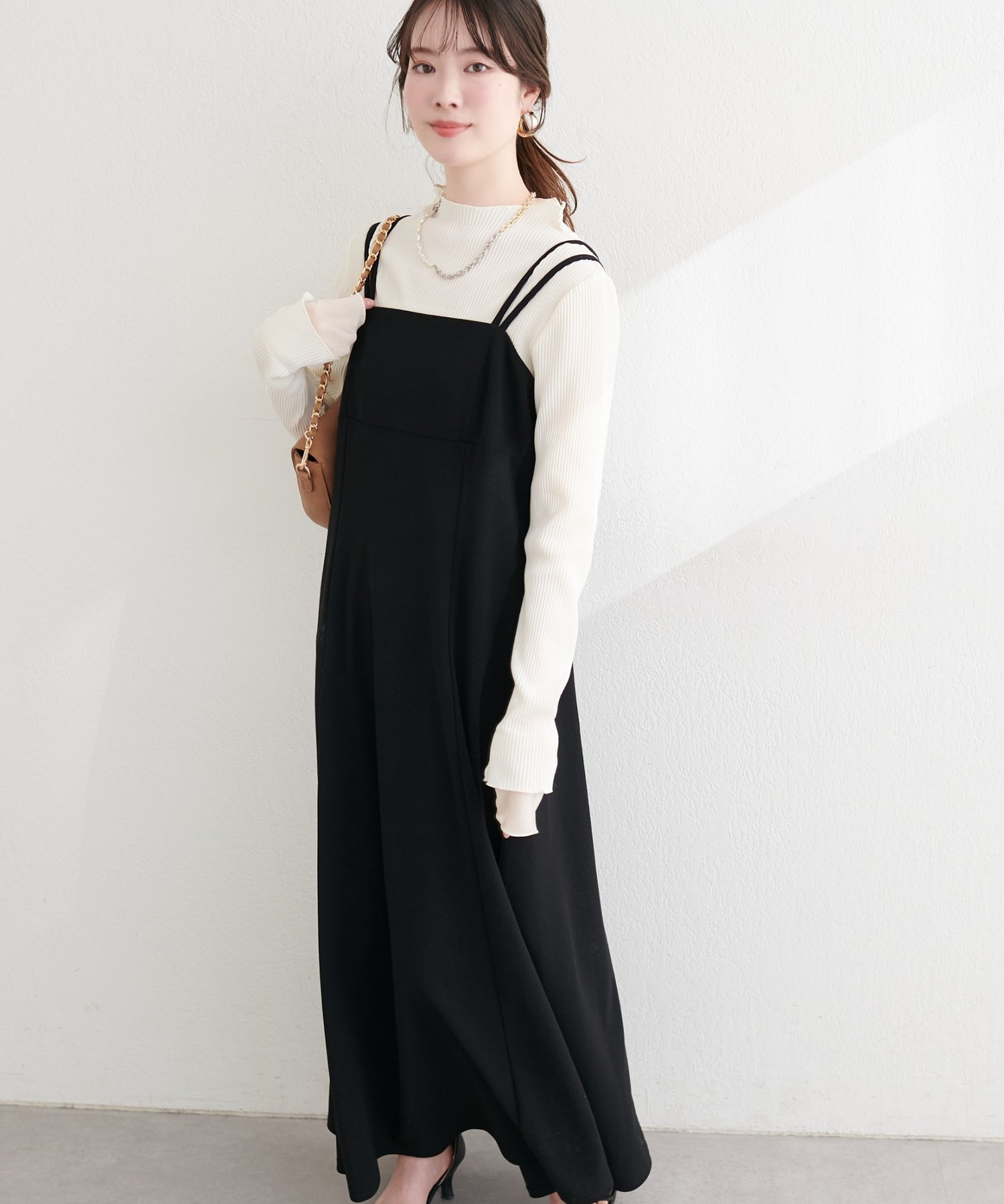 ニットなどをワンピの上に着て、レイヤードスタイルでも秋冬らしく決まります。