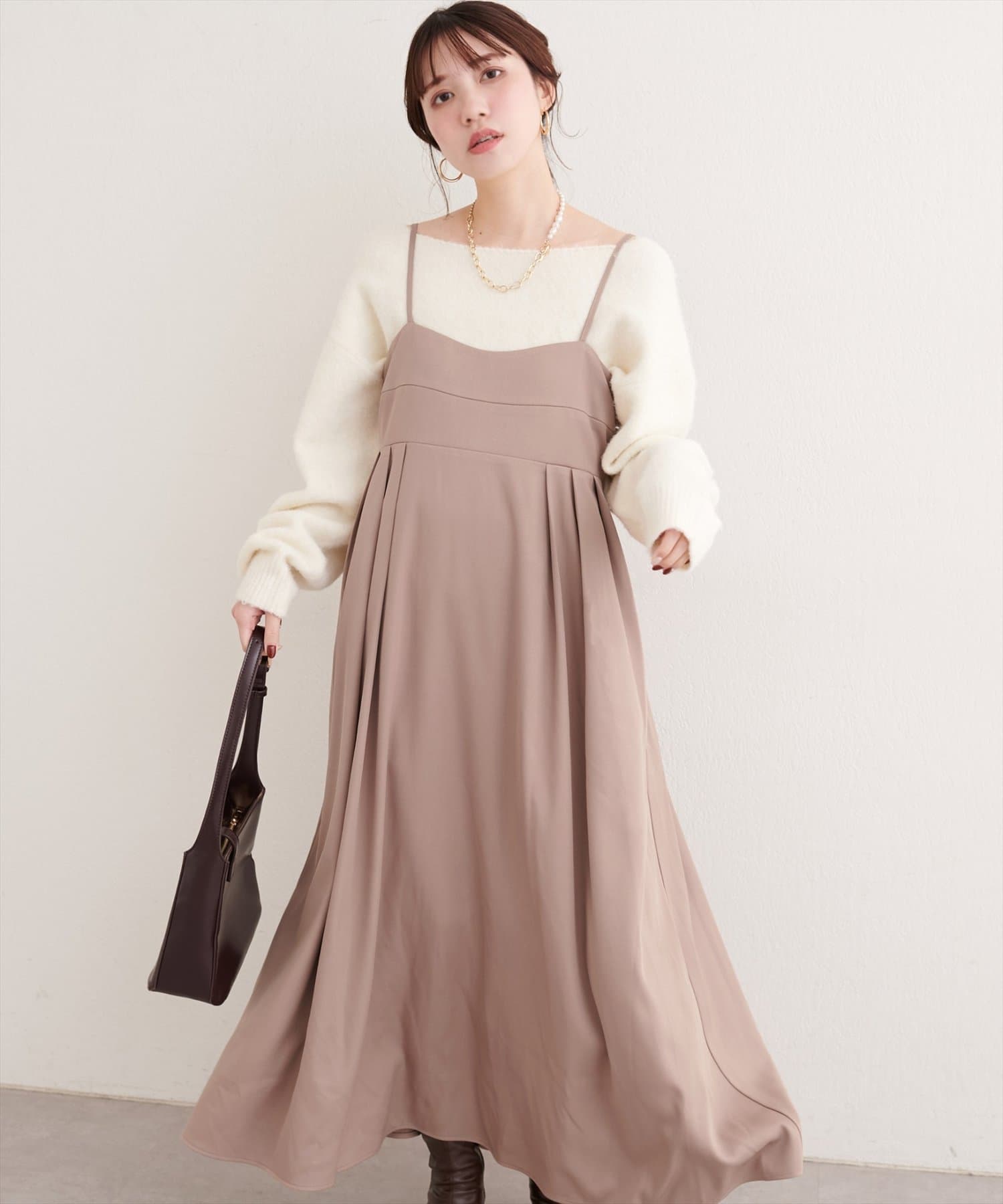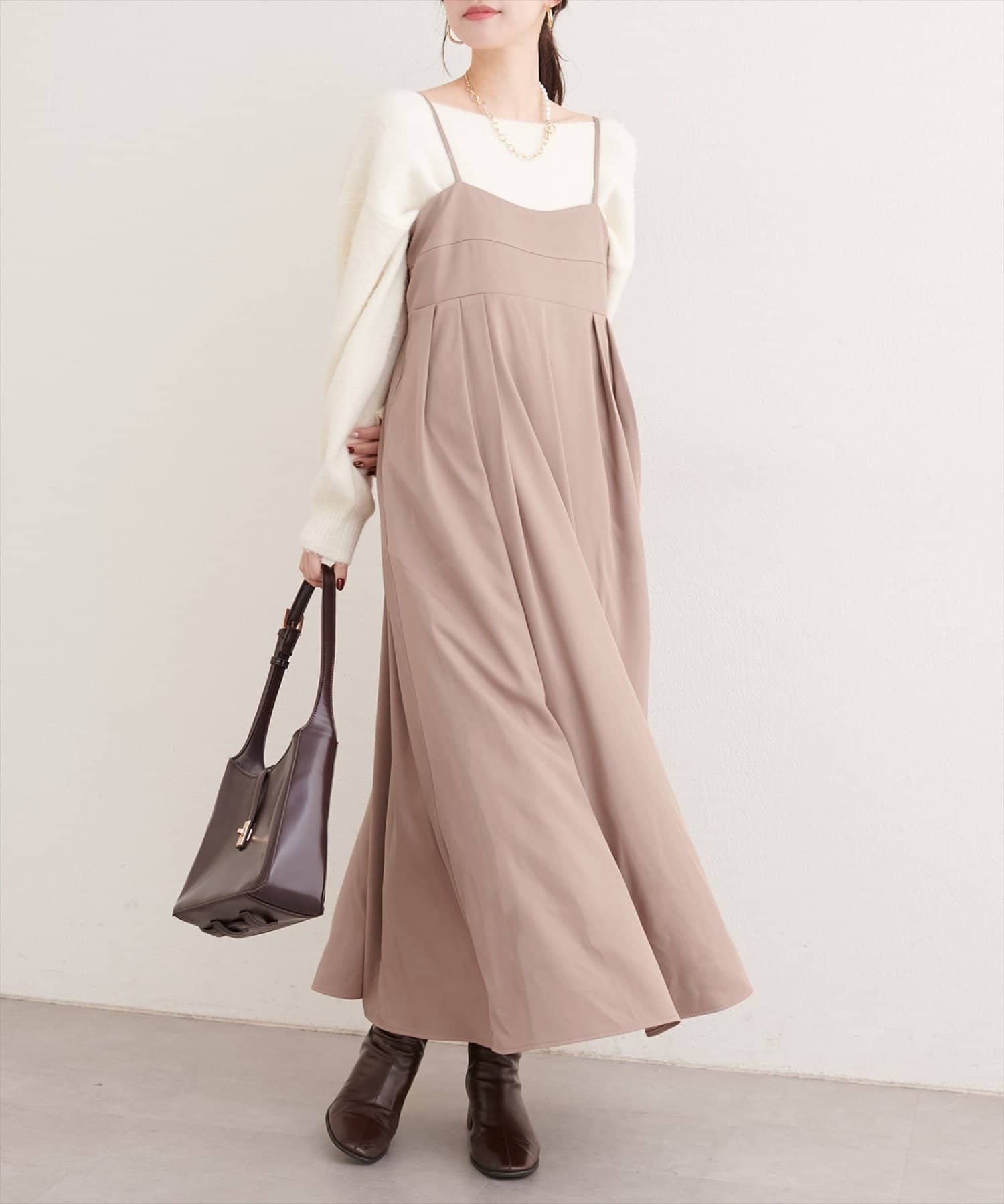 胸元から裾にかけて施されたタックが、美しいドレープを生み出し、優雅なシルエットを演出。