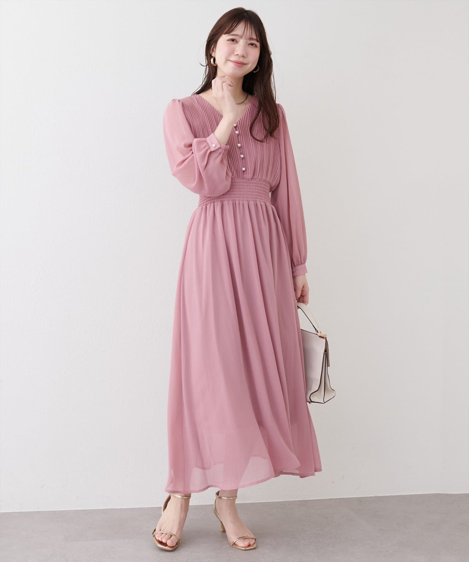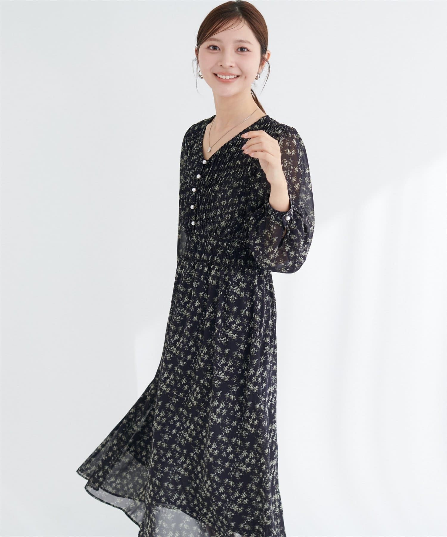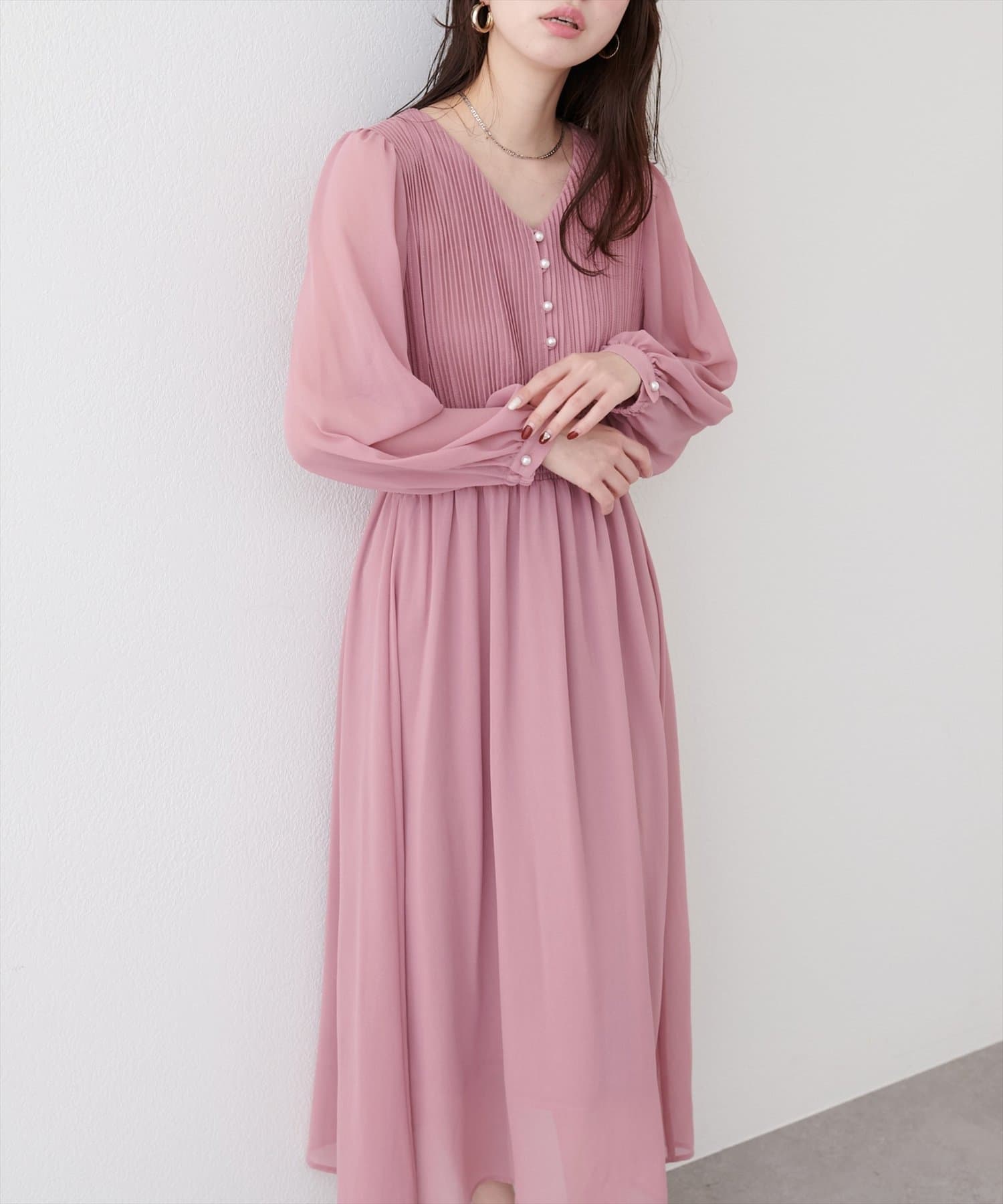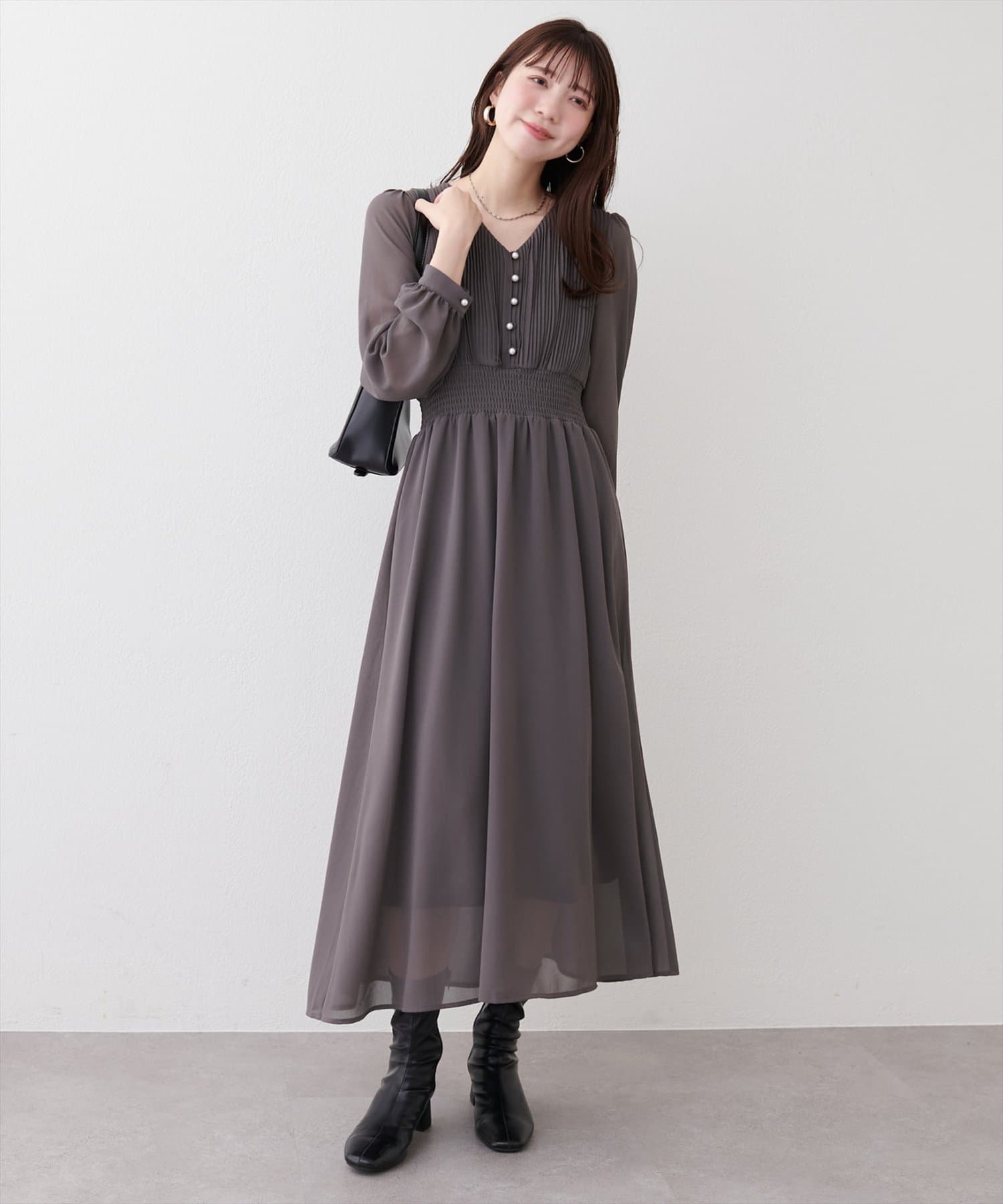 パール釦をあしらった女性らしいデザインのワンピースです。
