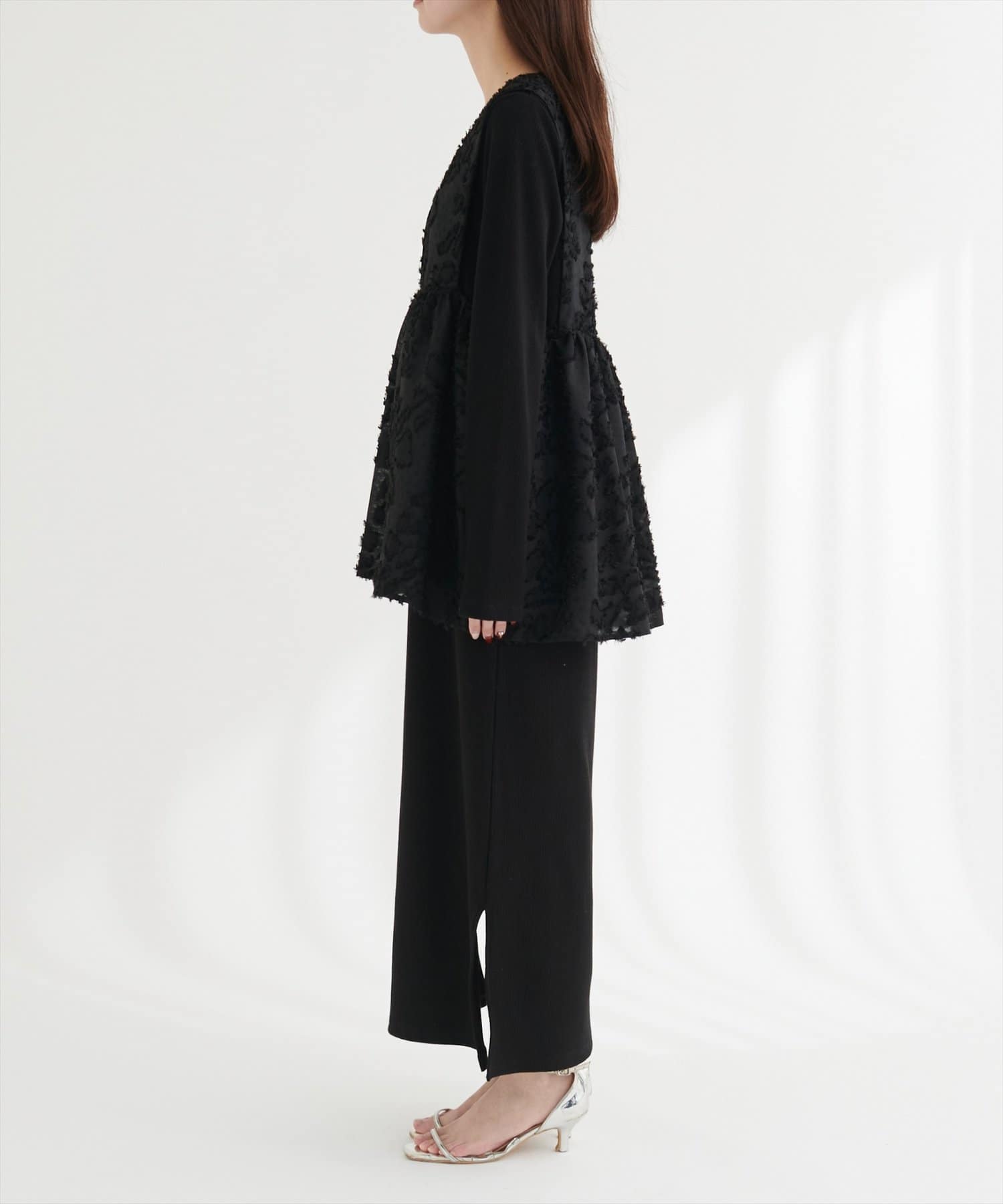 立体的で奥行きのある花柄ベストが、シンプルなスタイリングに華やかさをプラスします。