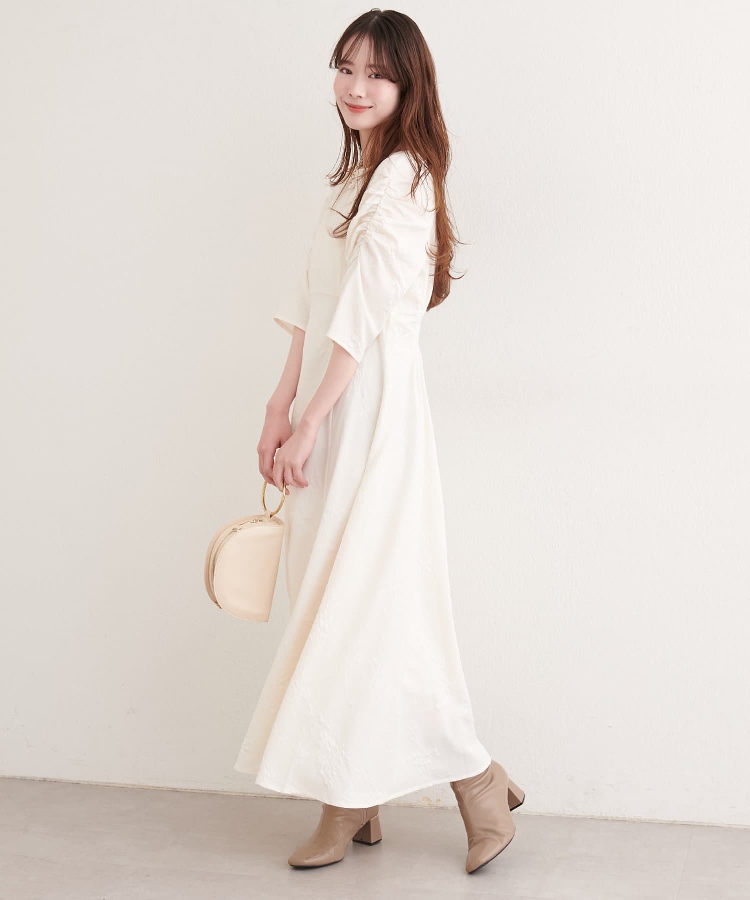 目を引くジゴスリーブは、肩から袖にかけてふんわりとしたボリュームを持たせ、ロマンティックな雰囲気をプラス。