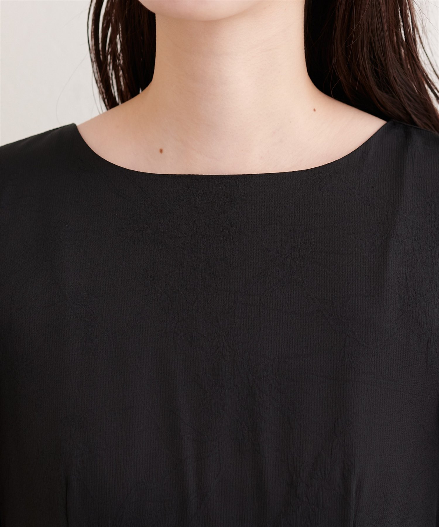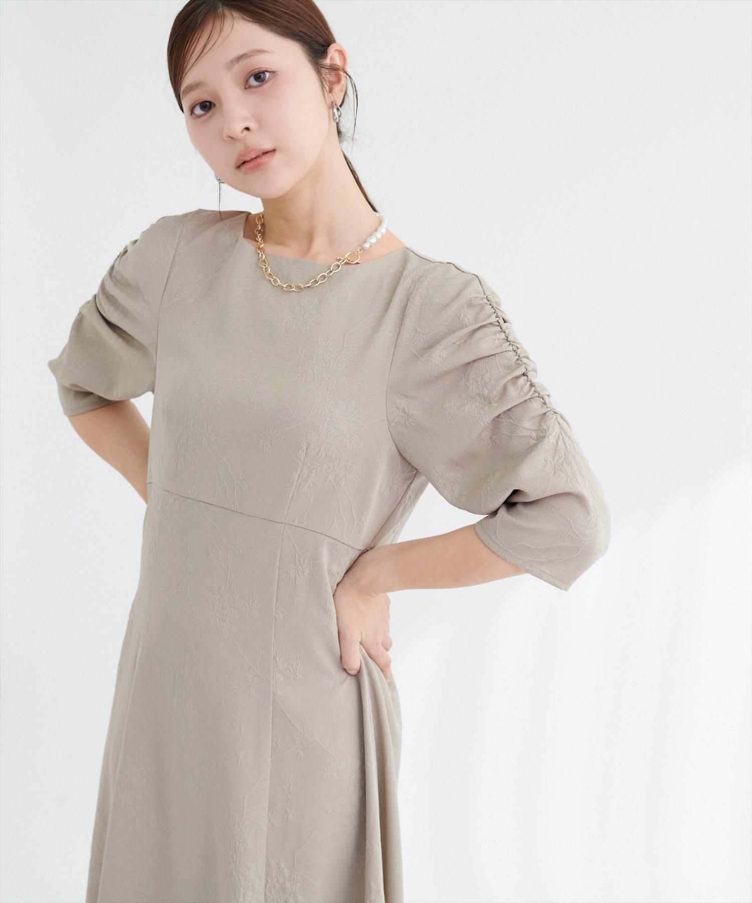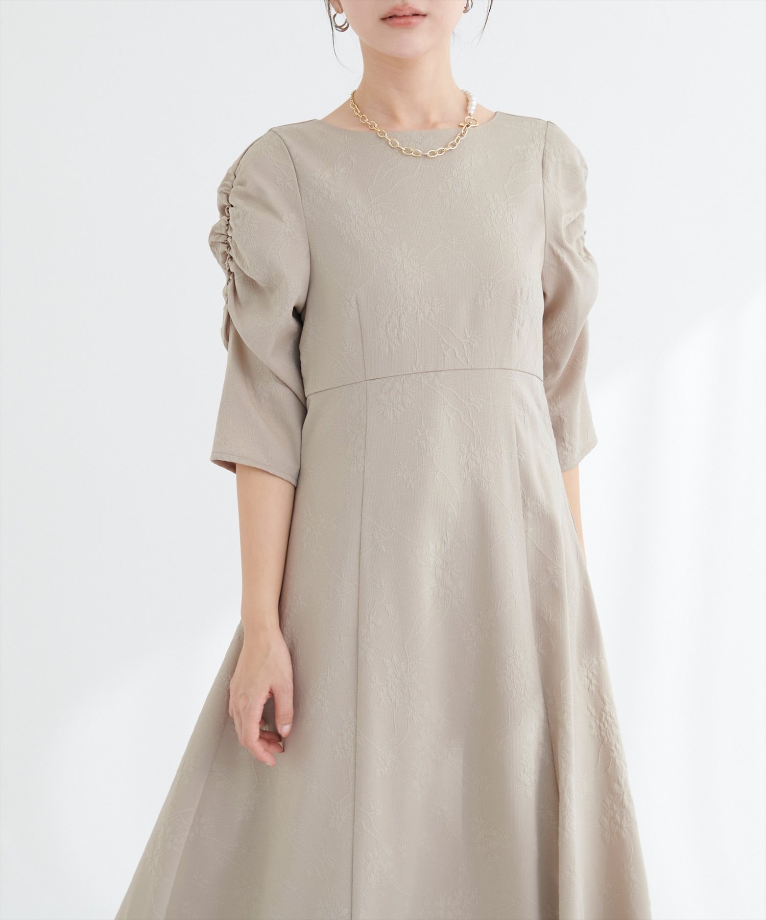 生地全体に施されたフラワージャガードは、主張しすぎない、繊細な花柄なので、大人の女性にもぴったり。