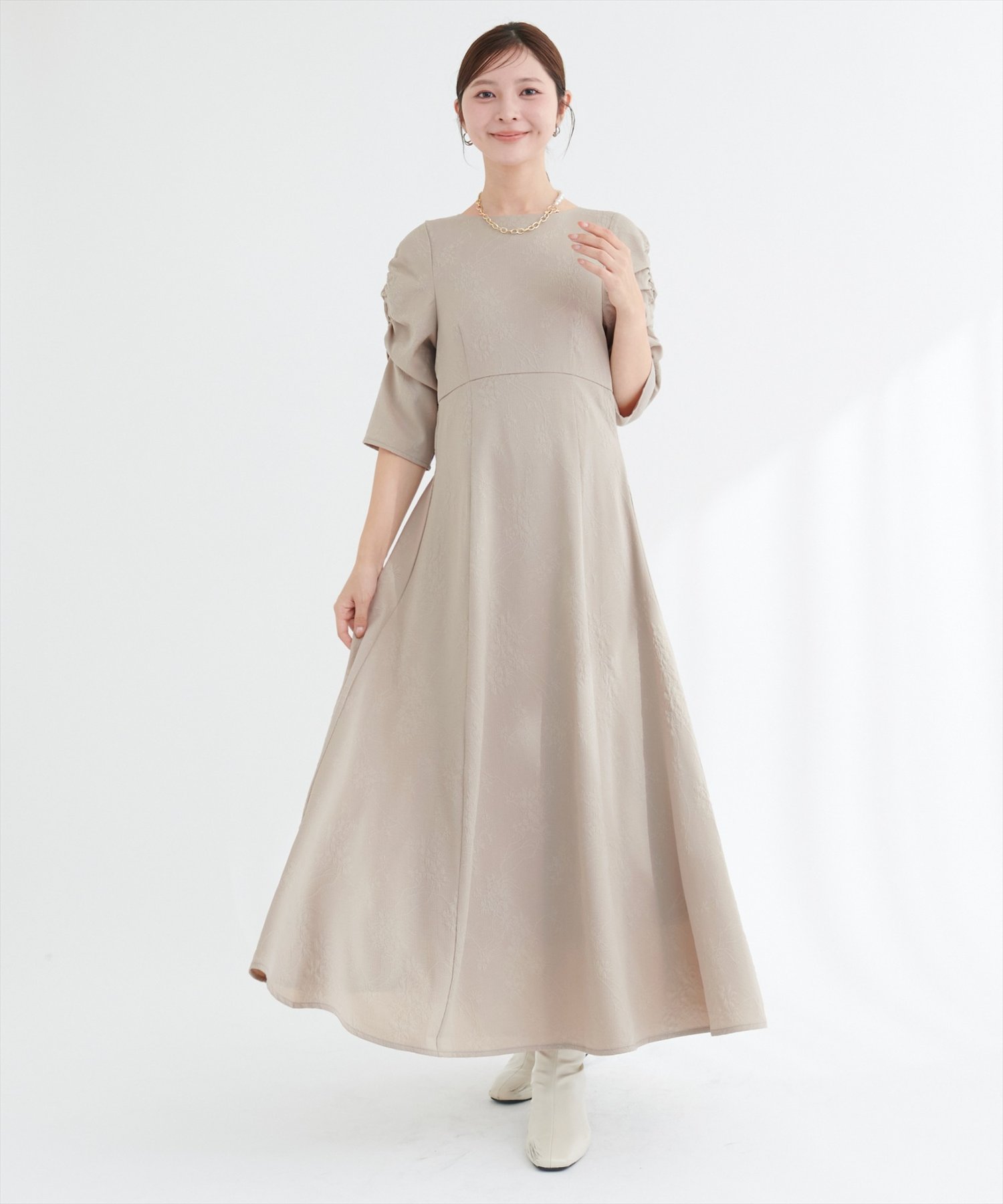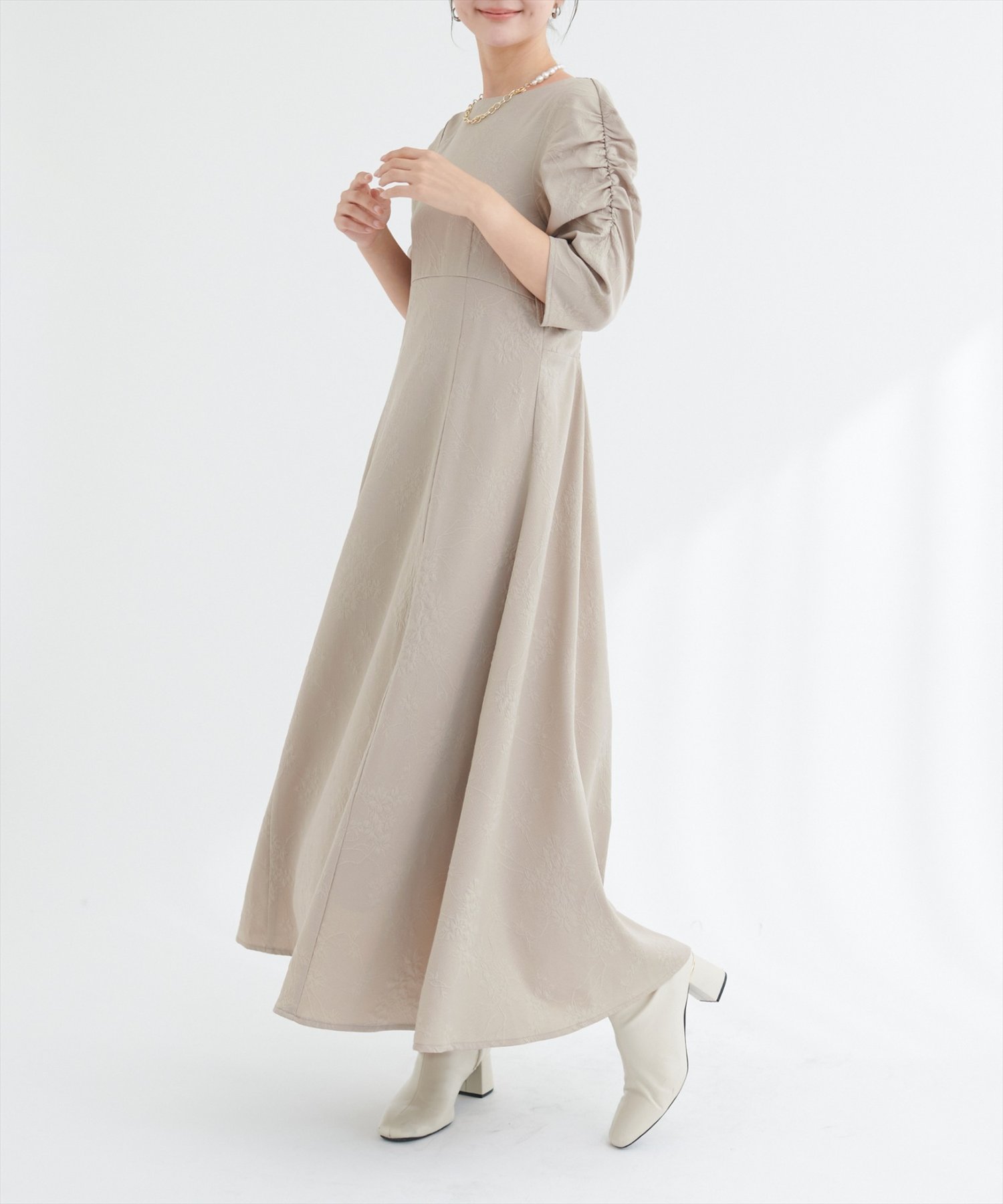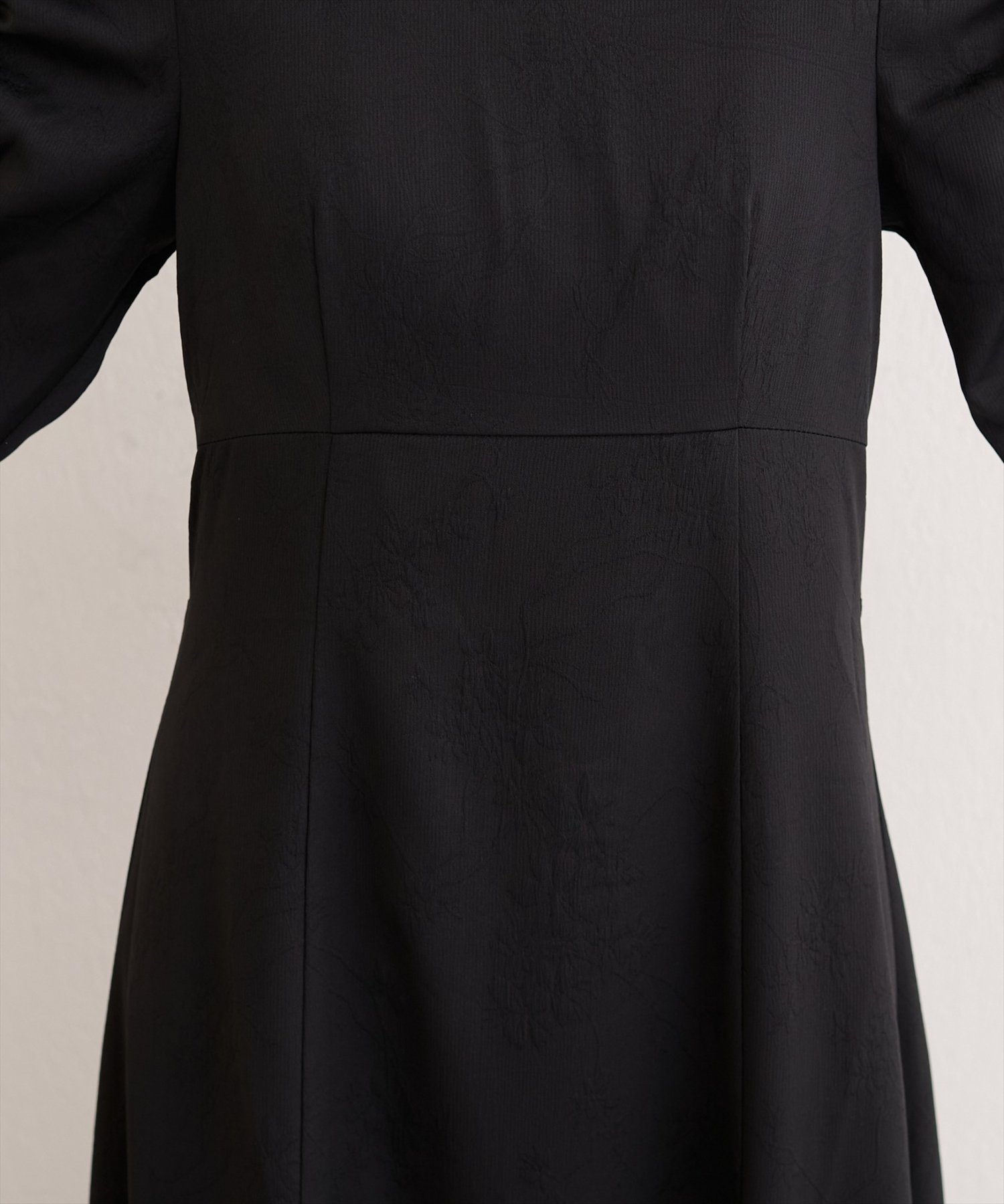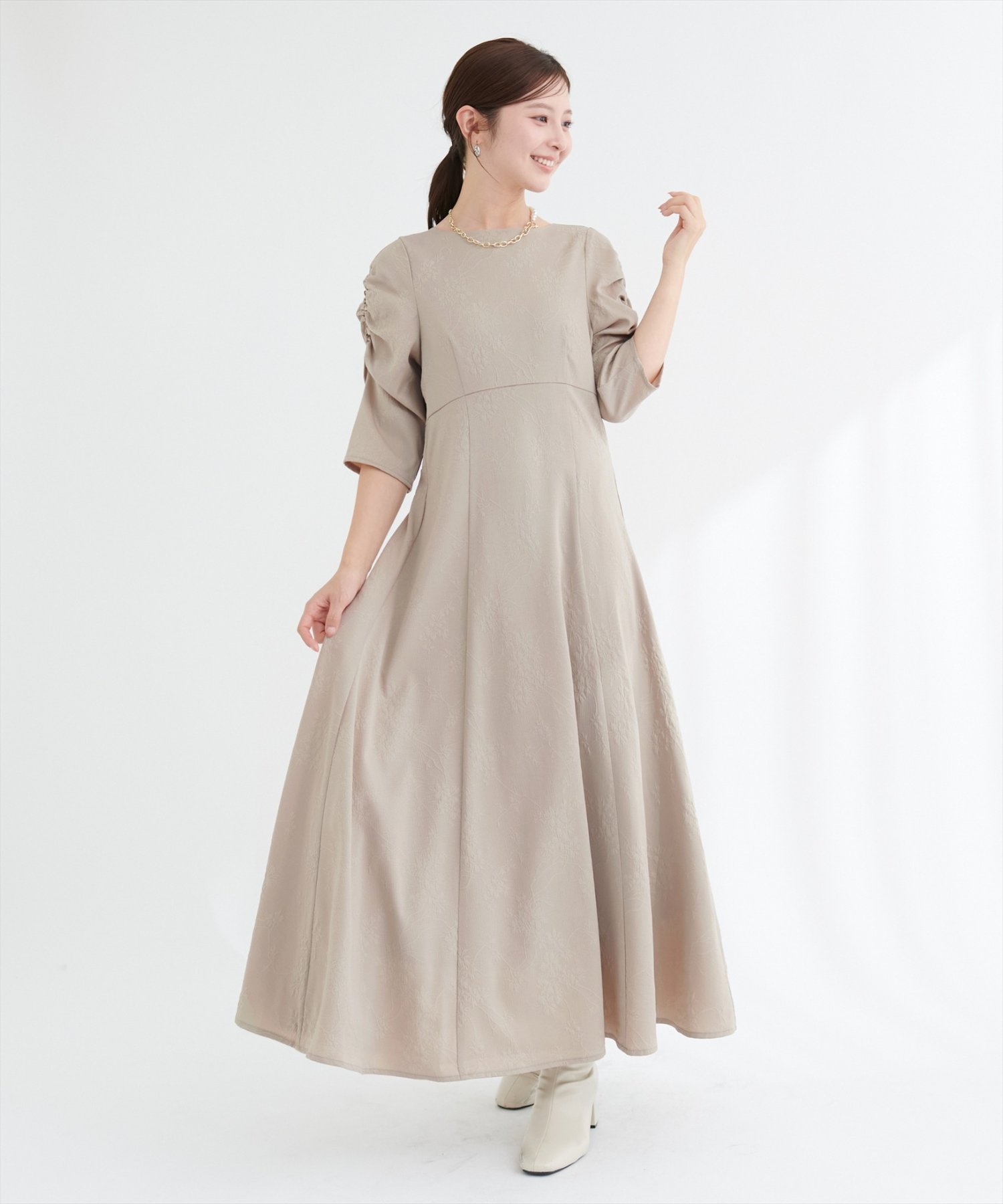 生地全体に施されたフラワージャガードは、主張しすぎない、繊細な花柄なので、大人の女性にもぴったり。