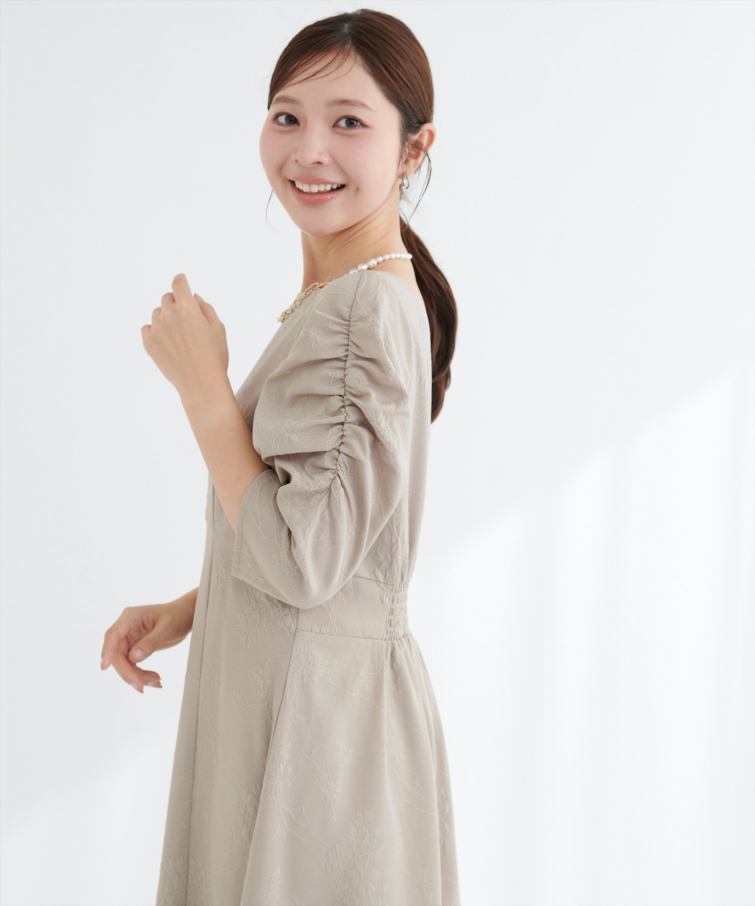 女性らしい印象を与える美しいAライン寄りのシルエットが印象のワンピース。