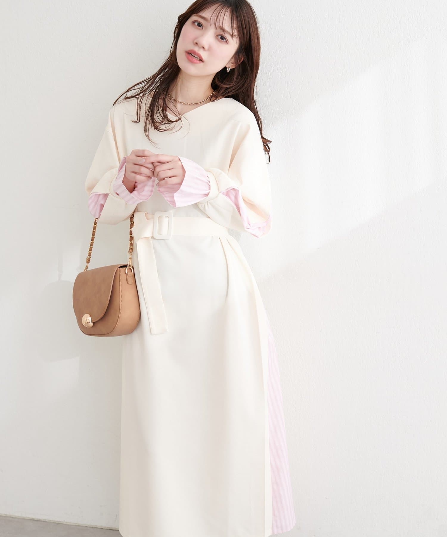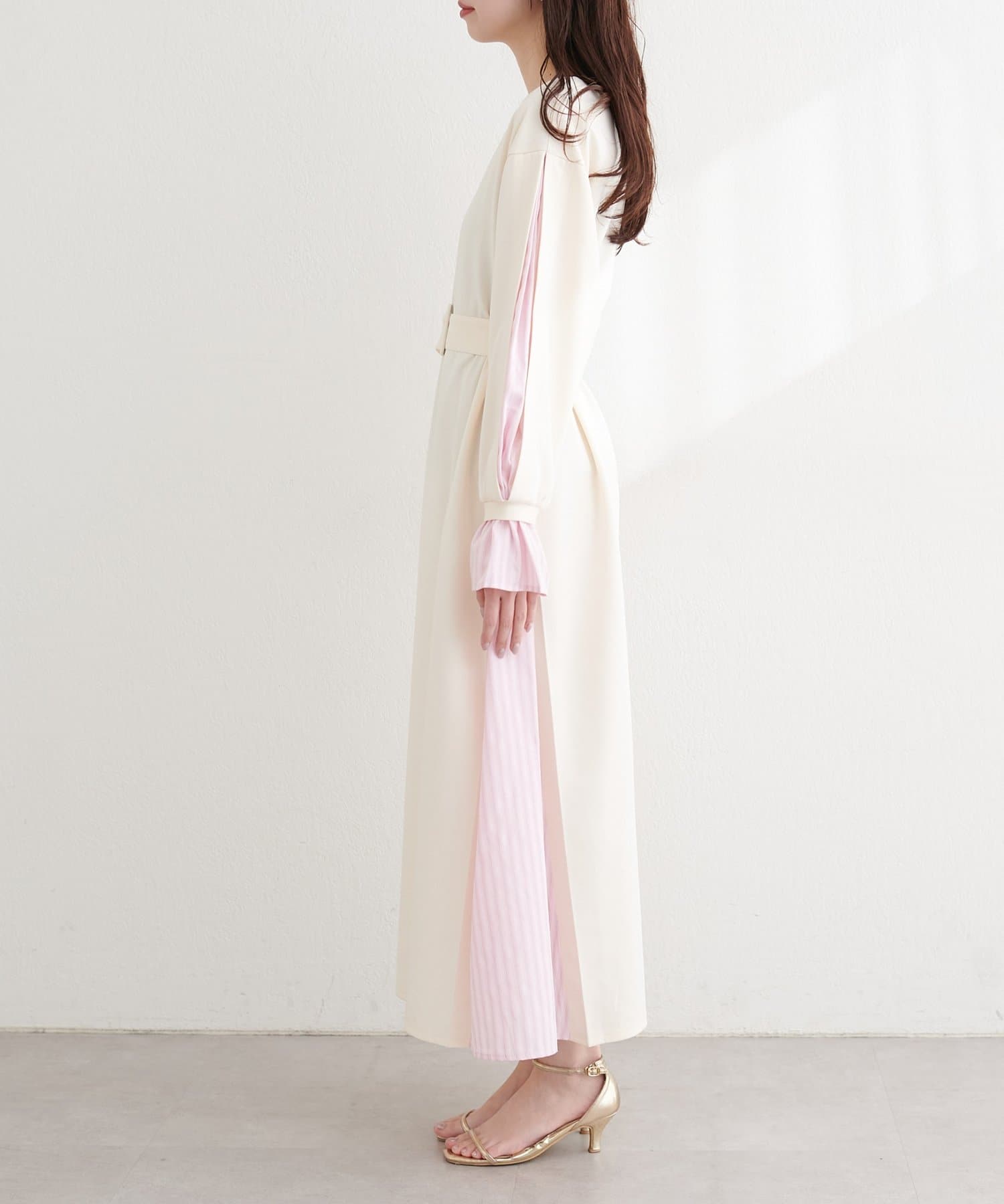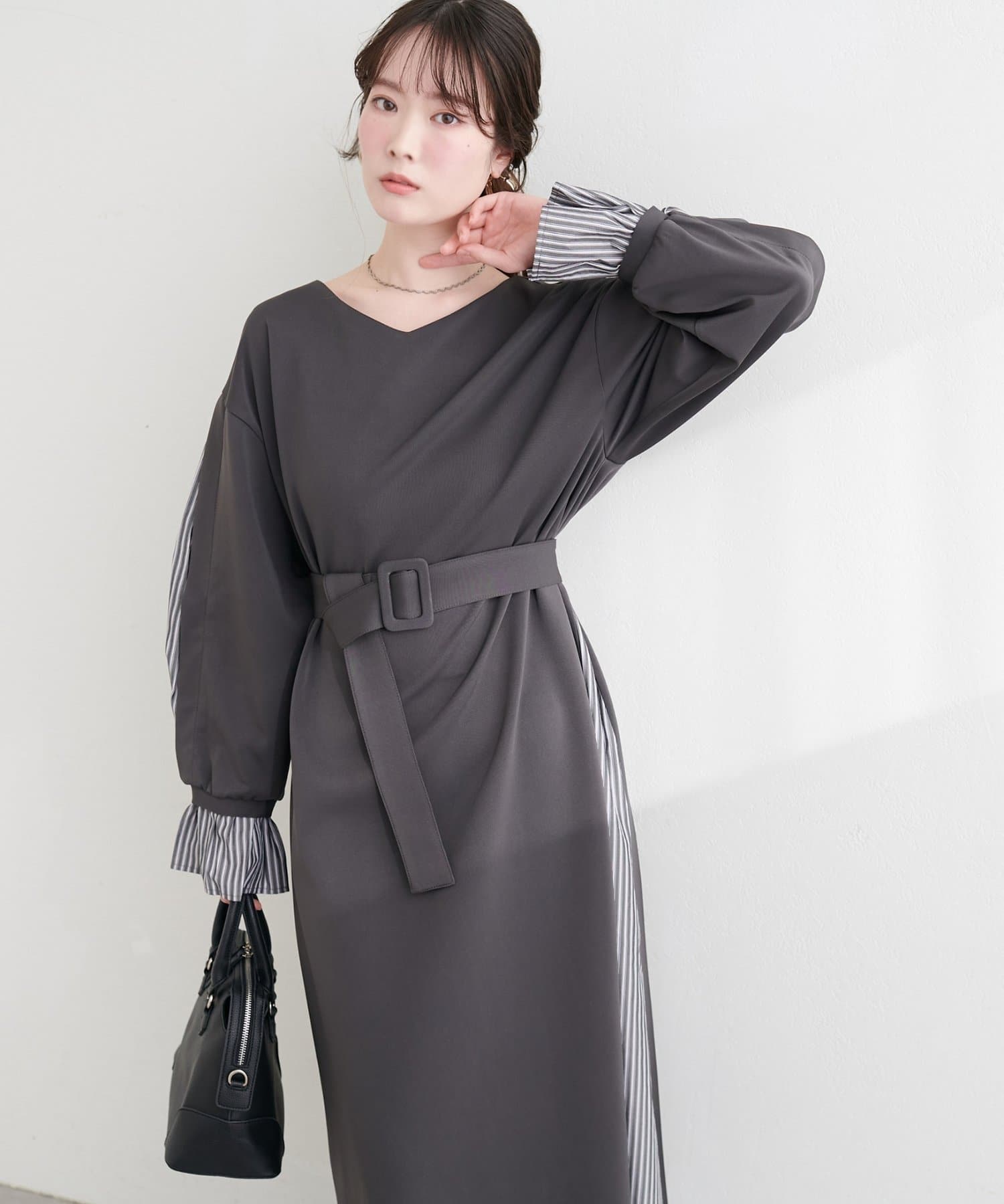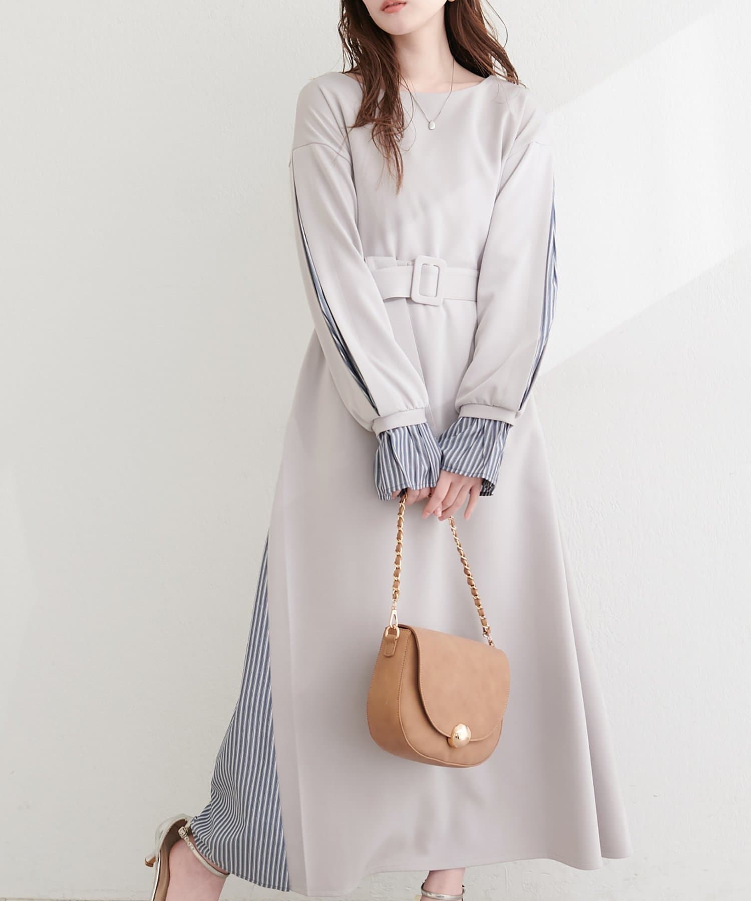 付属のベルトでウエストマークすれば、メリハリが効き、より女性らしいシルエットに。
