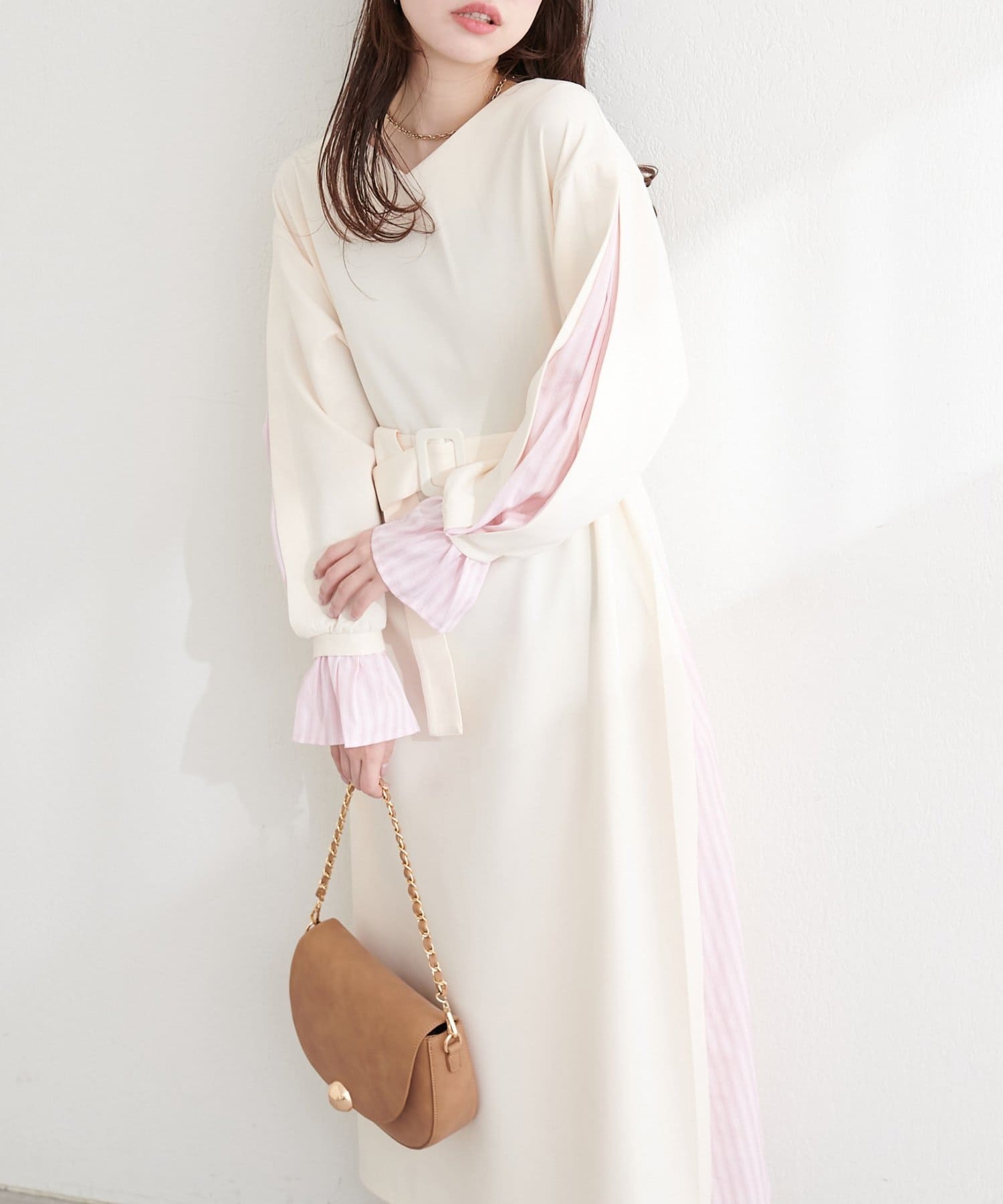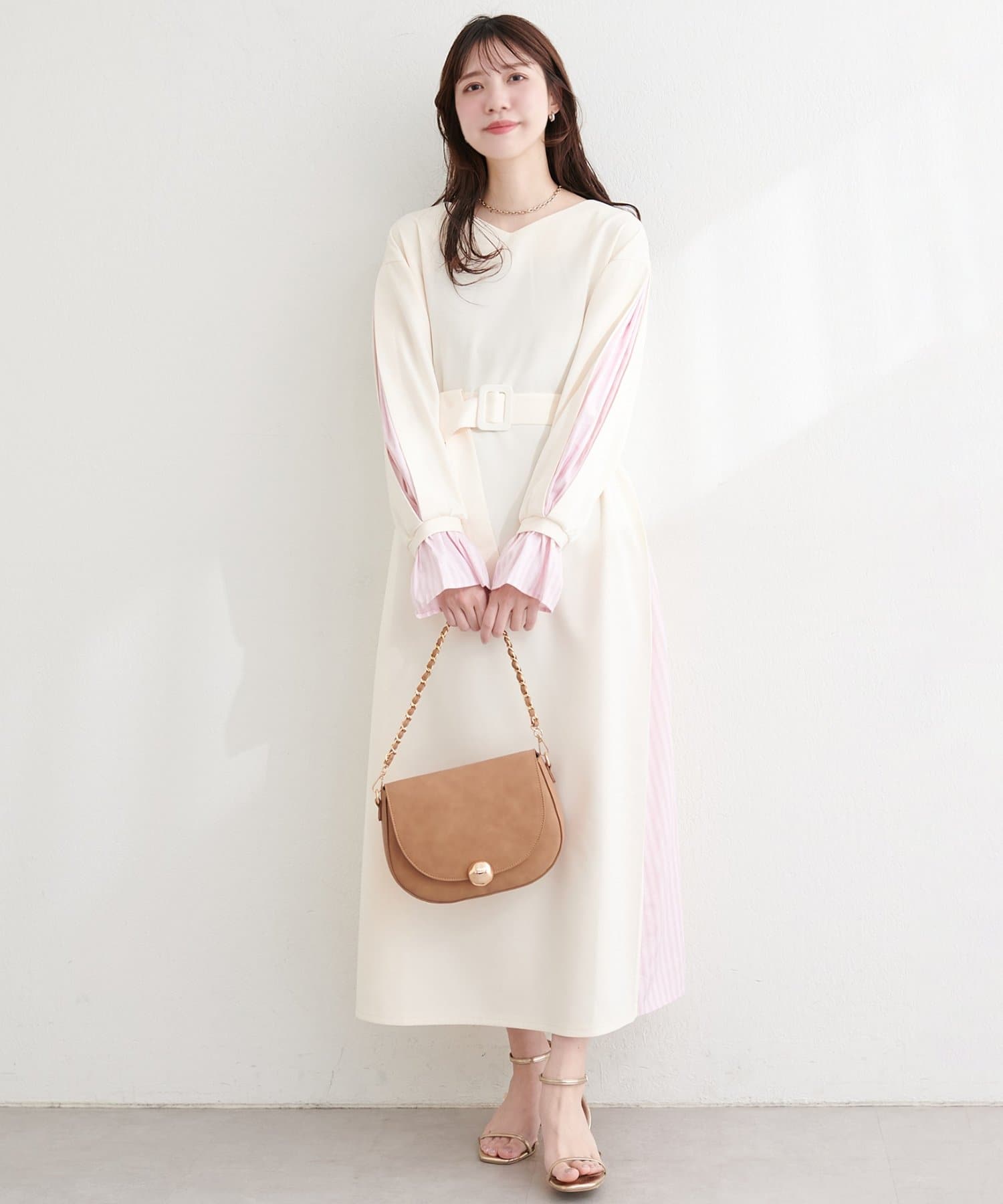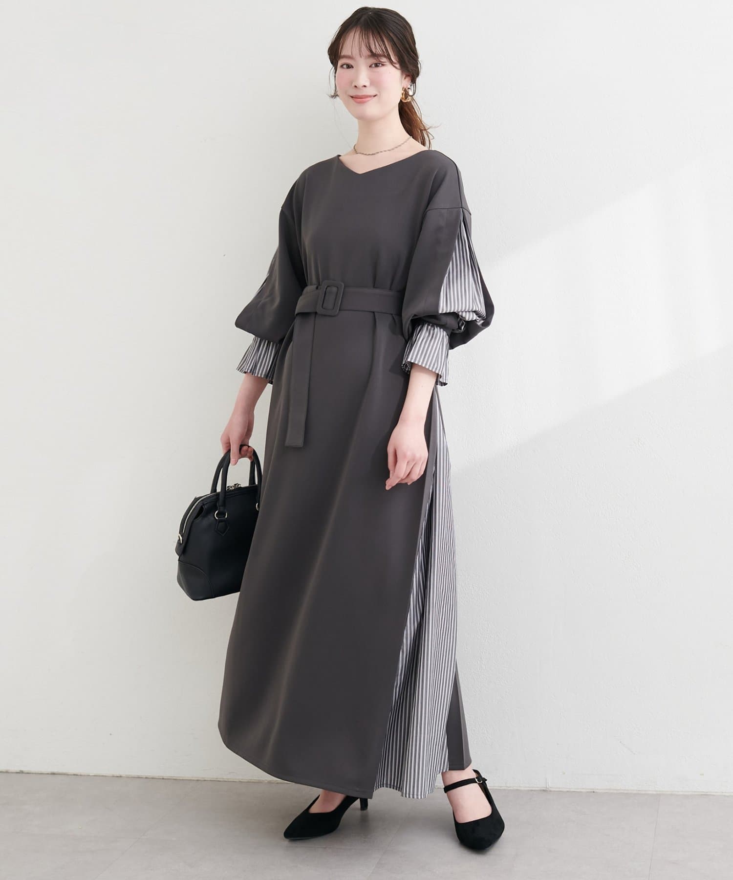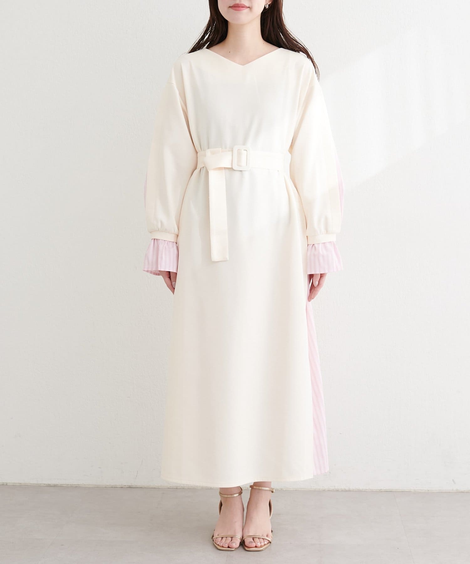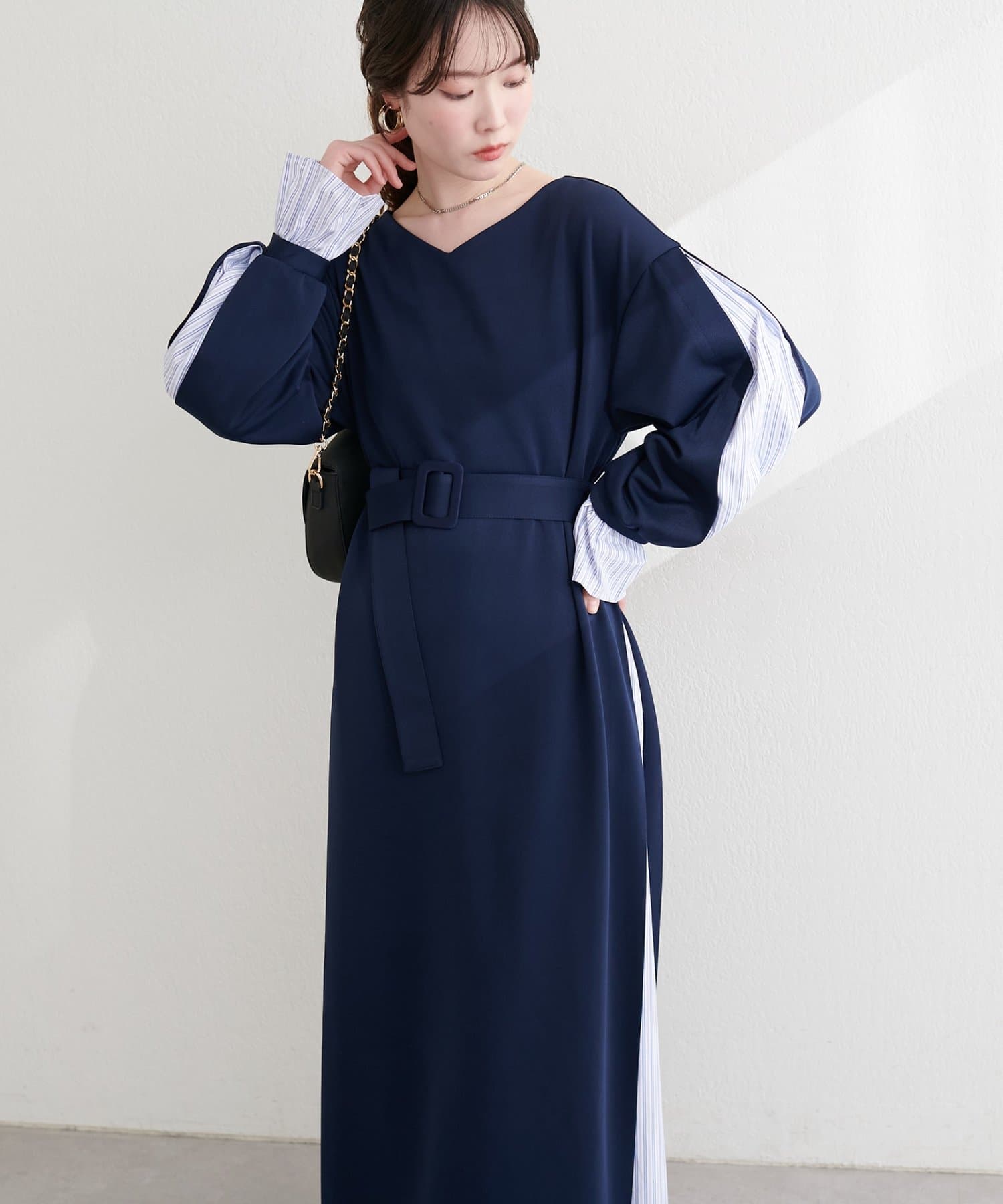 付属のベルトでウエストマークすれば、メリハリが効き、より女性らしいシルエットに。
