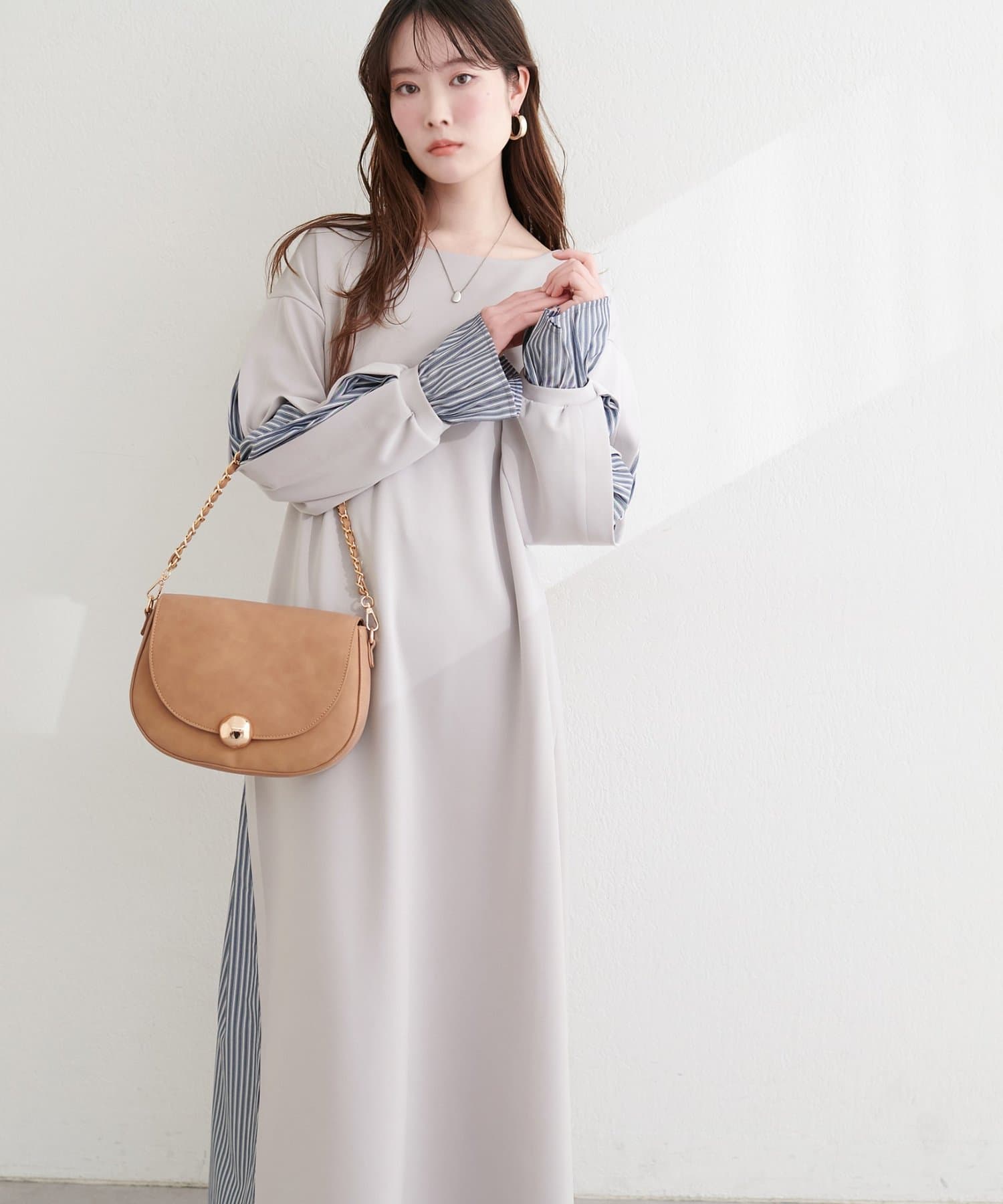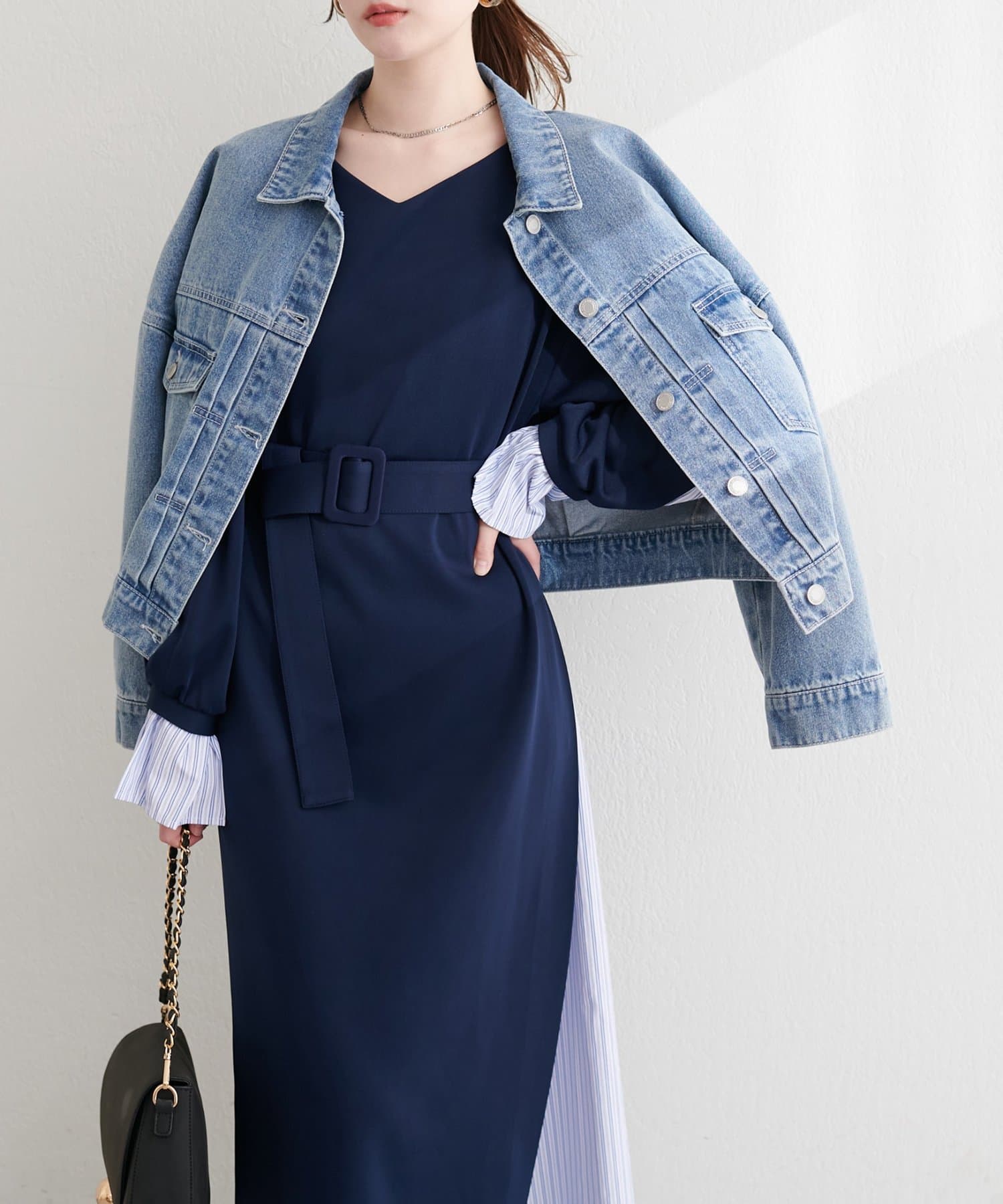 ネックレスやベルトでウエストマークをし、視線を上に上げることでスタイルアップ効果を狙う着こなしもおすすめです。