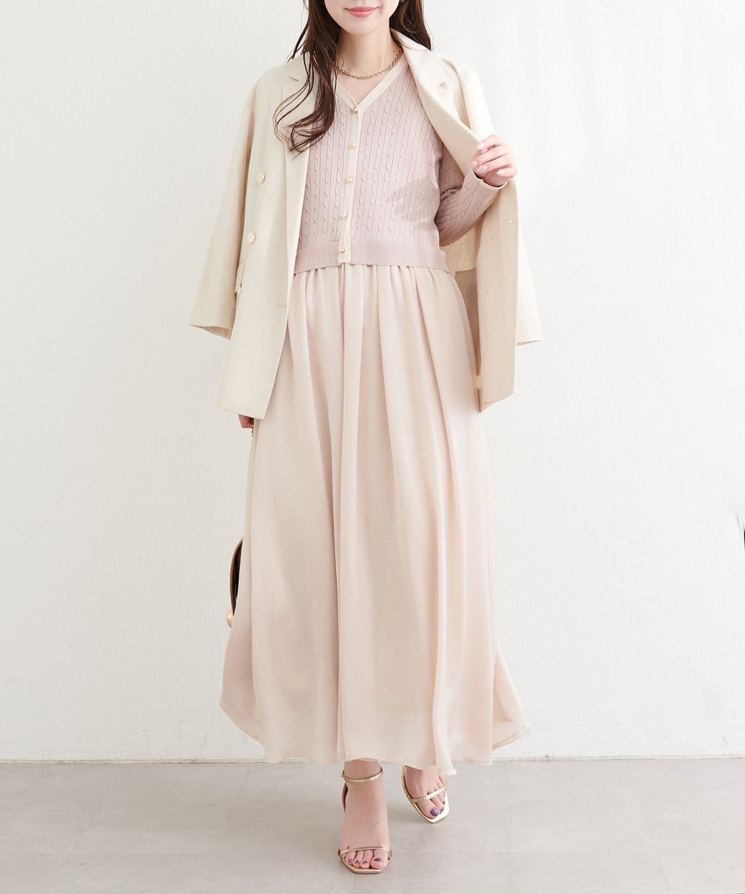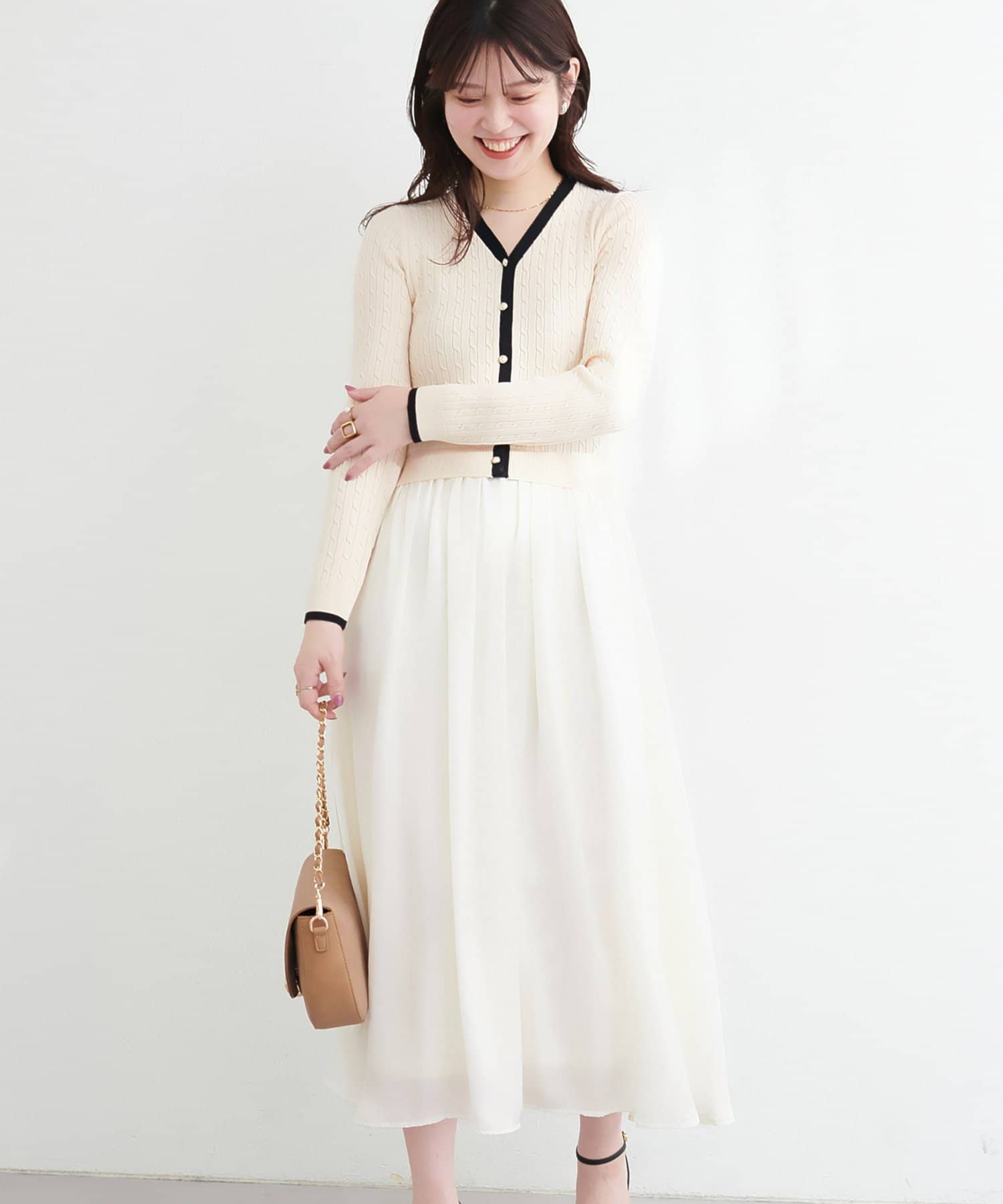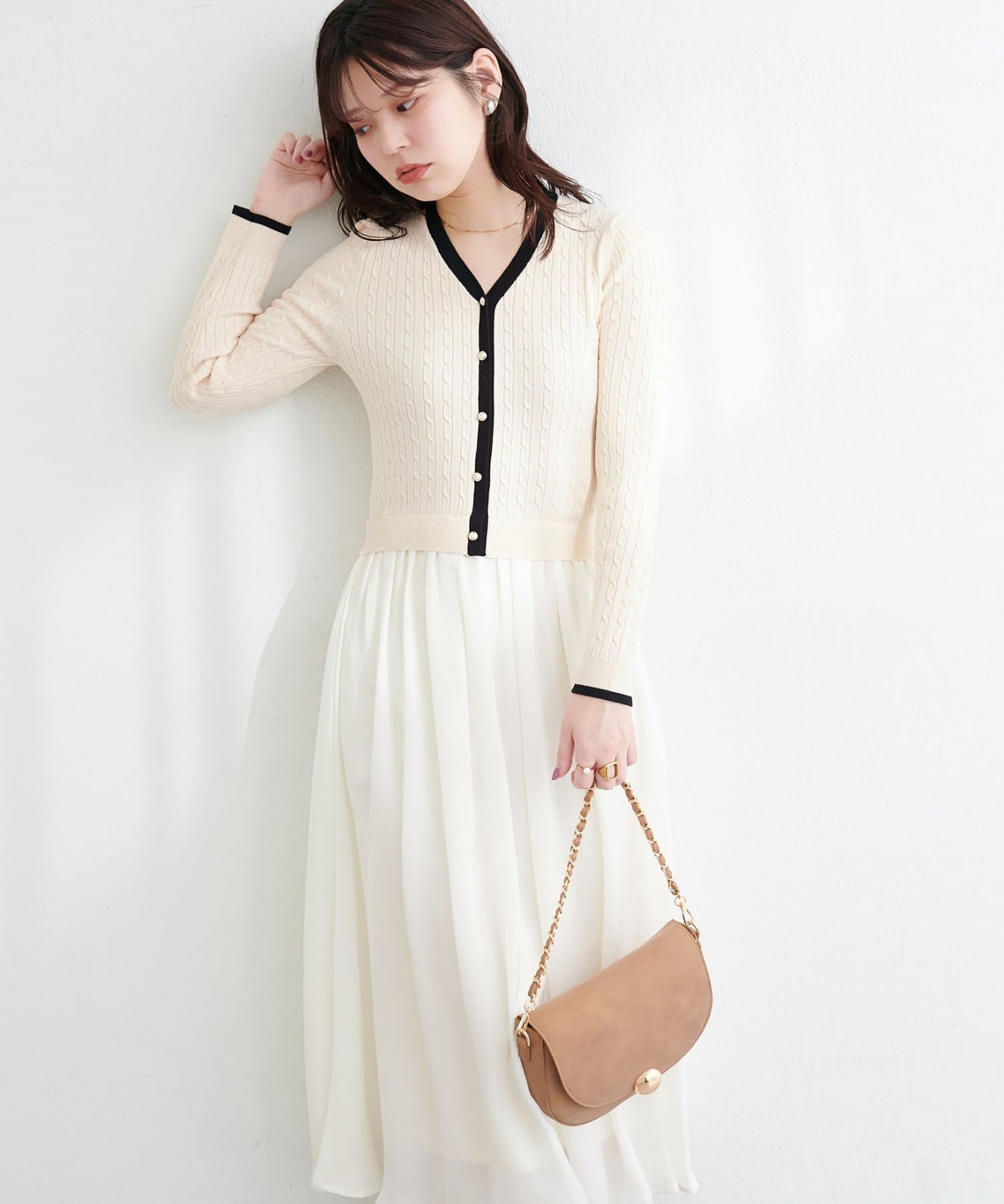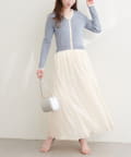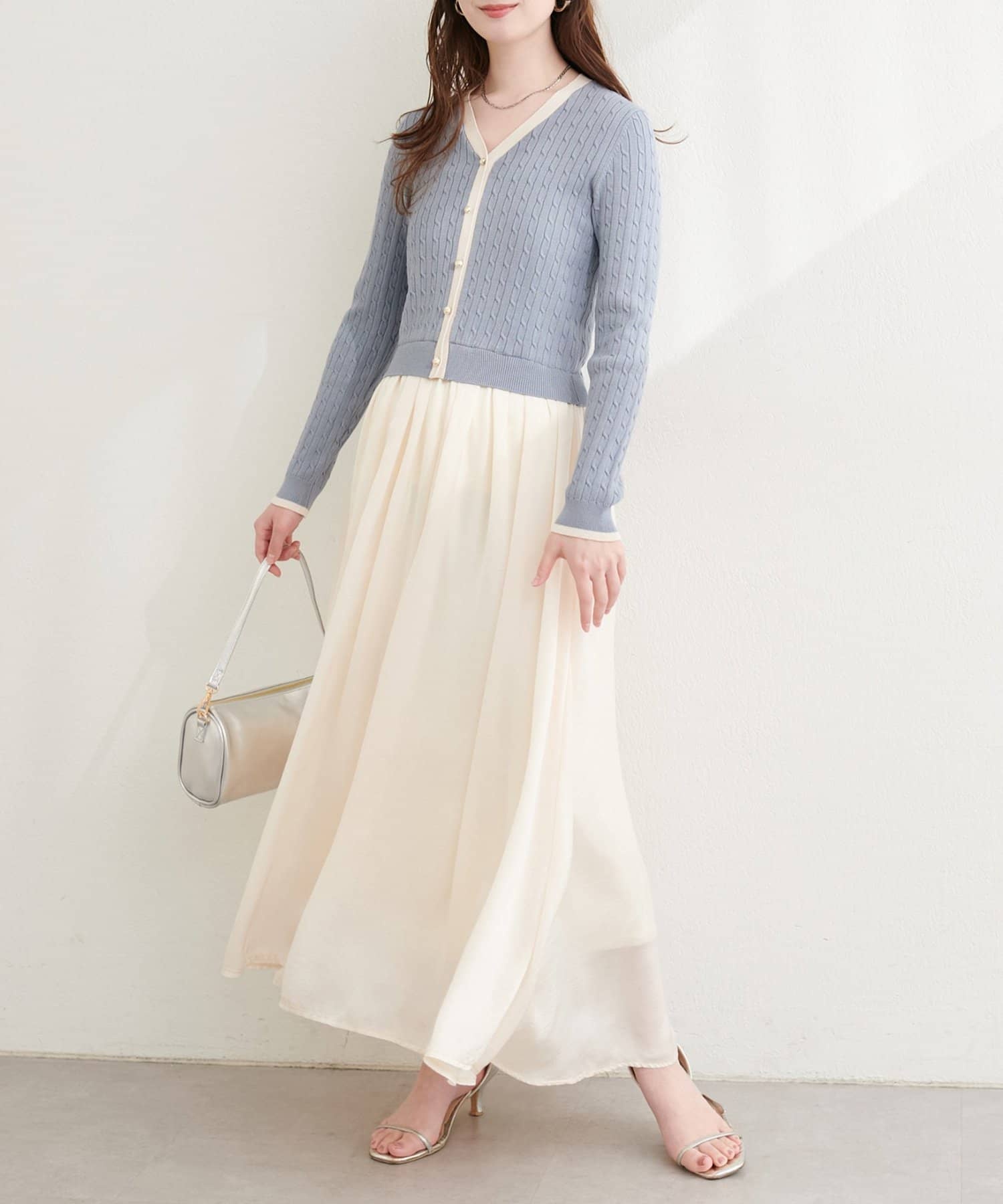 軽やかなサテンと優しいニットの組み合わせがポイントのワンピース。