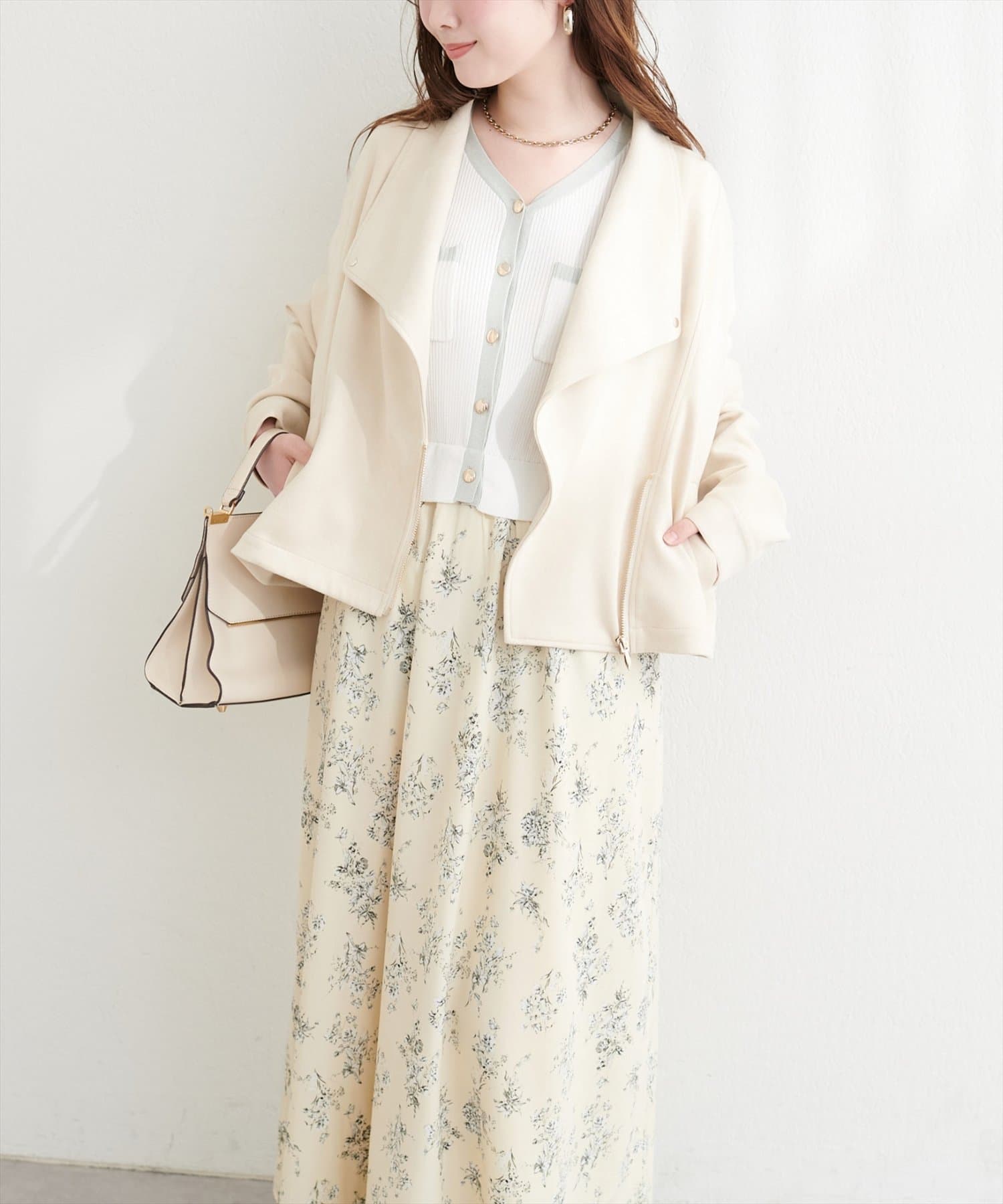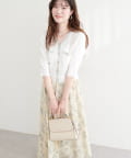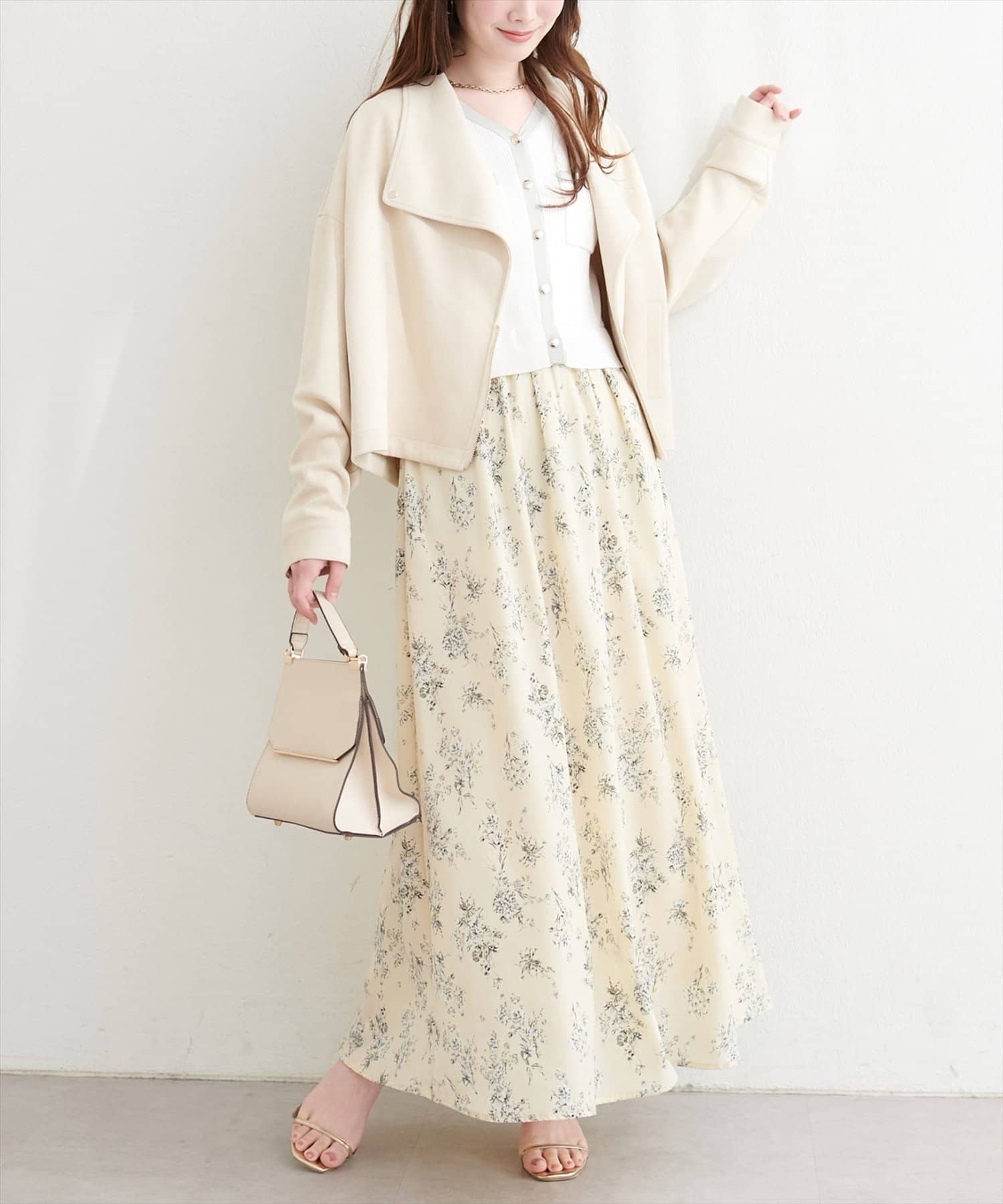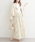 デニムジャケットをさっと羽織った、程よく力の抜けたカジュアルスタイルなら、フェミニンな花柄スカートとのバランスで、ラフになりすぎず大人可愛い印象に。