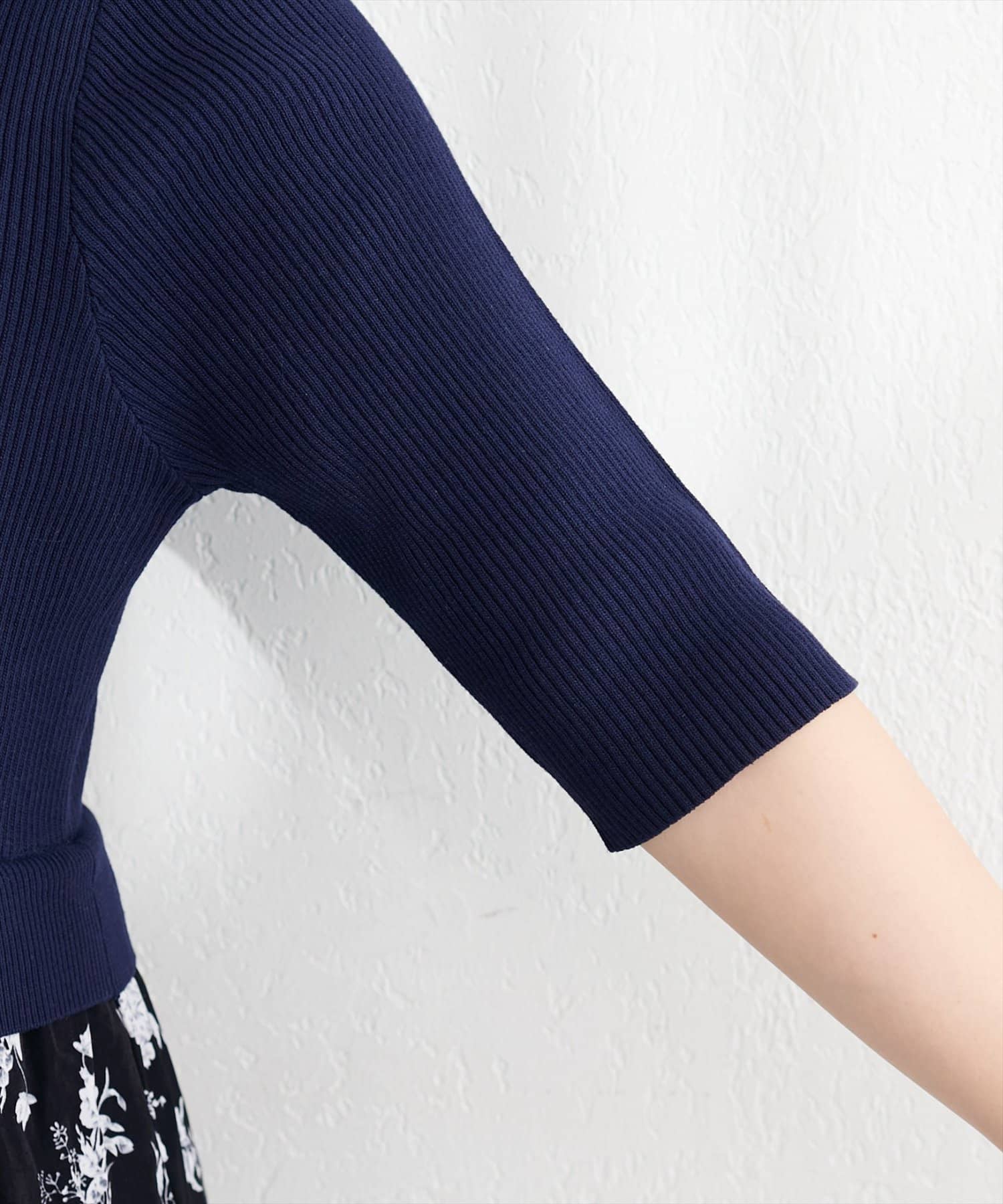 半袖リブニットは、アームホールをやや下げることで肩まわりから二の腕のラインを拾いにくく、すっきりとした印象に。さりげない工夫で、気になる部分を自然にカバーします。