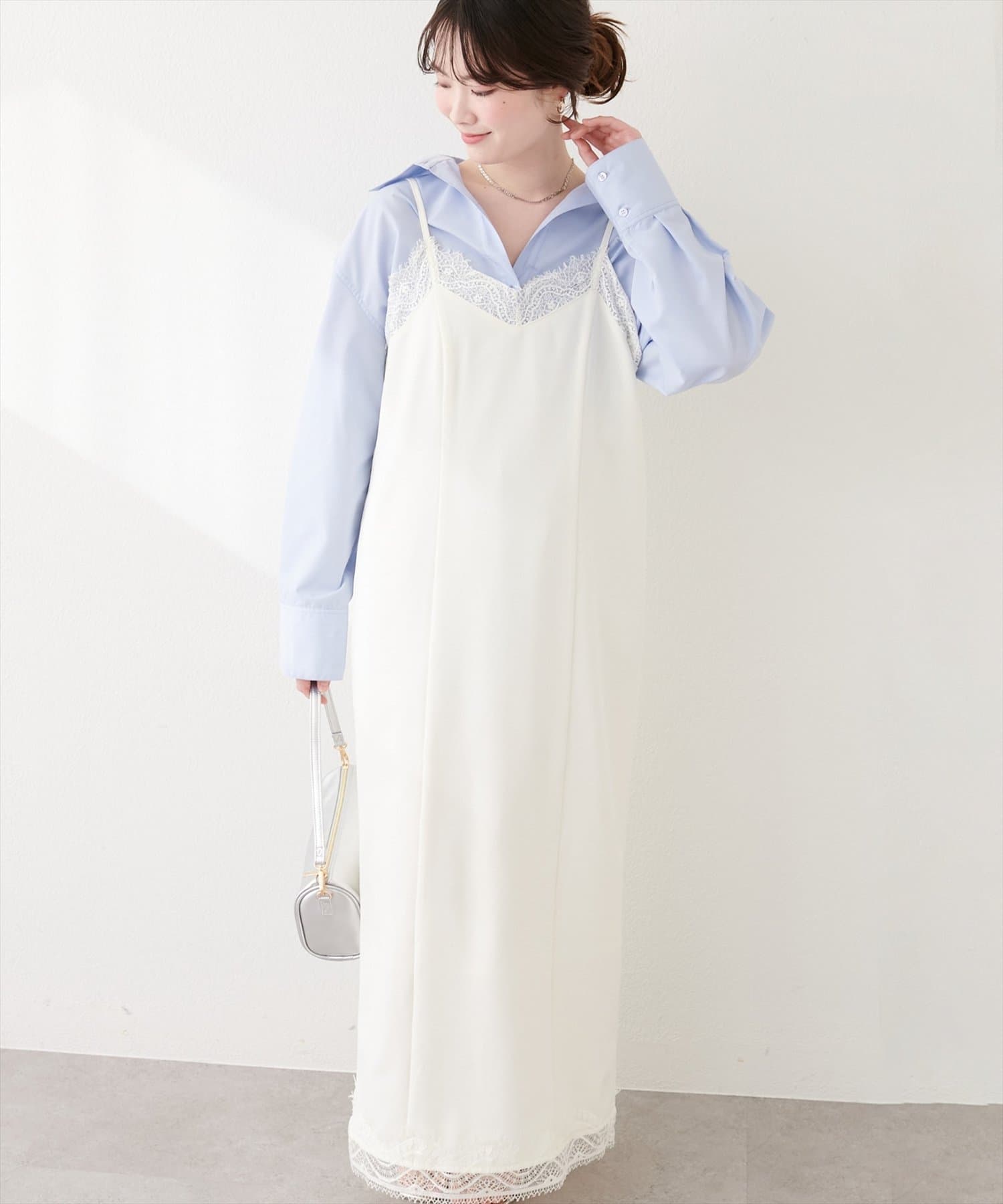 胸元と裾にあしらわれた繊細なレーストリムが、ロマンティックで上品な印象を与えます。