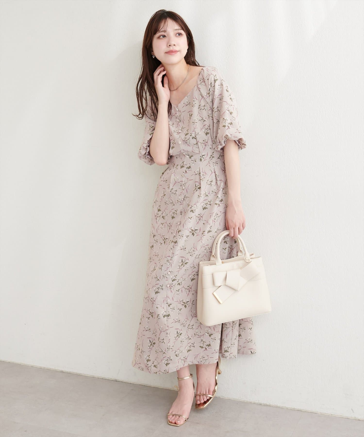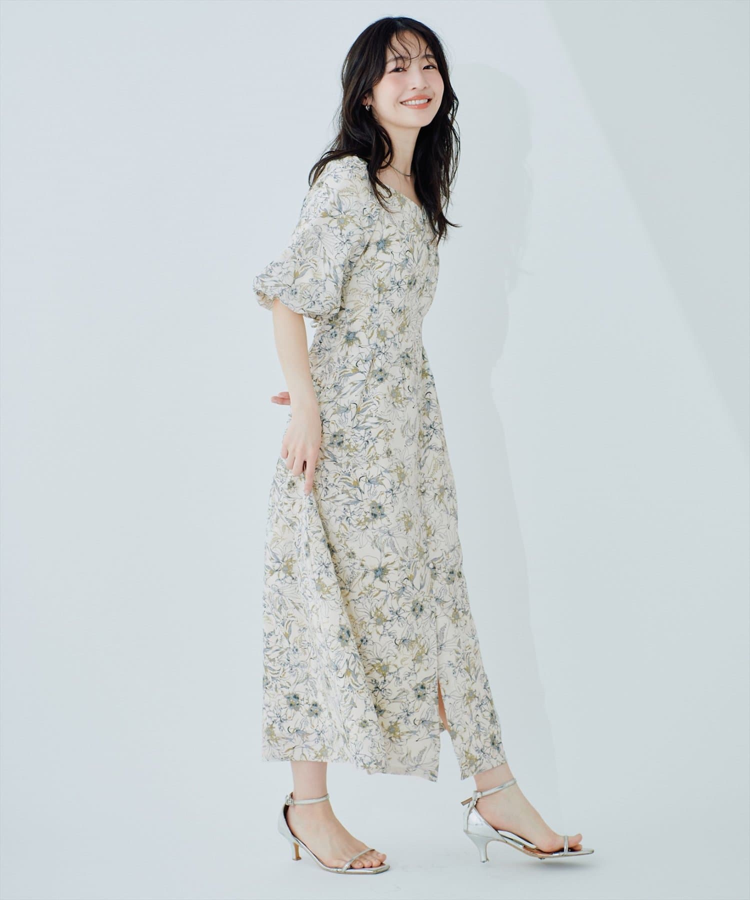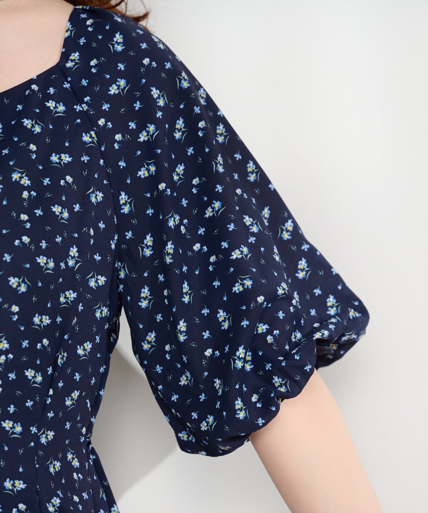 デコルテを美しく見せるネックラインと、ふんわりとしたバルーン袖が、フェミニンな印象をプラス。