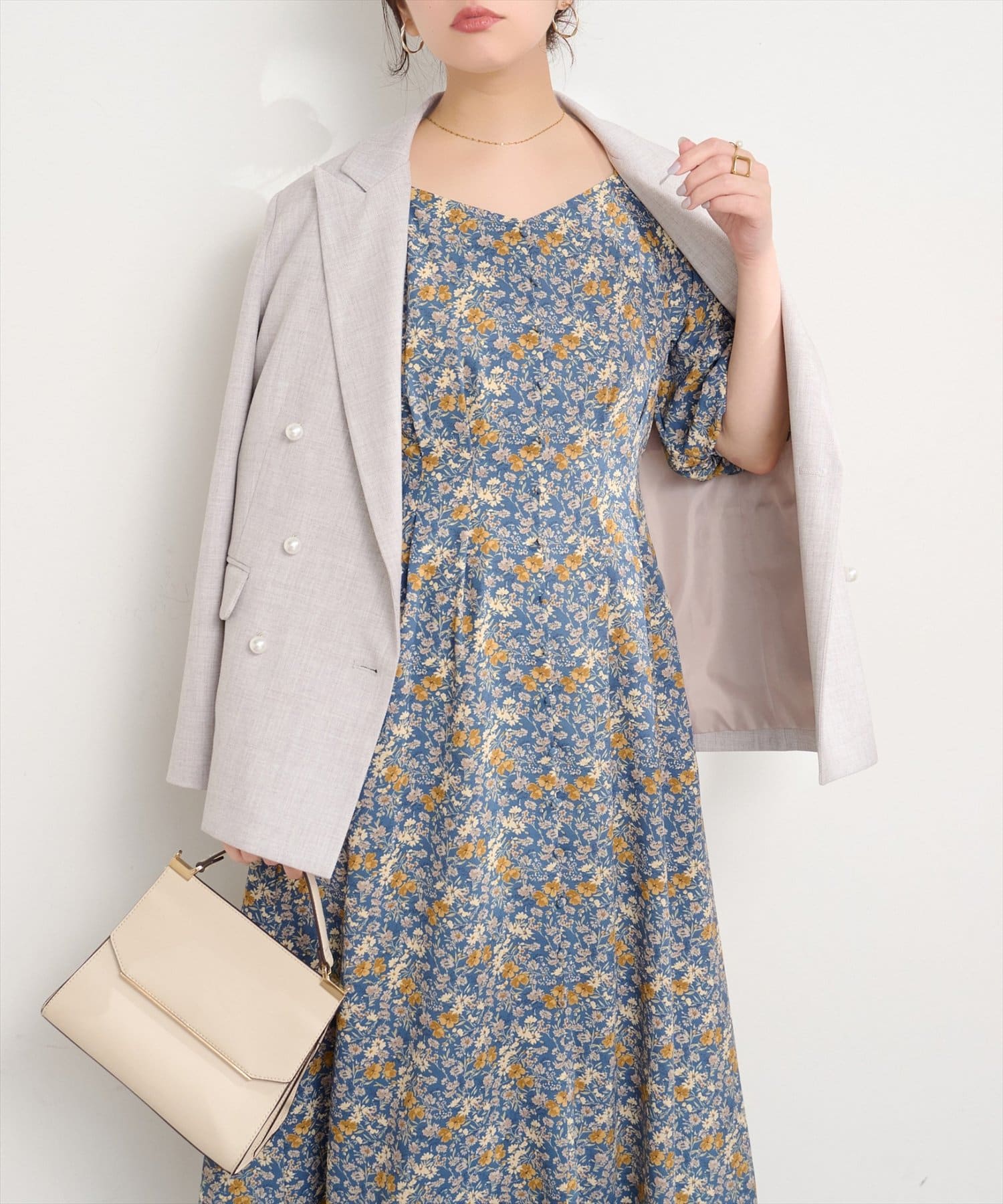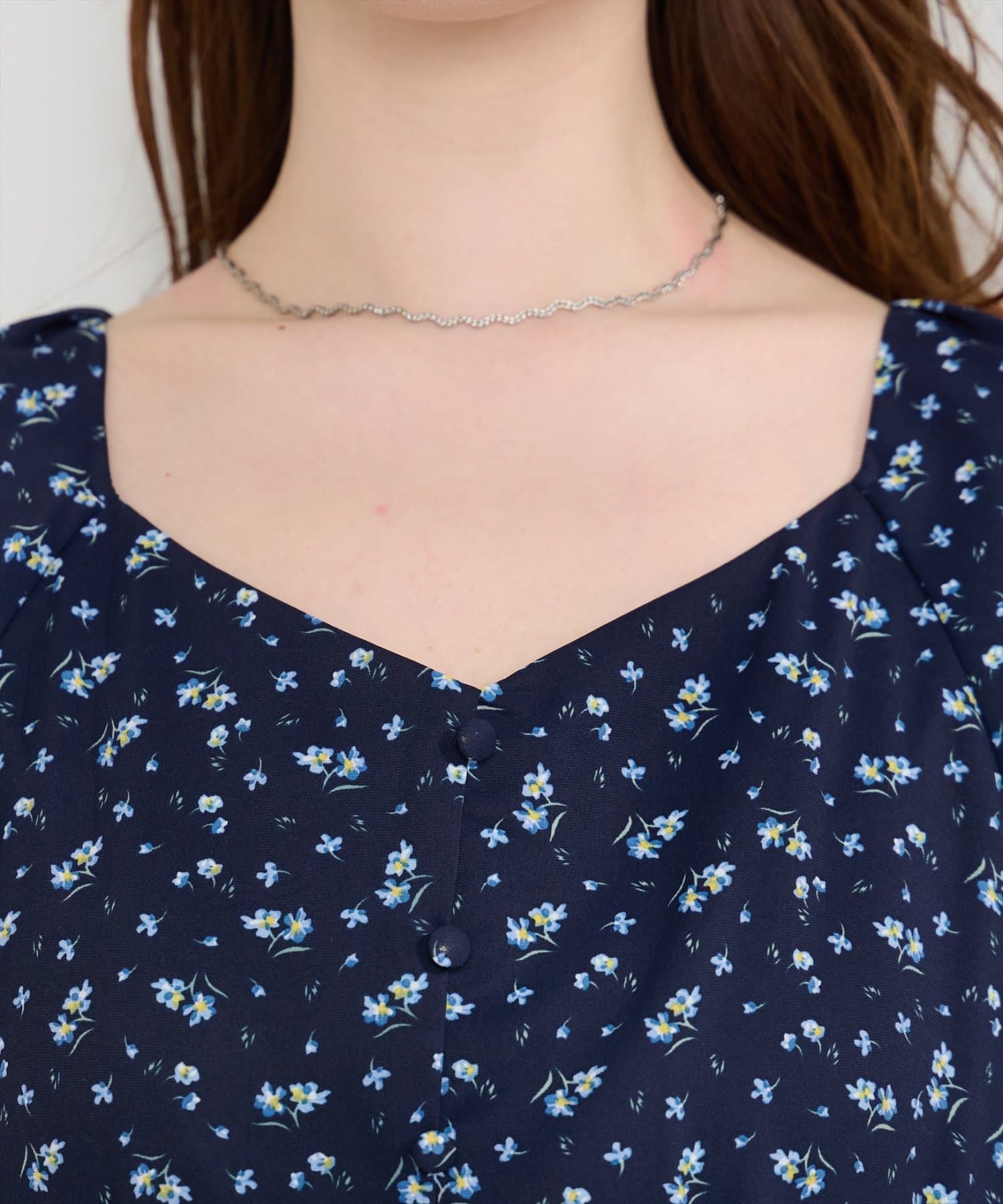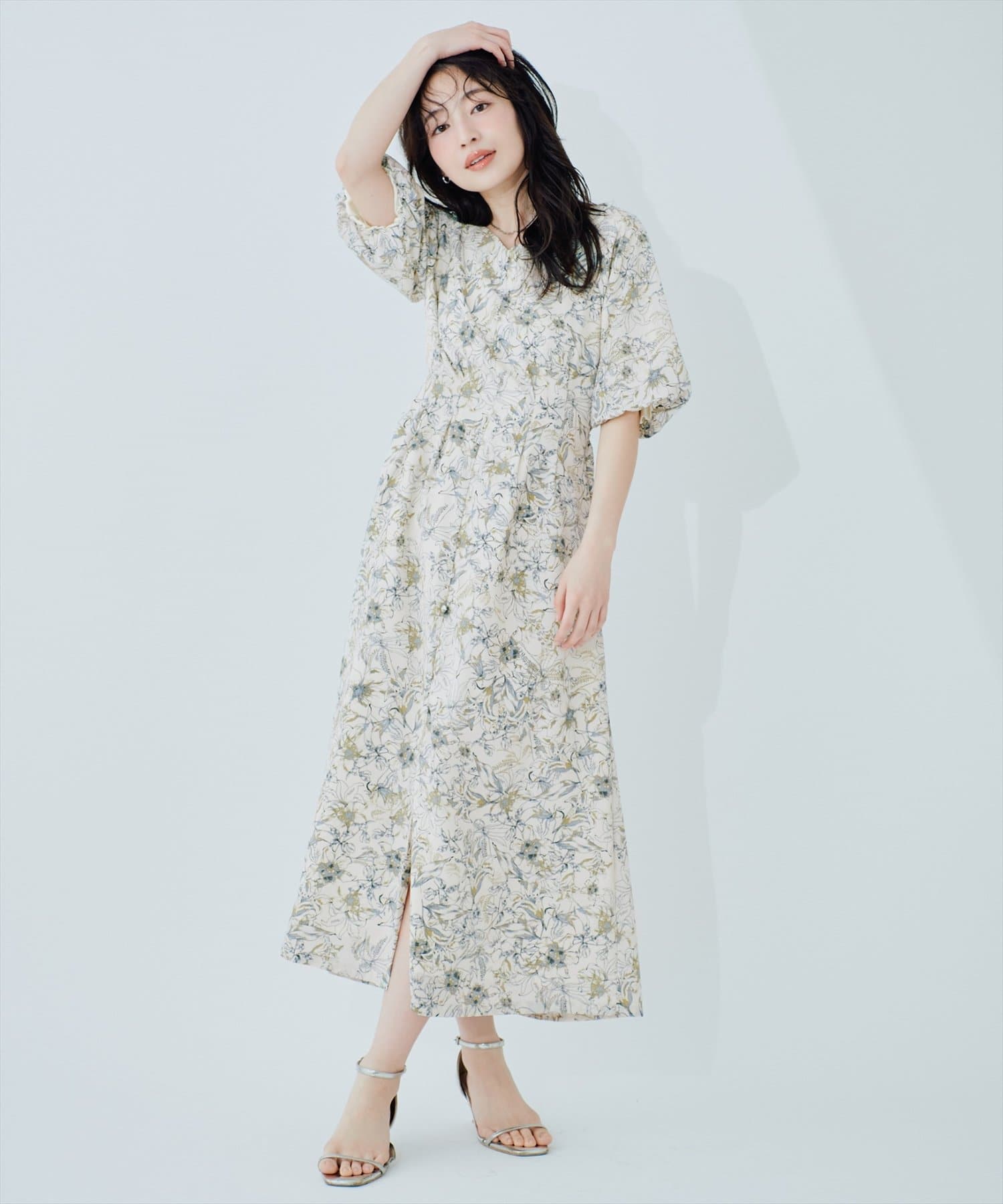 デコルテを美しく見せるネックラインと、ふんわりとしたバルーン袖が、フェミニンな印象をプラス。