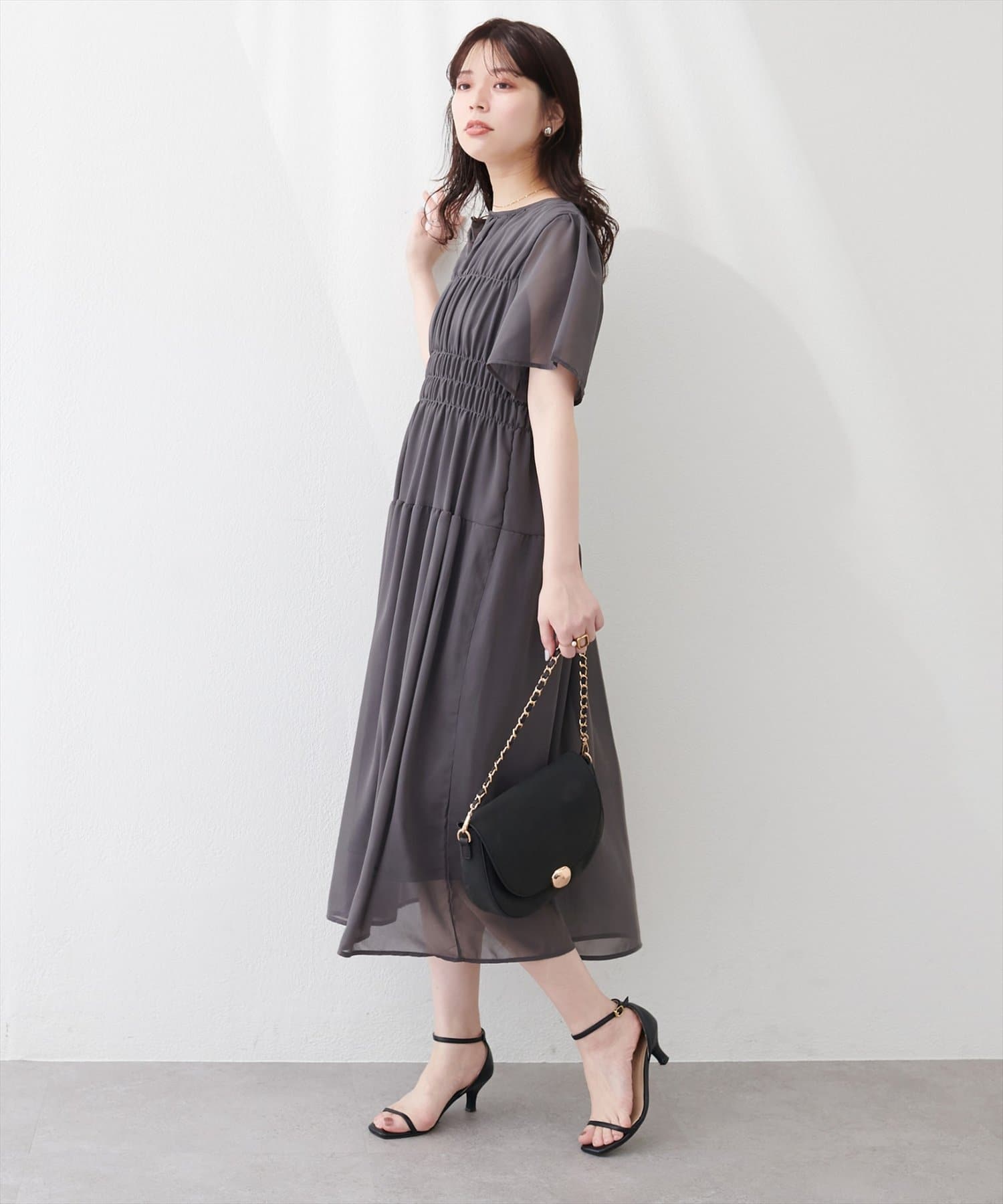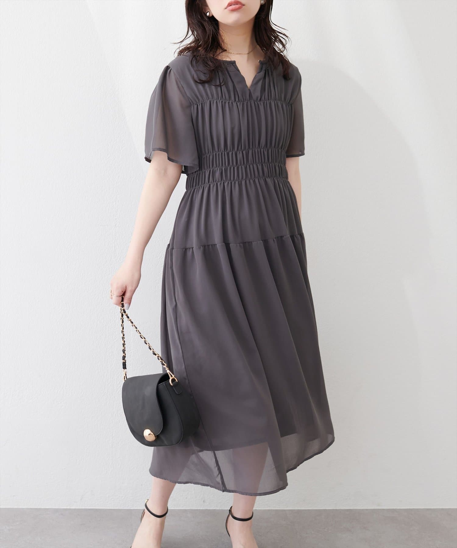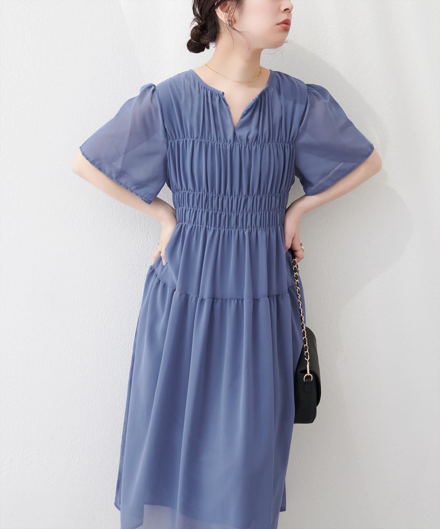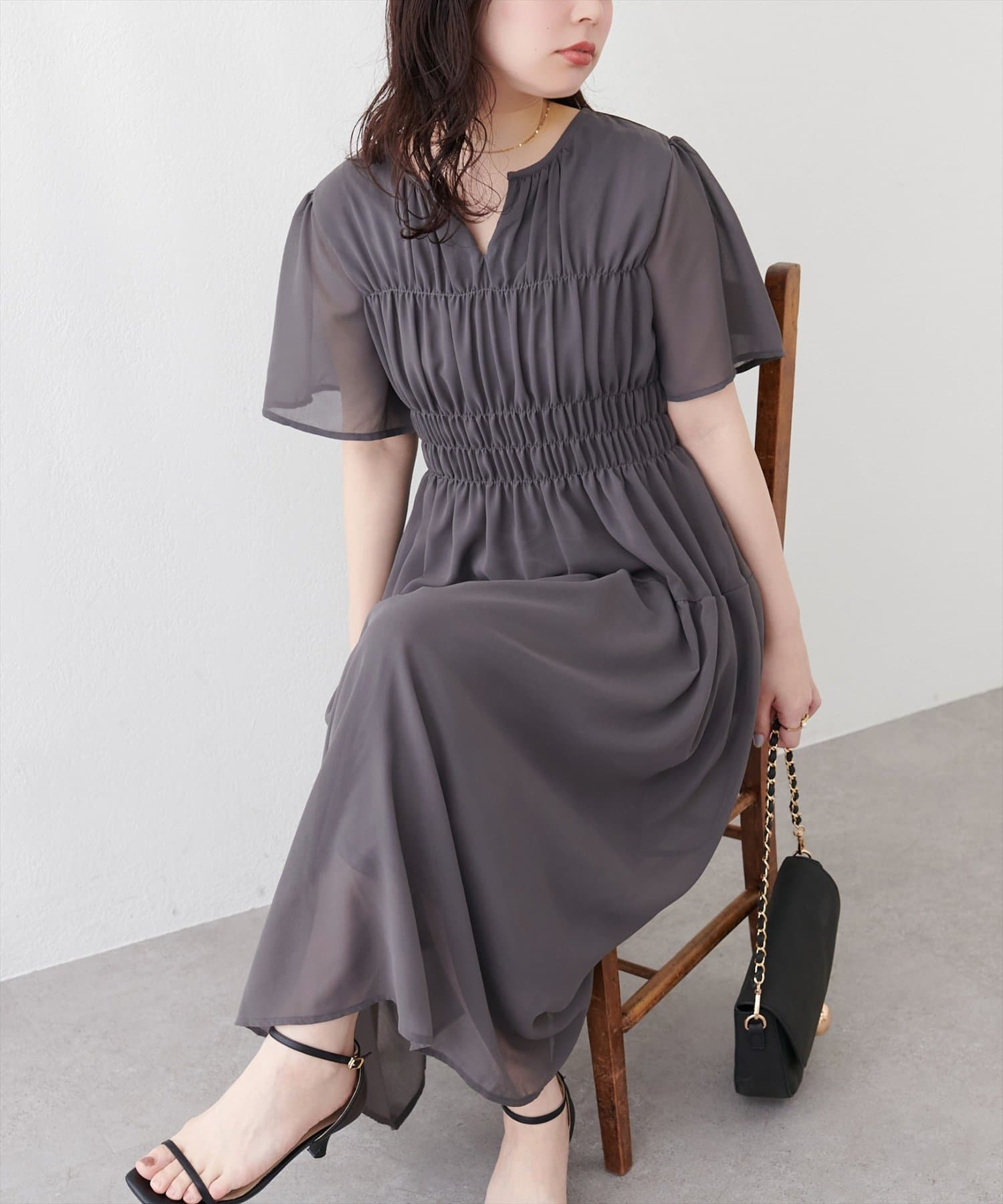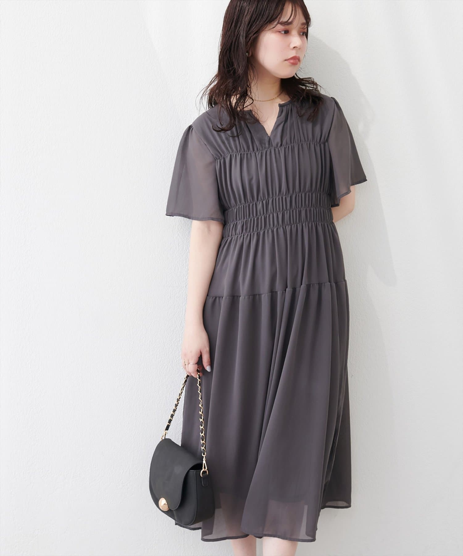 見頃部分にたっぷりシャーリングの入ったワンピース。