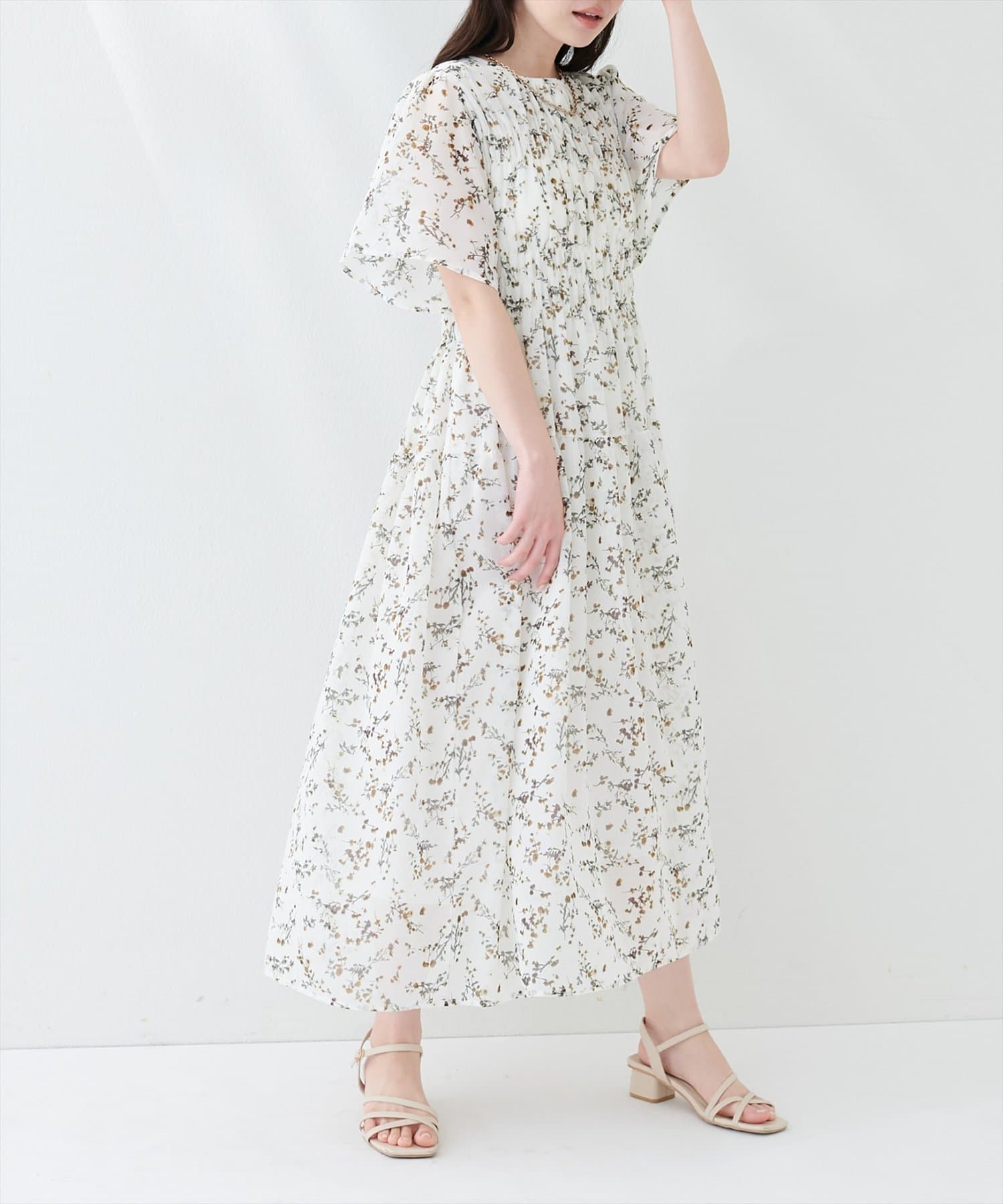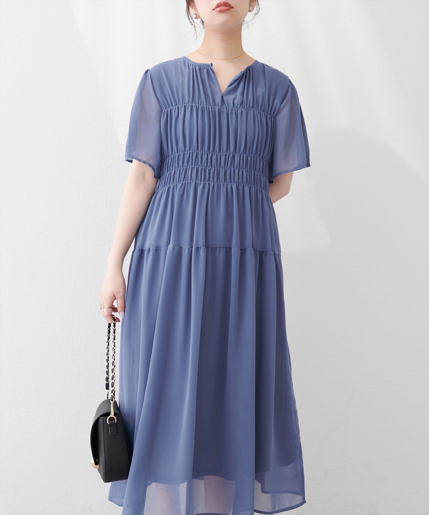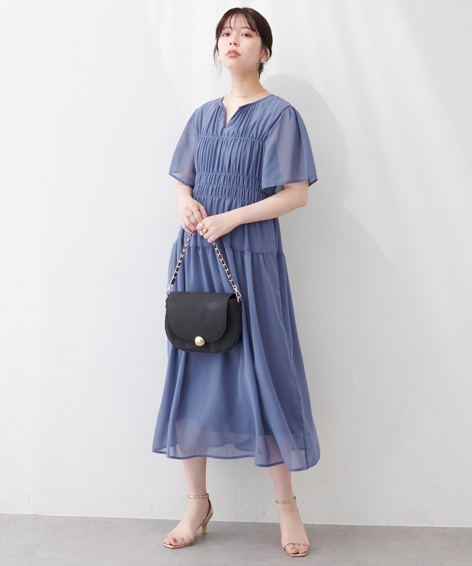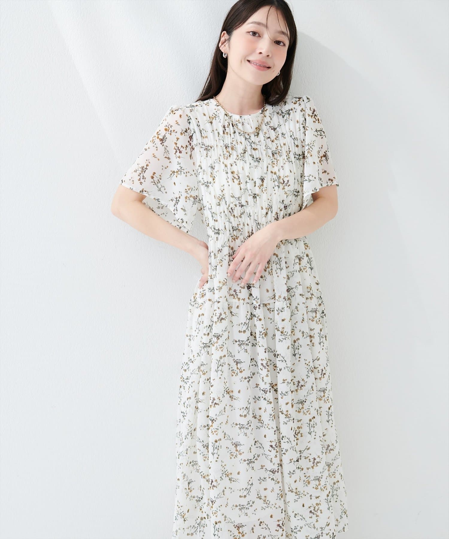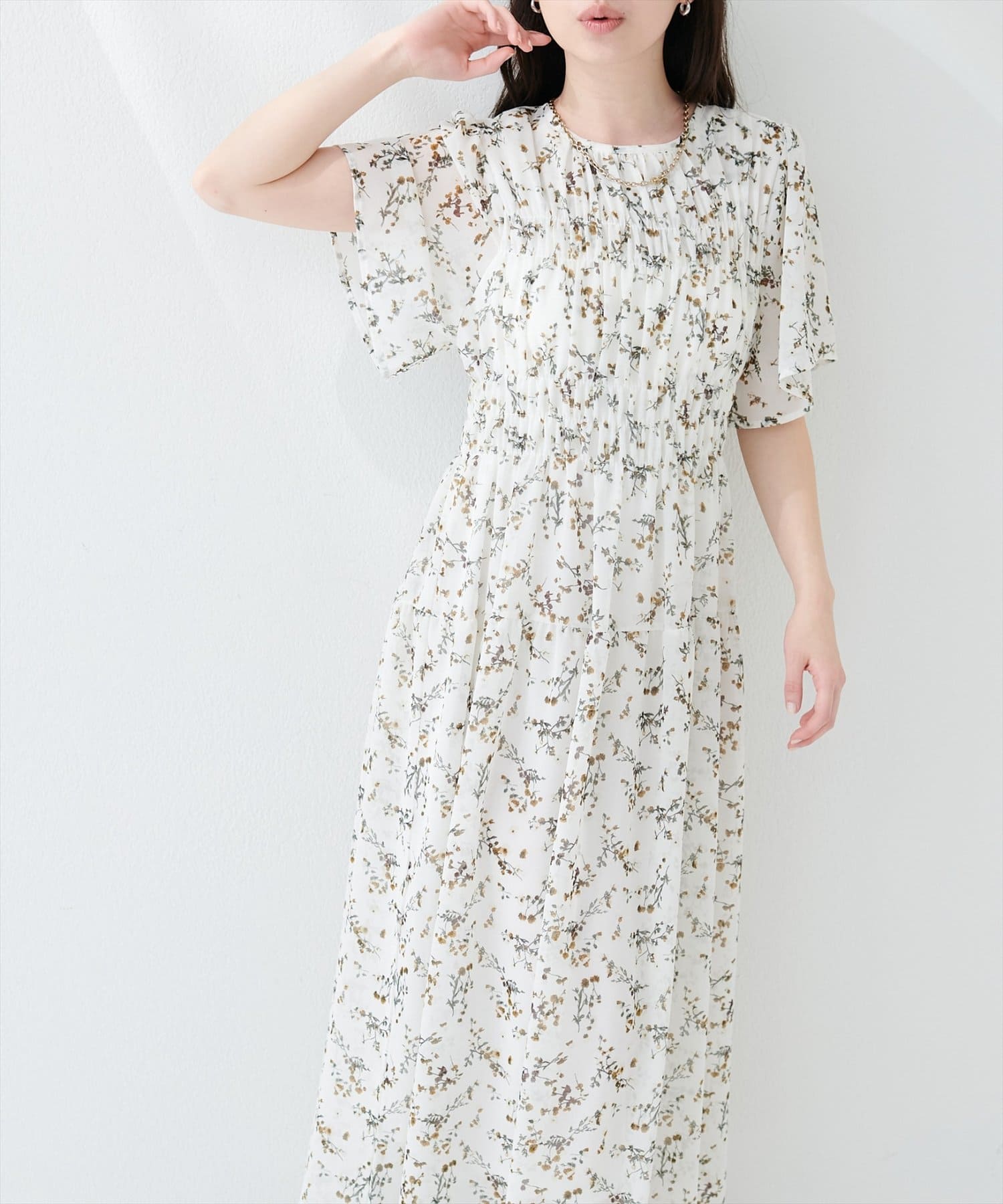 見頃部分にたっぷりシャーリングの入ったワンピース。