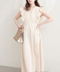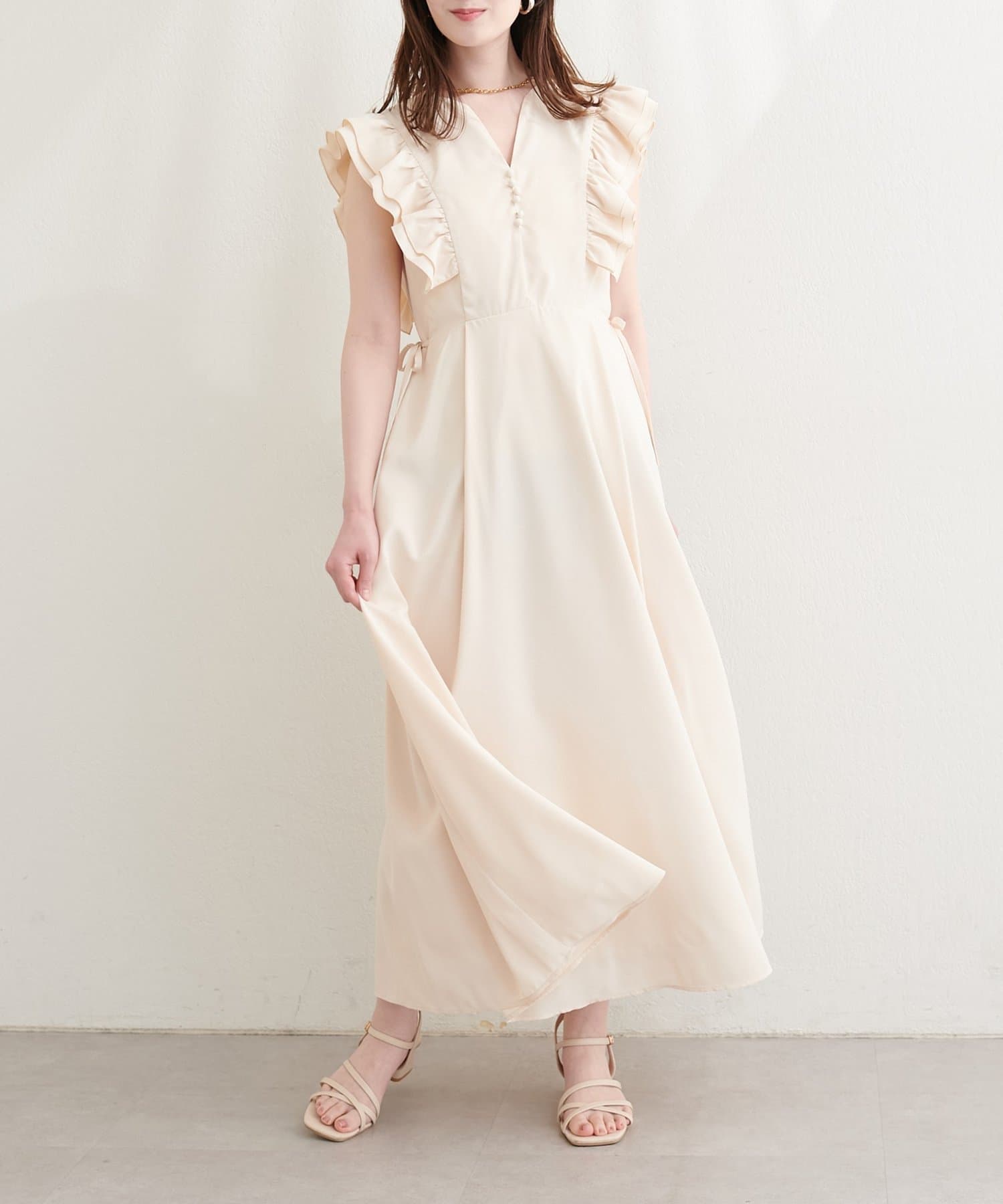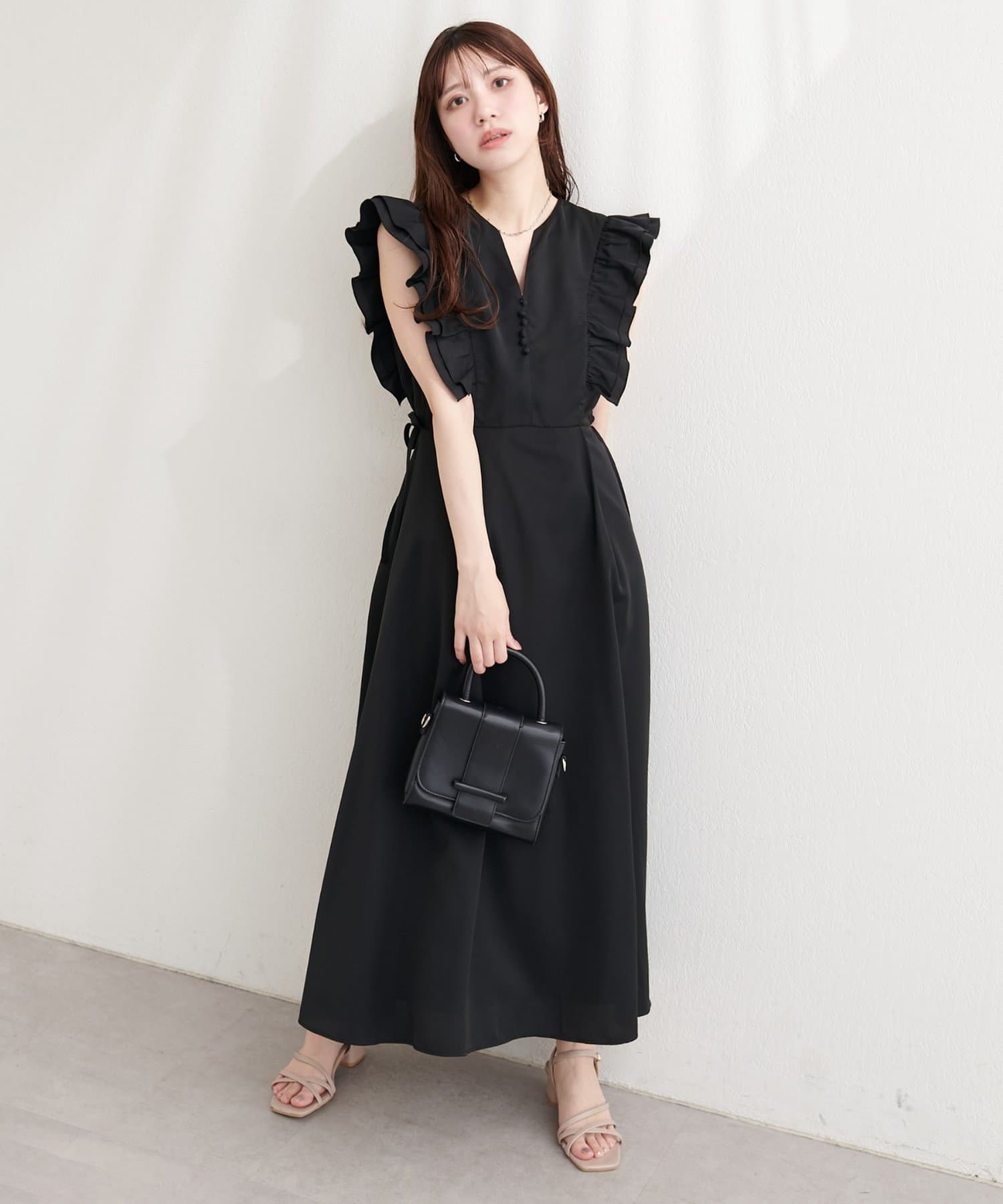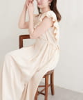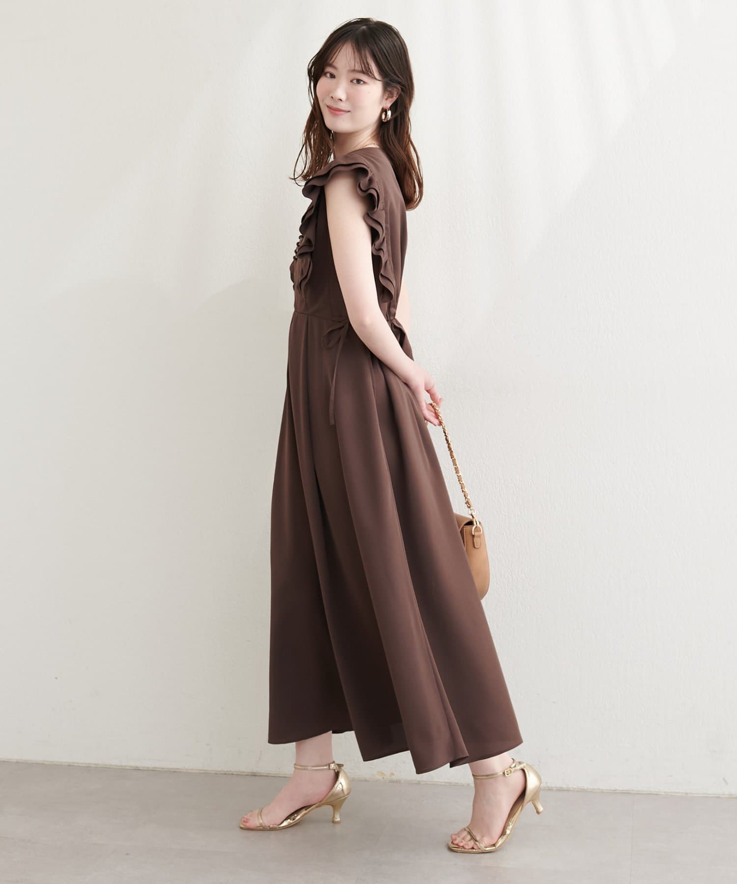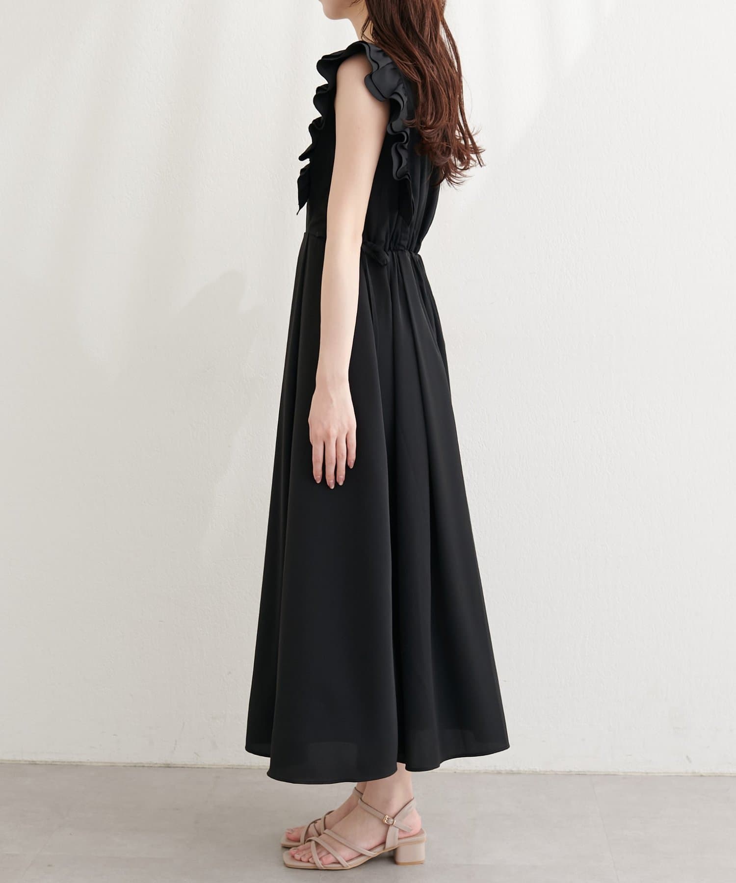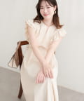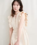 肩を飾るフリルは甘すぎない絶妙なボリューム感で、大人の女性にも似合う上品な可愛らしさを演出します。