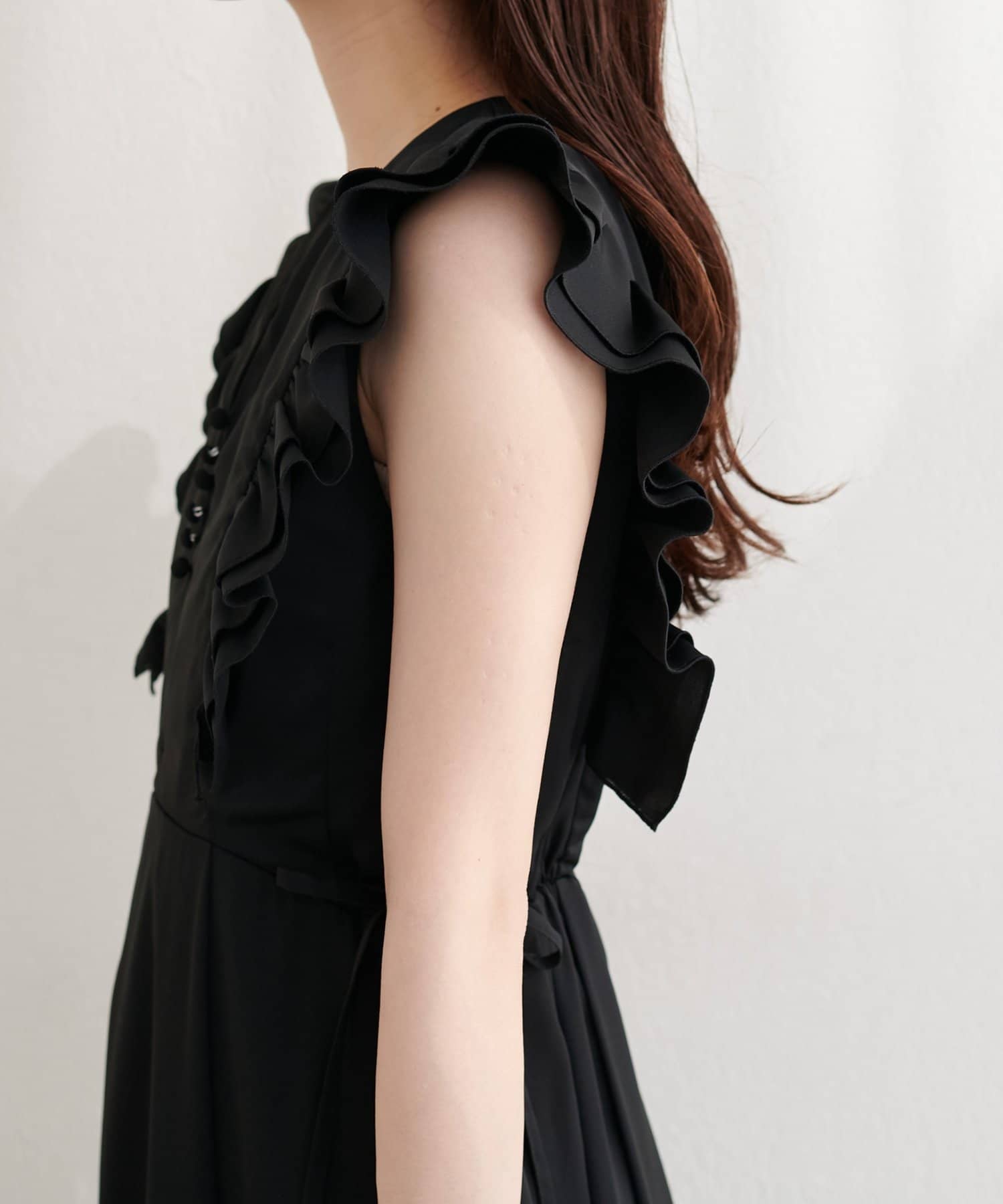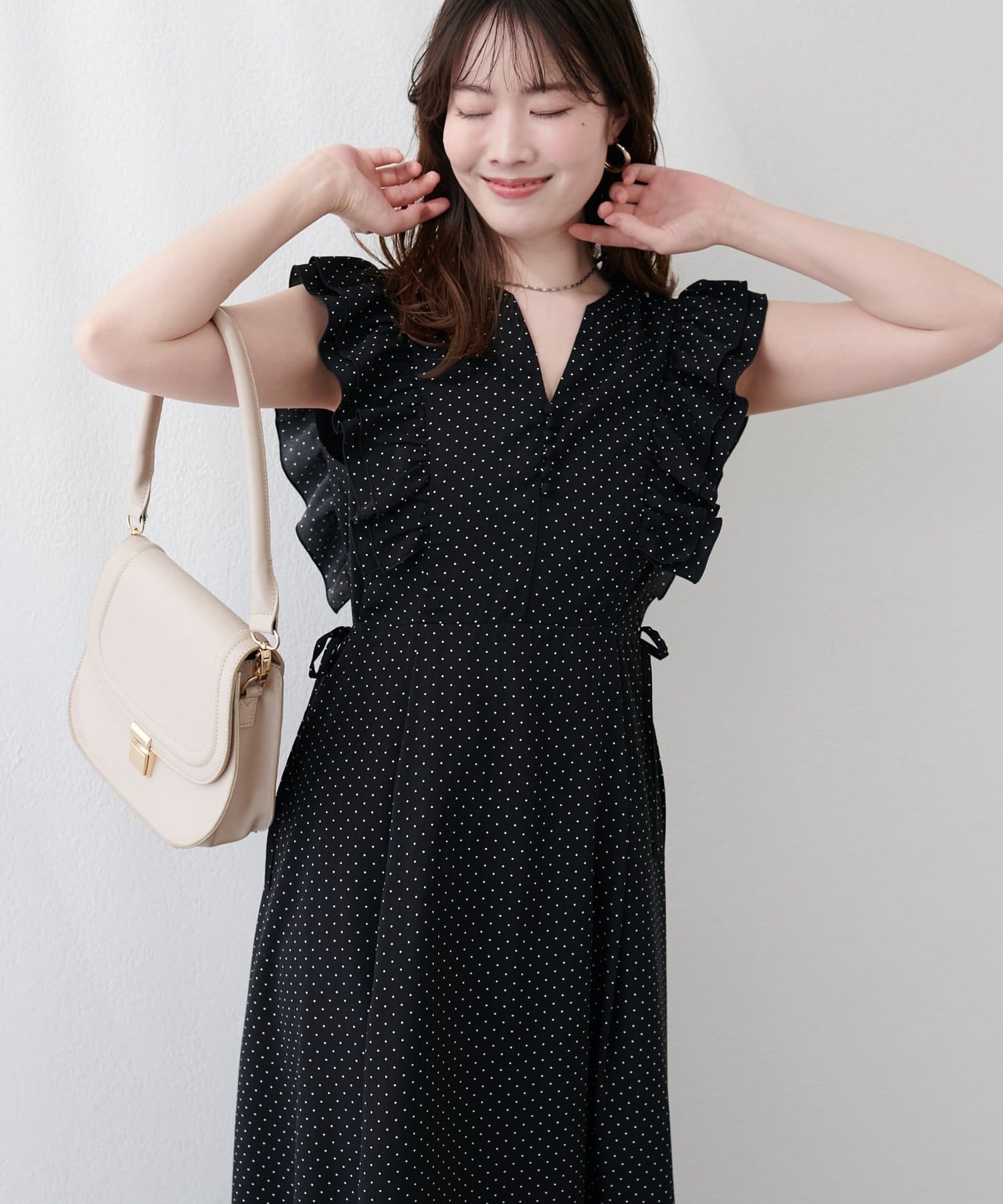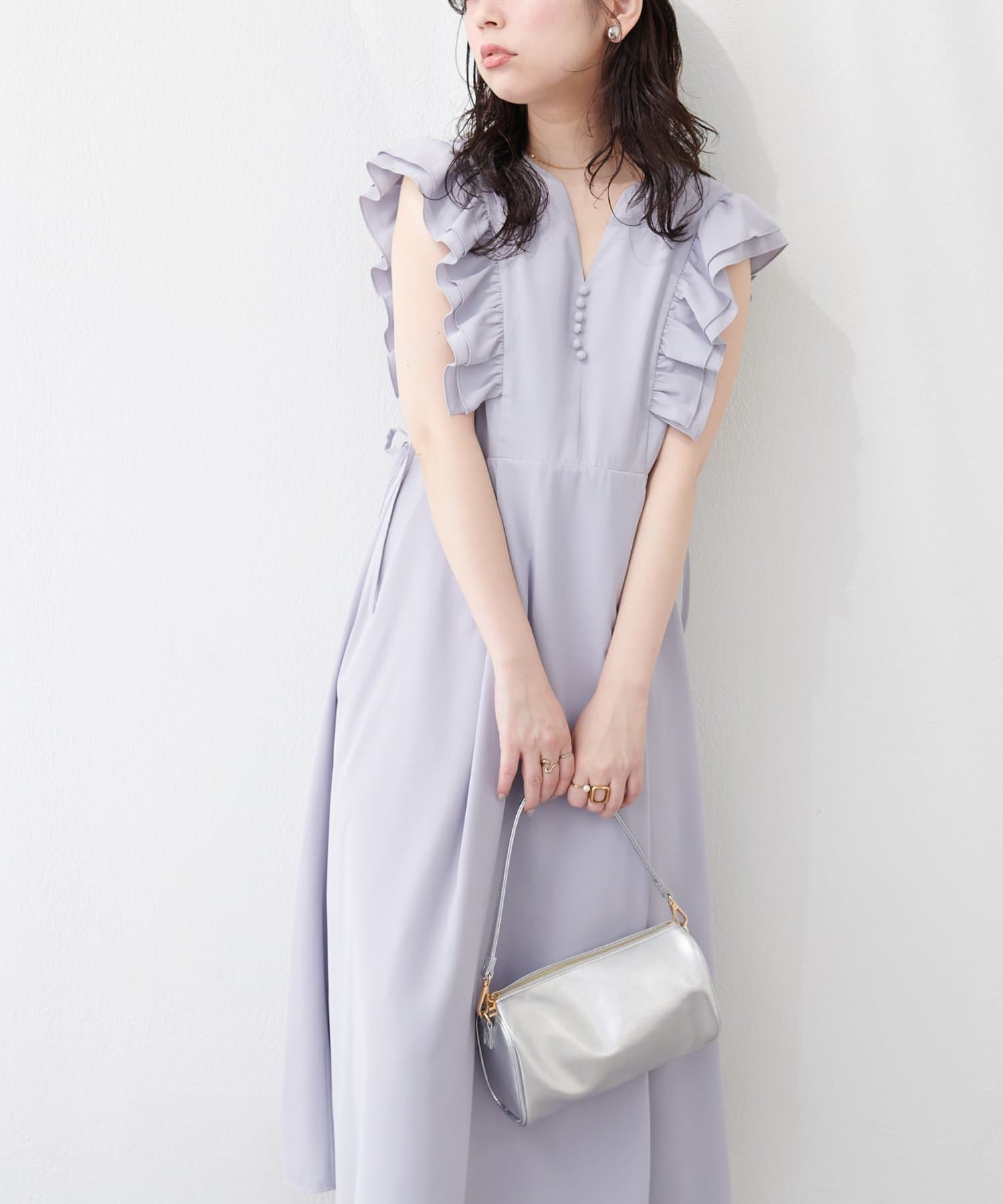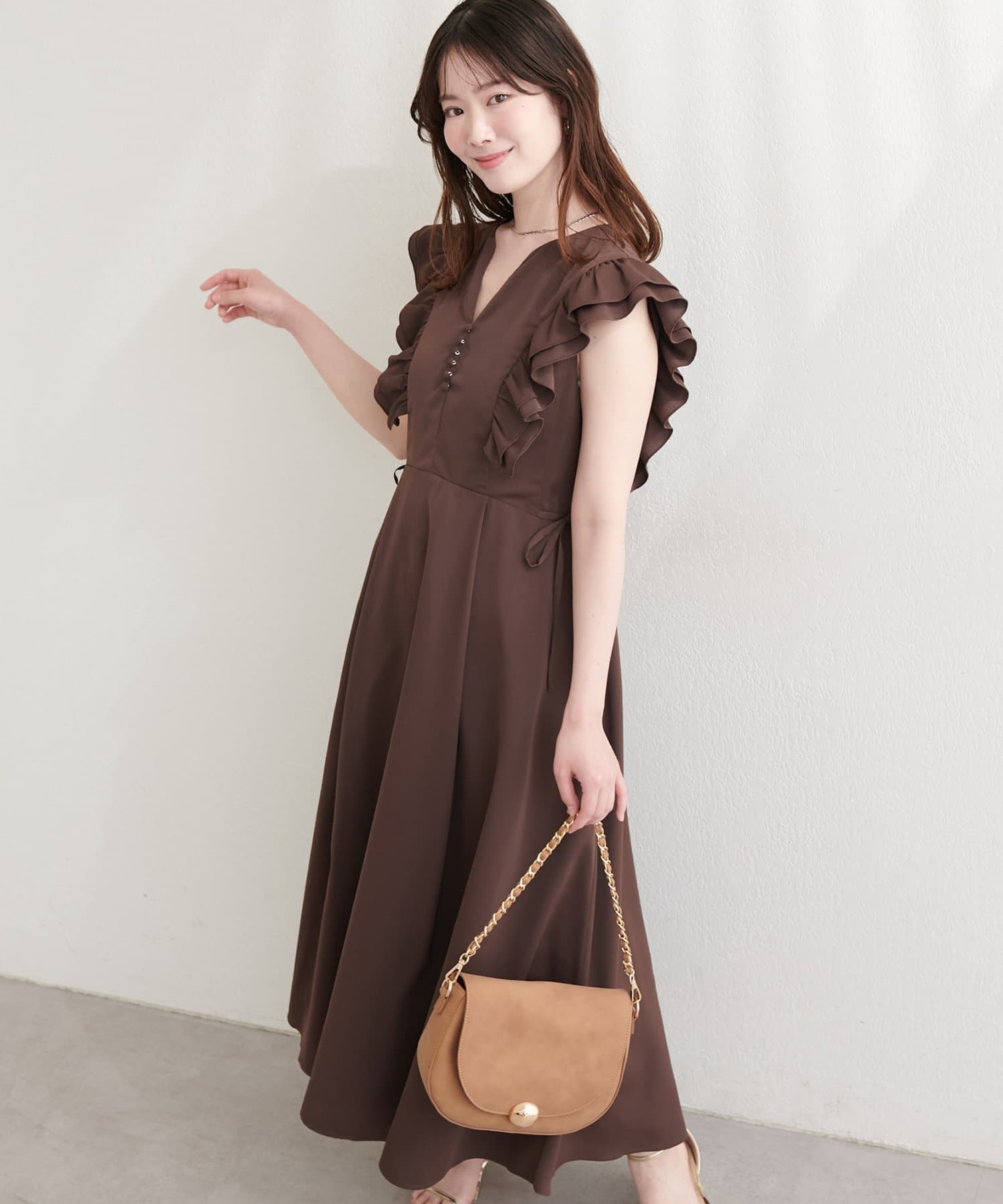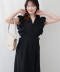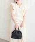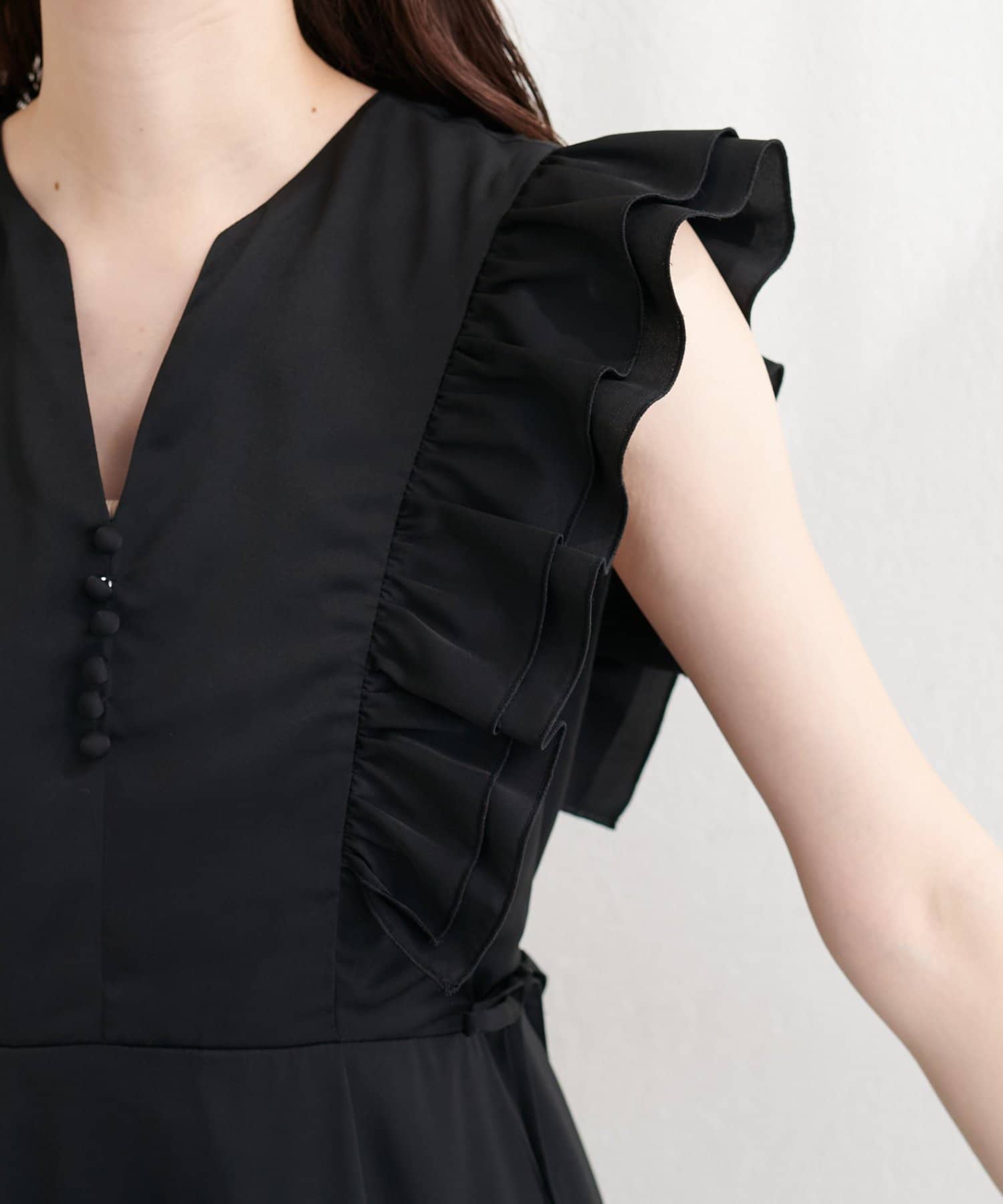肩を飾るフリルは甘すぎない絶妙なボリューム感で、大人の女性にも似合う上品な可愛らしさを演出します。