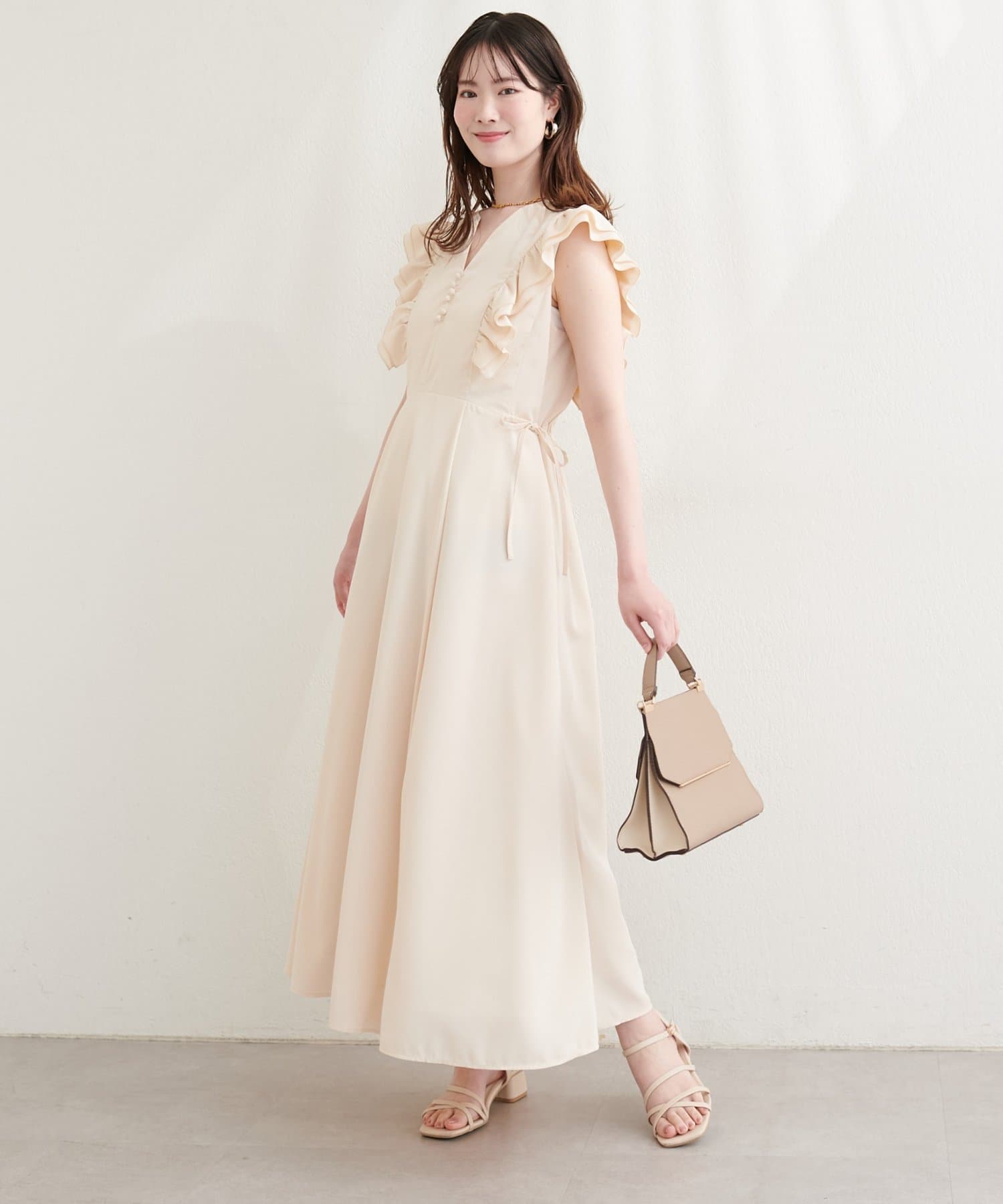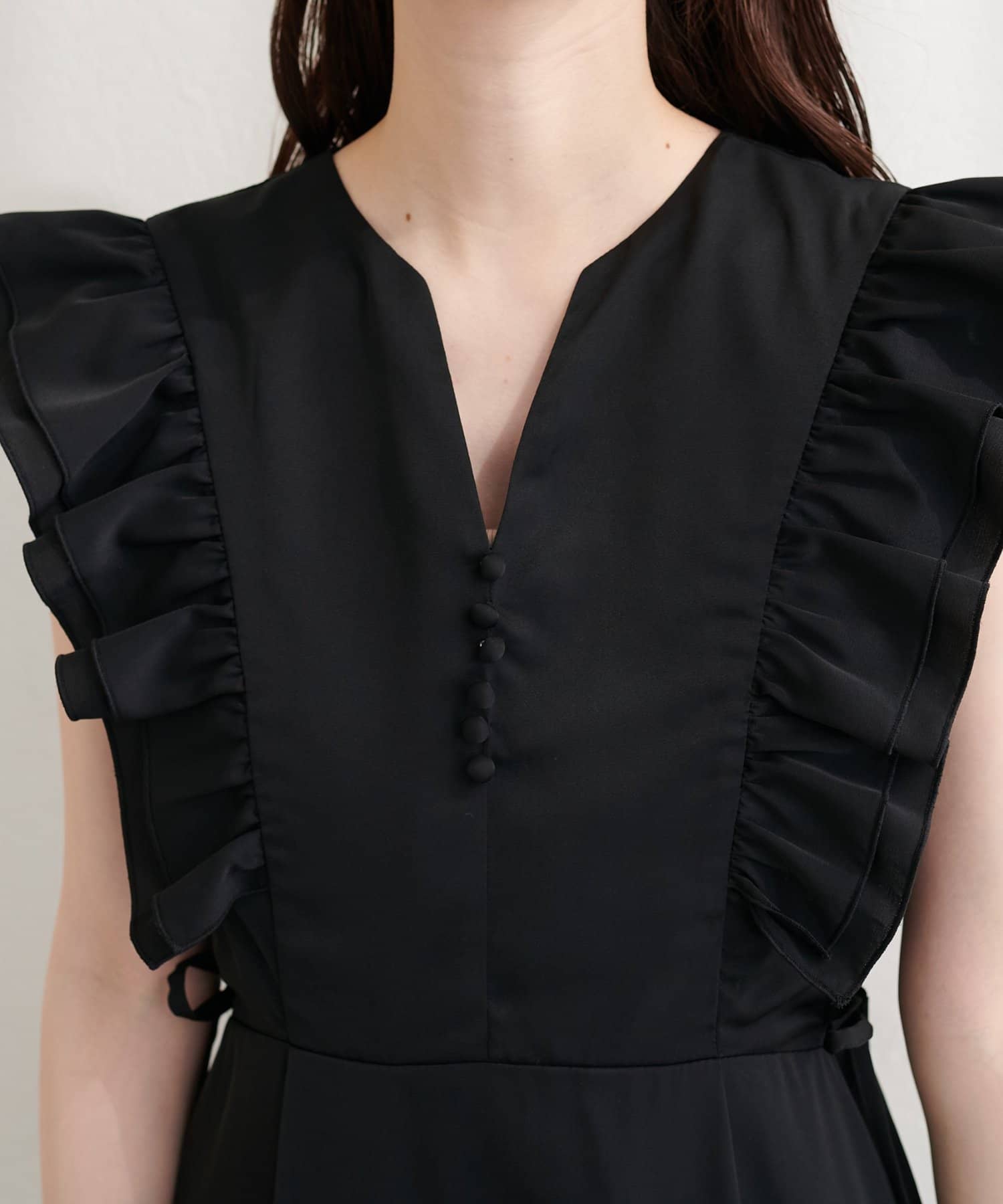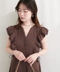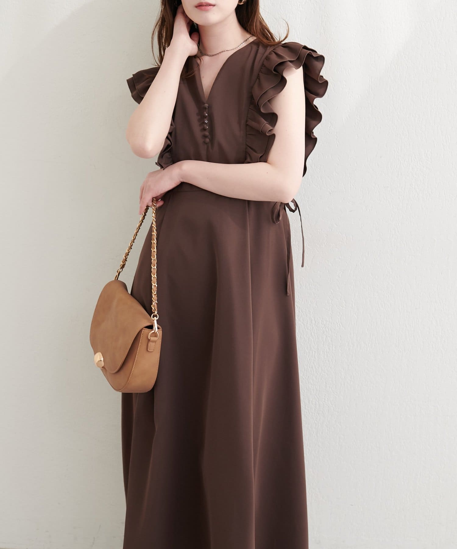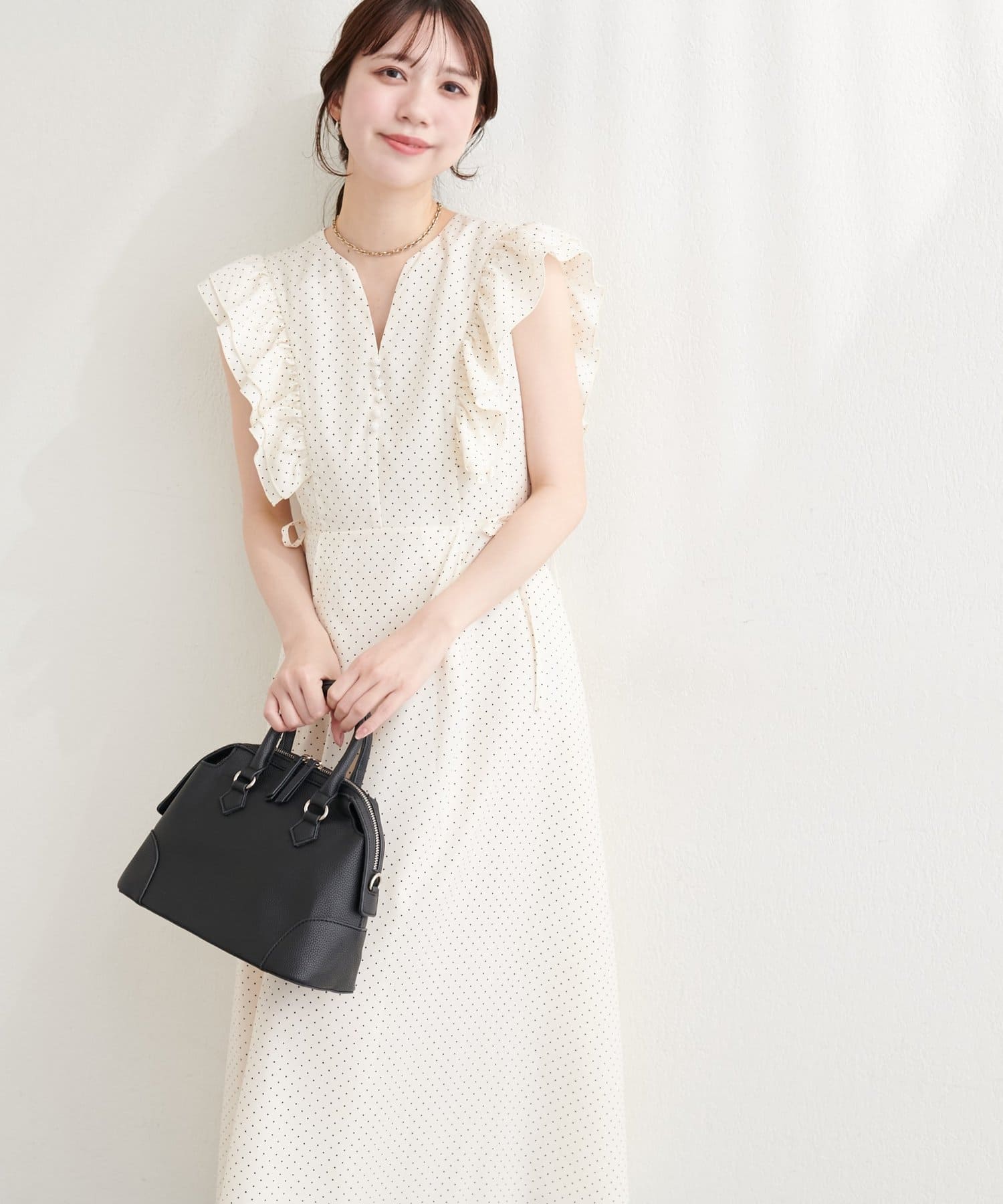 肩を飾るフリルは甘すぎない絶妙なボリューム感で、大人の女性にも似合う上品な可愛らしさを演出します。