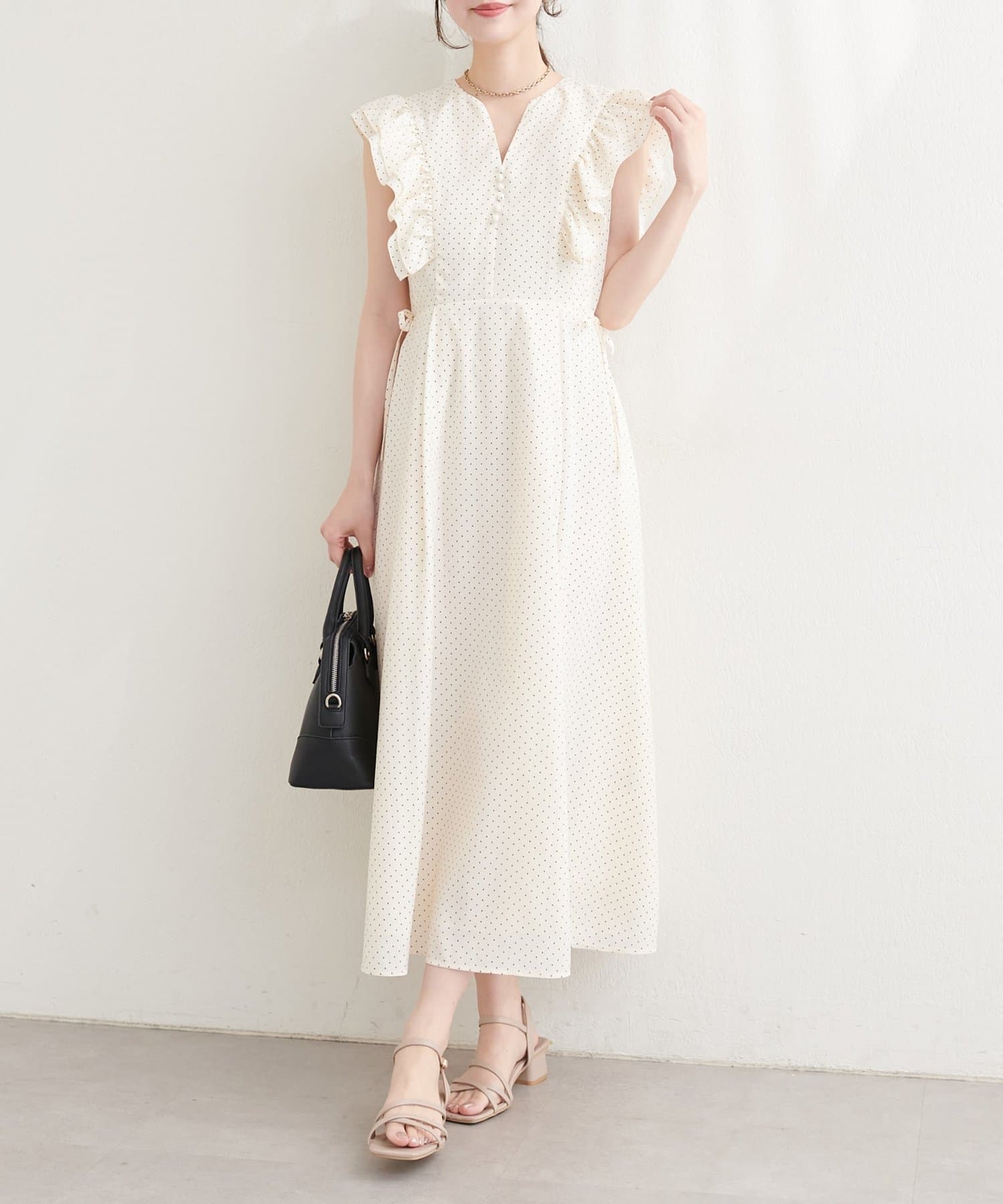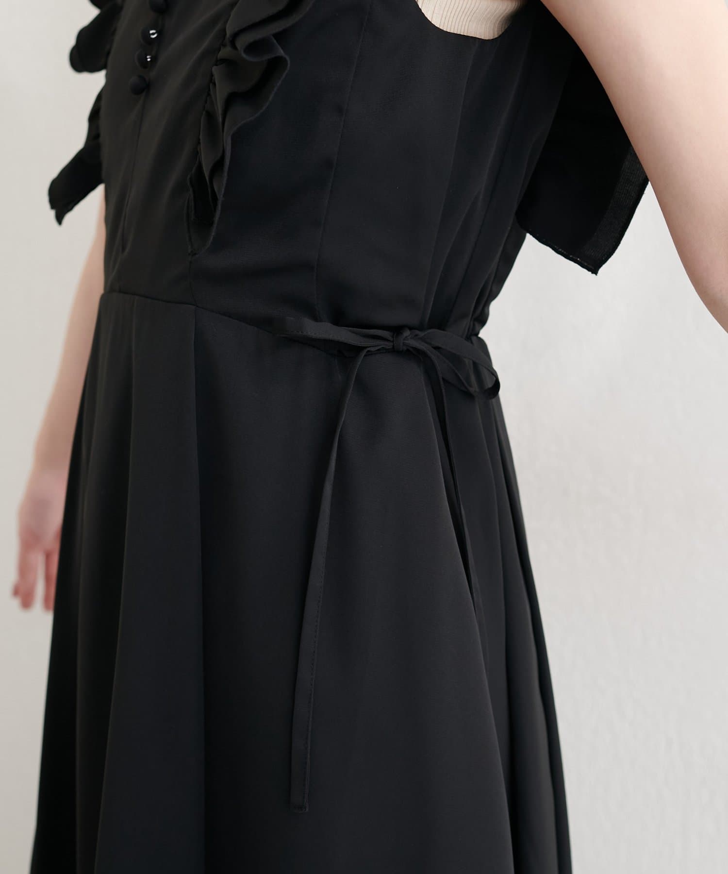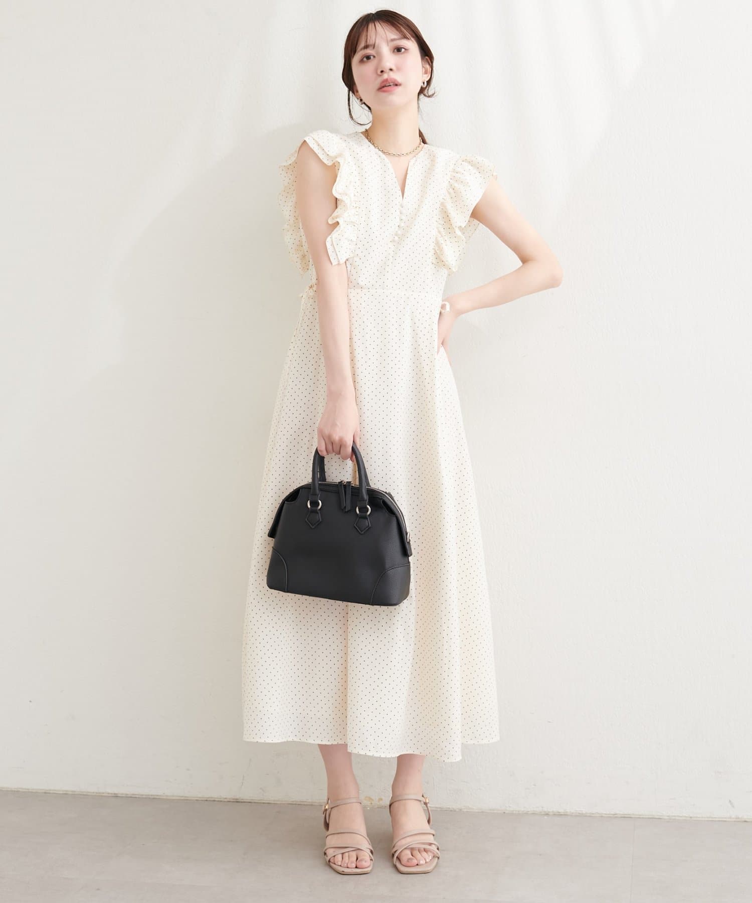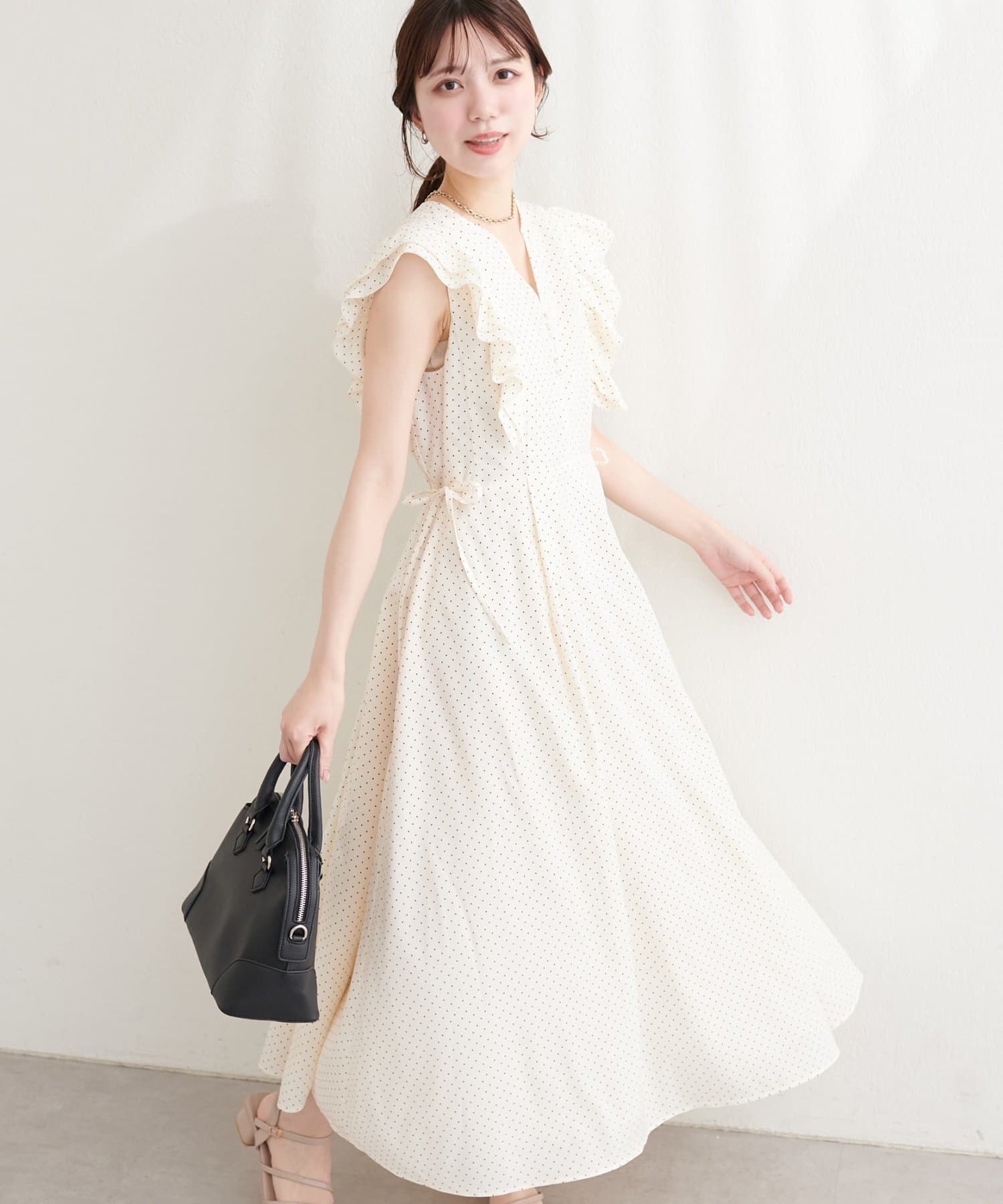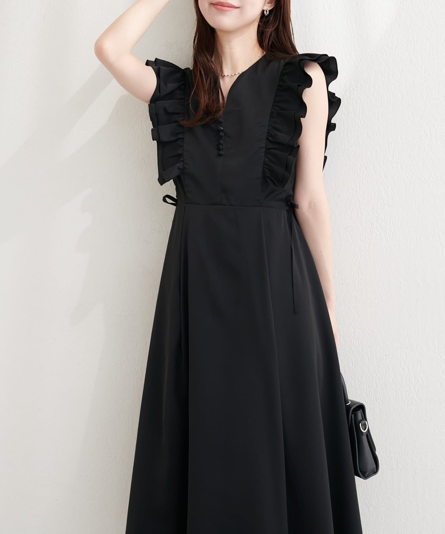 肩を飾るフリルは甘すぎない絶妙なボリューム感で、大人の女性にも似合う上品な可愛らしさを演出します。