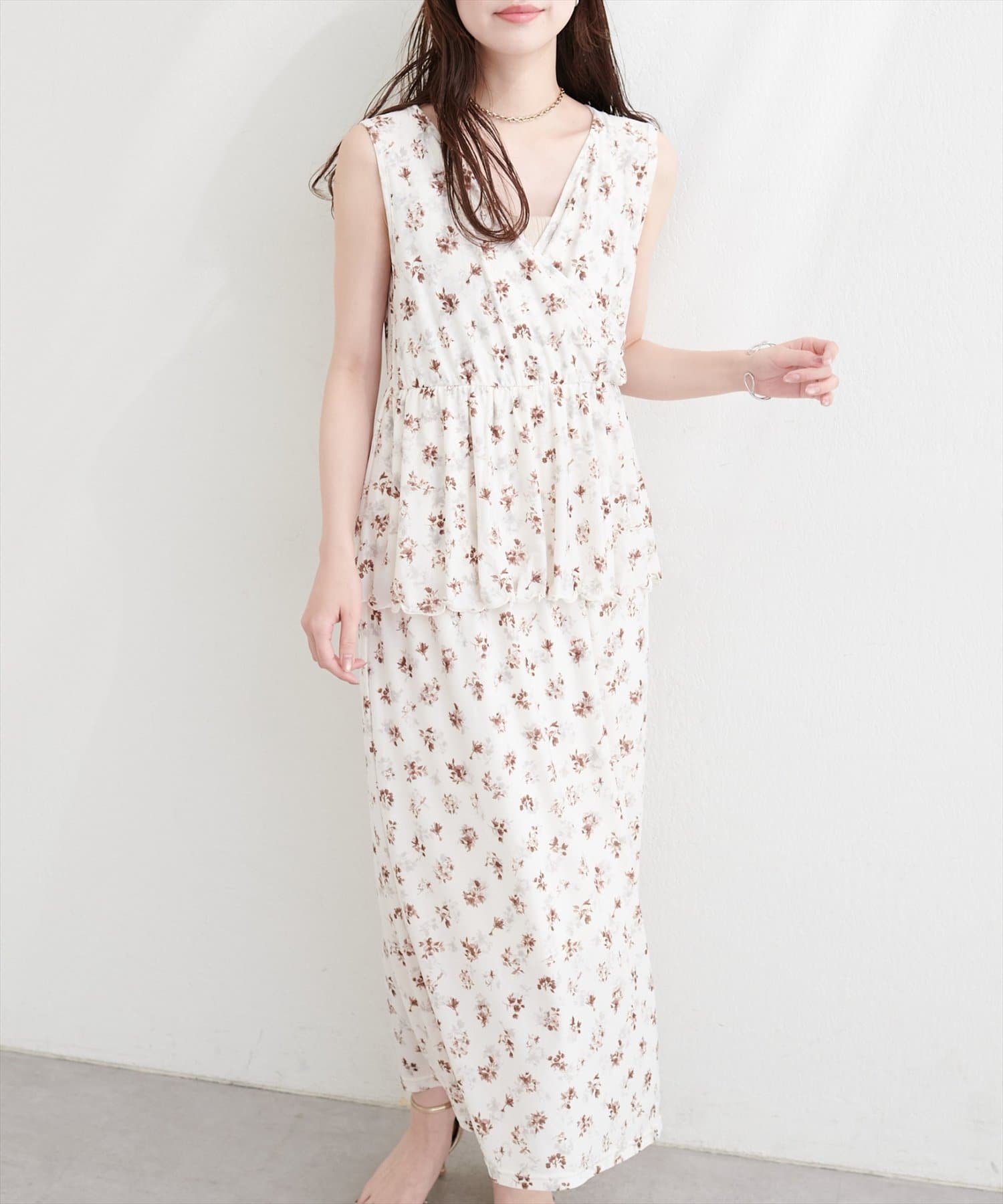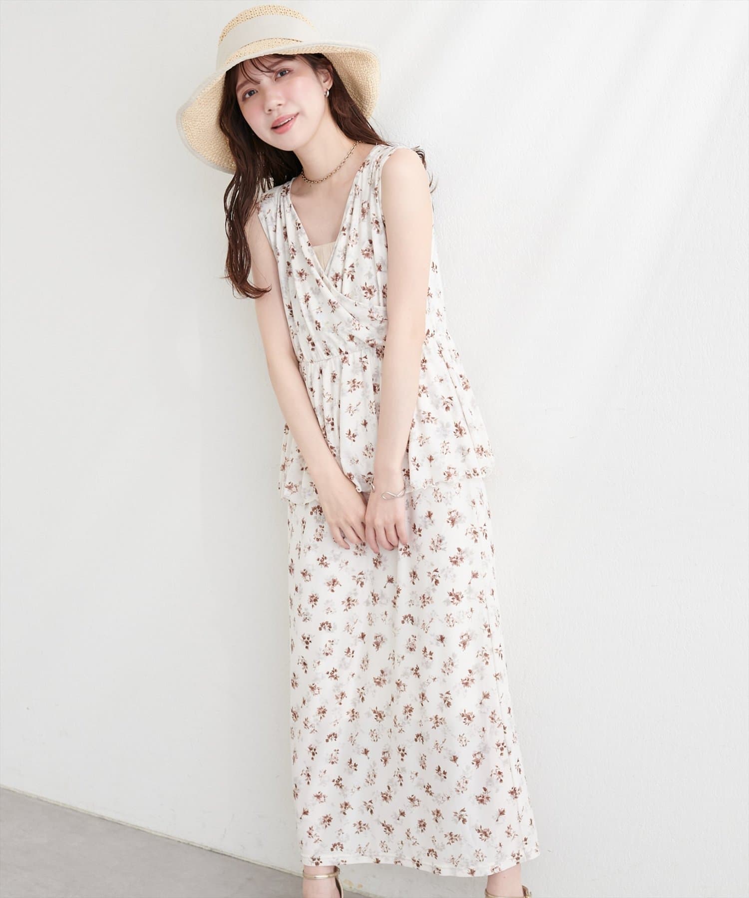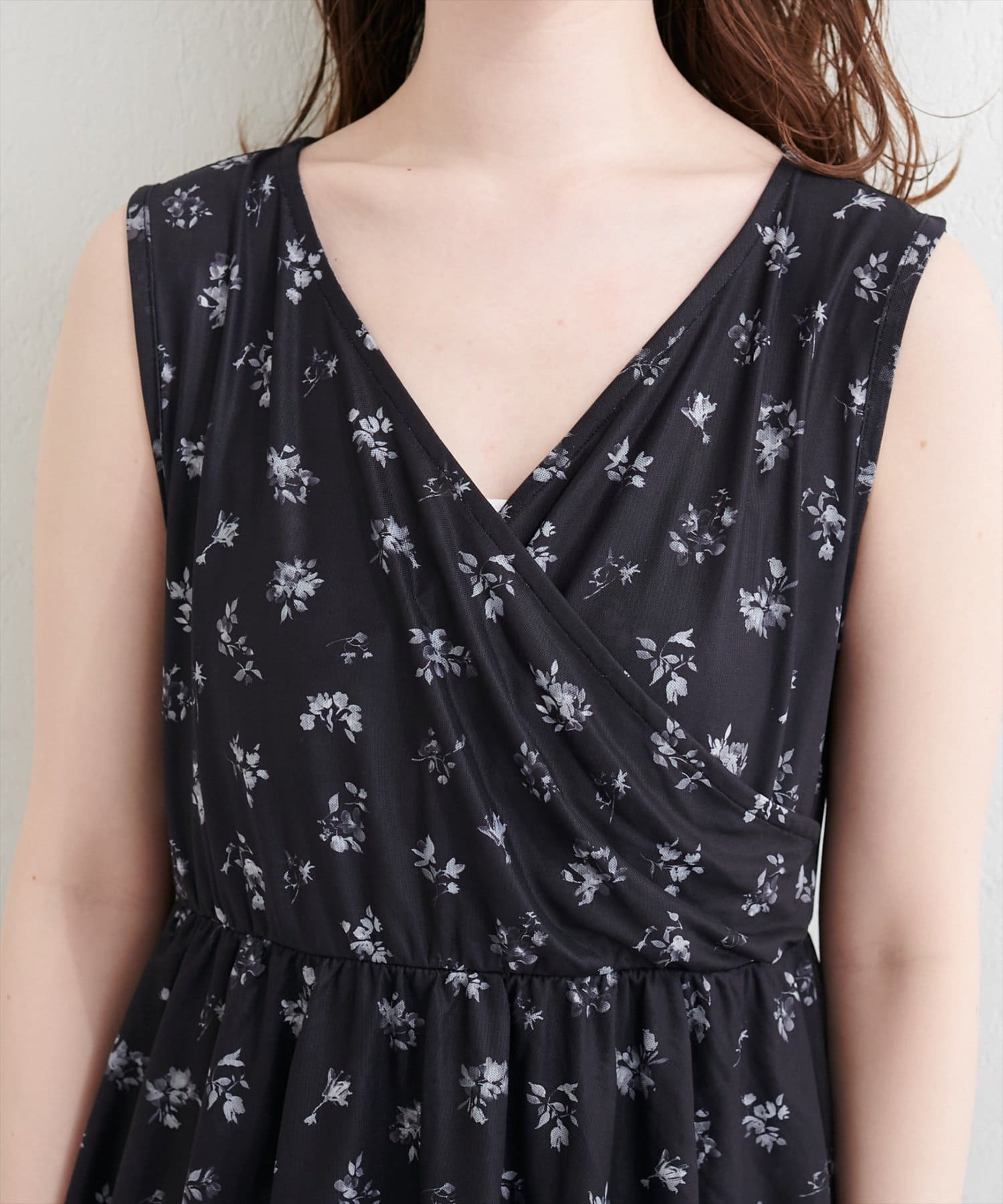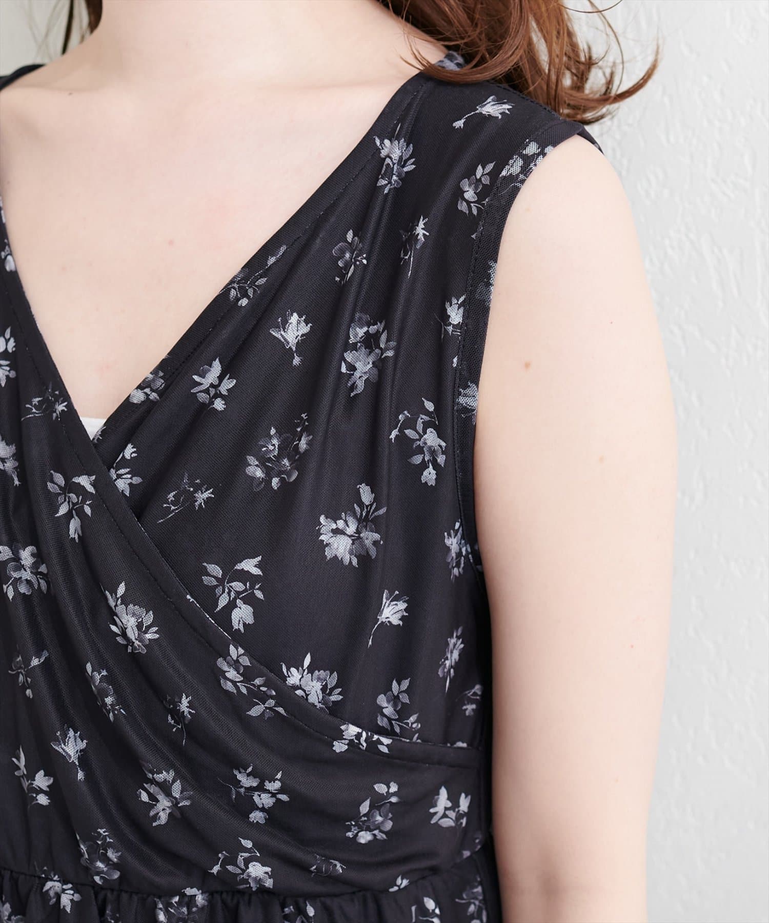 トップス部分は、すっきりとしたシルエットで、デコルテを美しく見せるVネックデザイン。