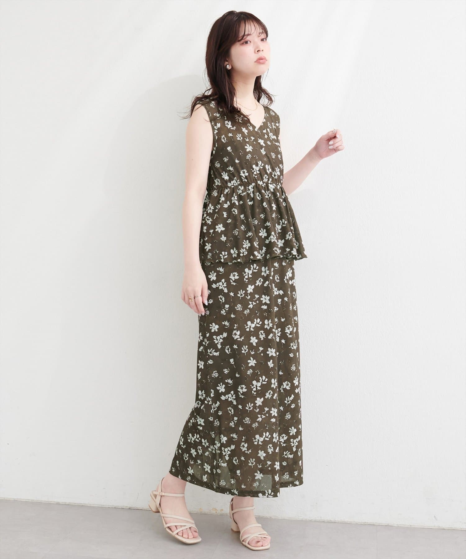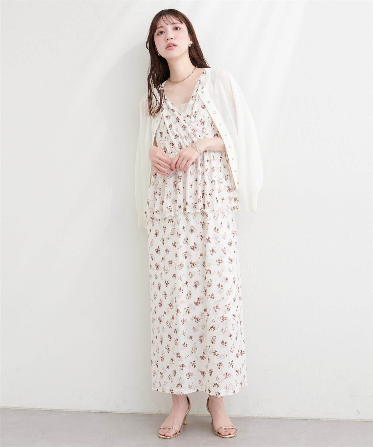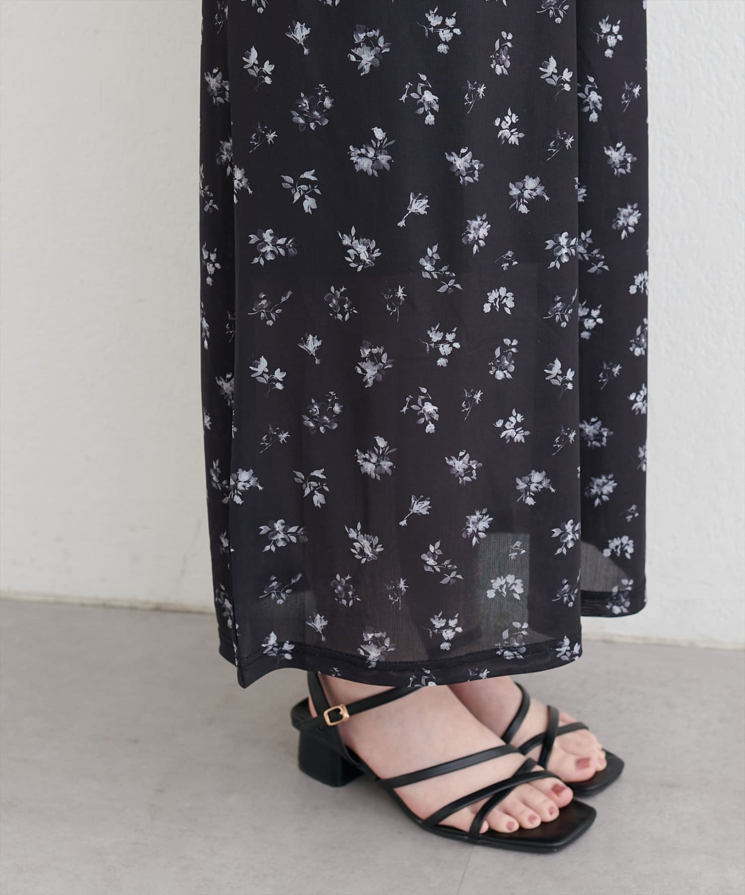 足元は、パンプスやサンダルを合わせて、フェミニンに。