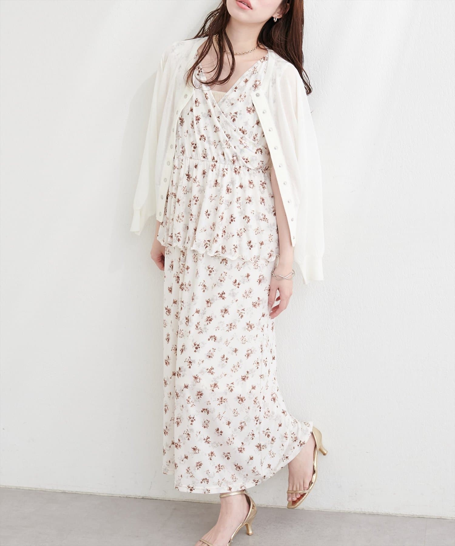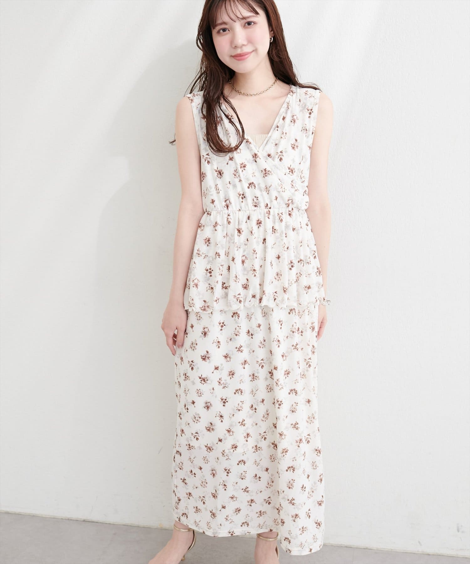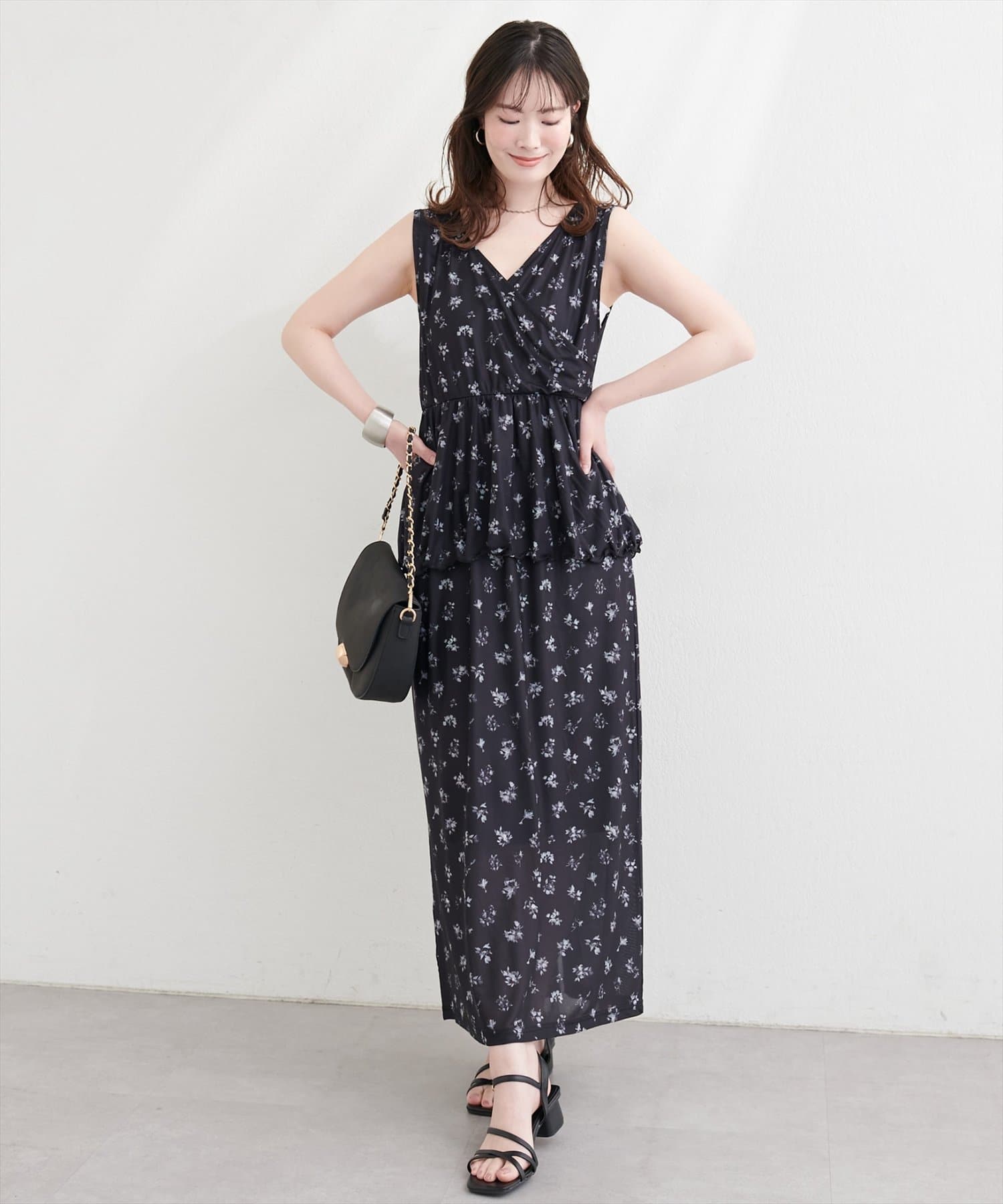 足元は、パンプスやサンダルを合わせて、フェミニンに。