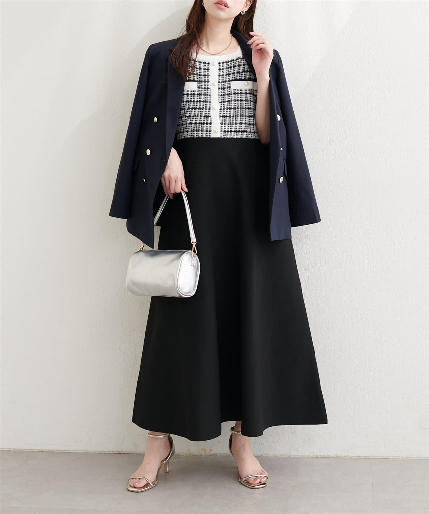 ジャケットやカーディガンを羽織れば、オフィススタイルにも。