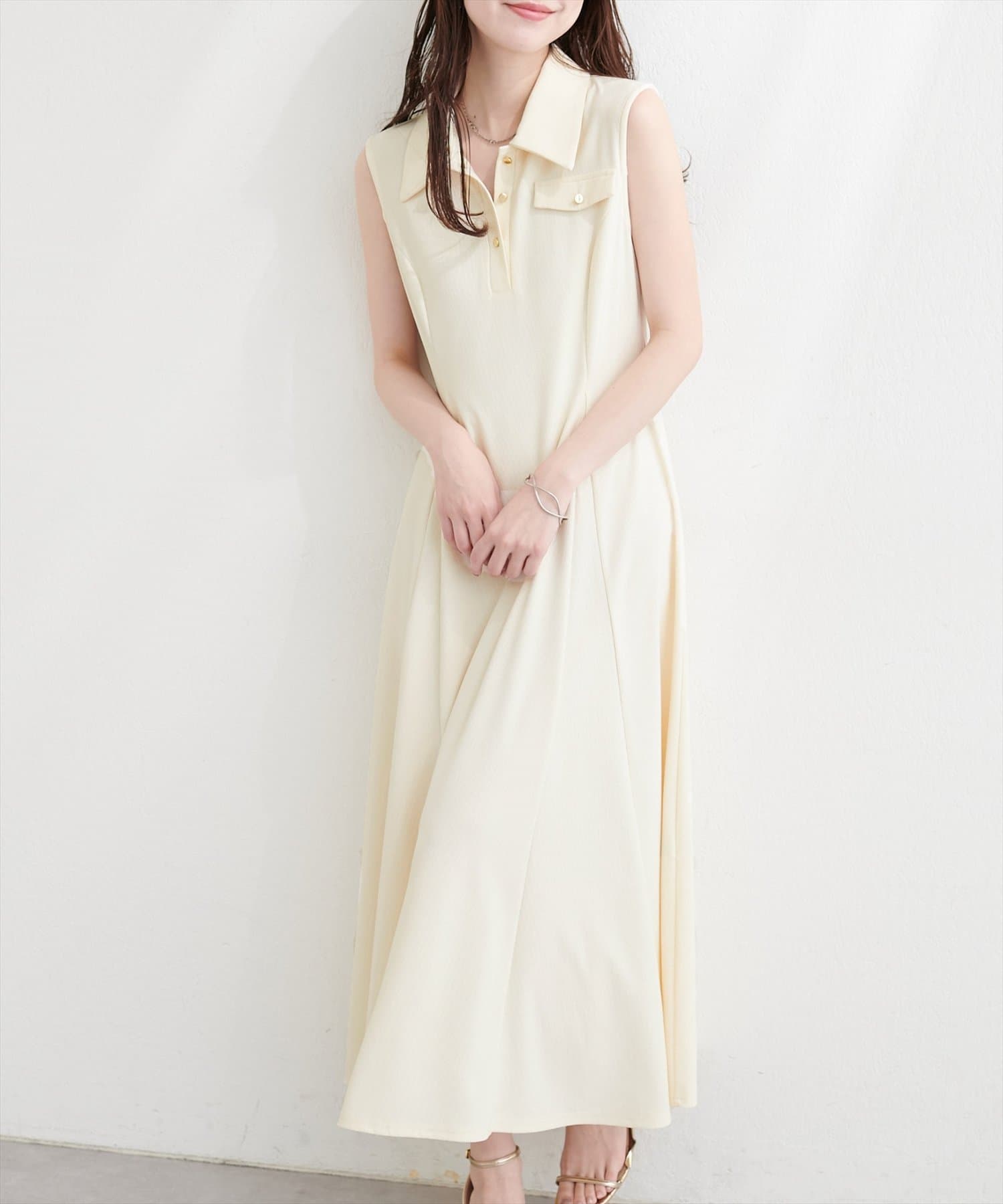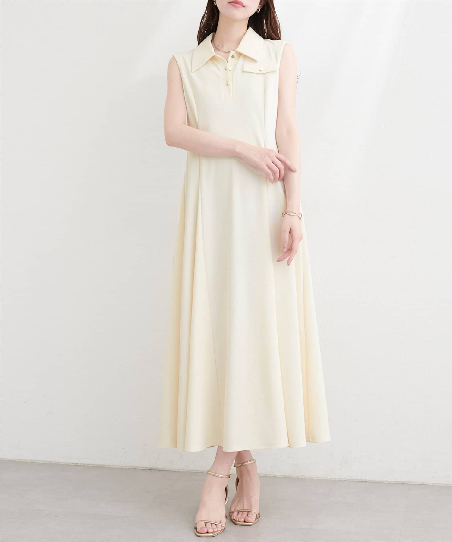 美しく広がるフレアシルエットが、女性らしさを際立たせるノースリーブワンピース。