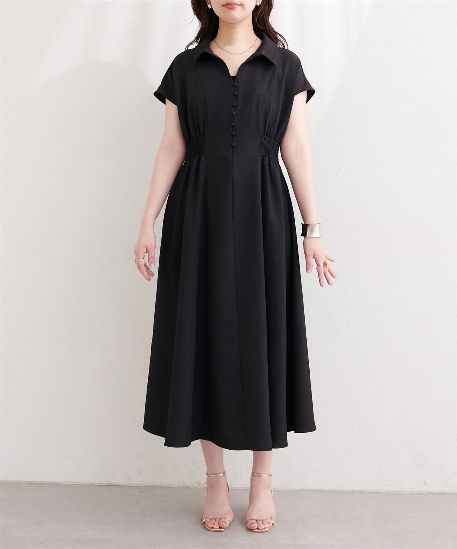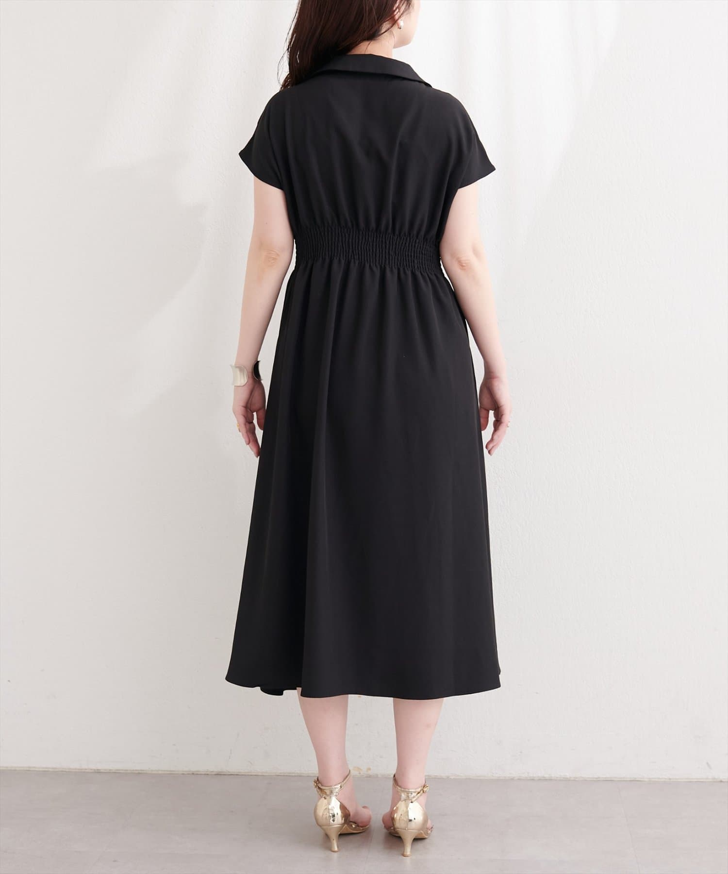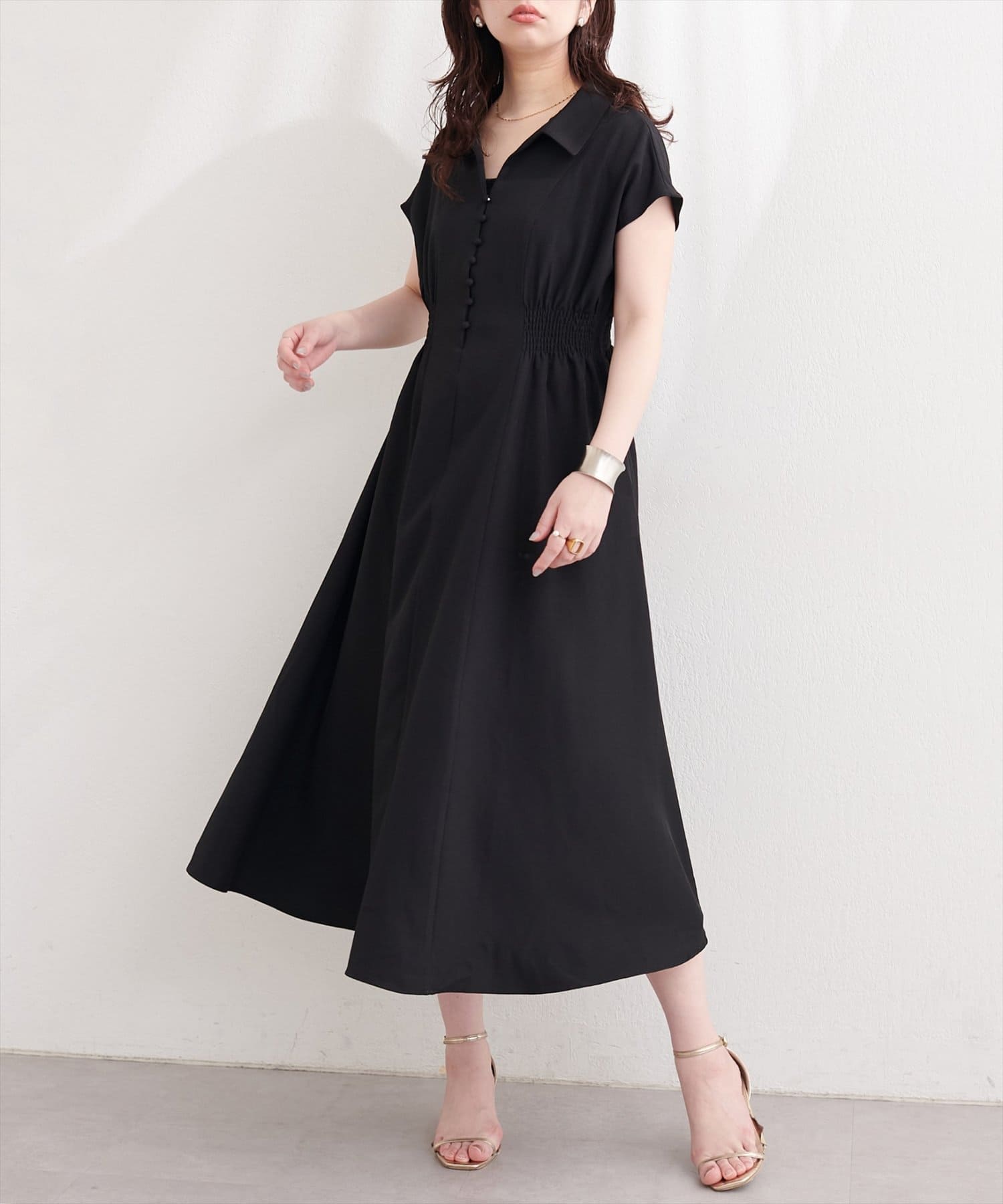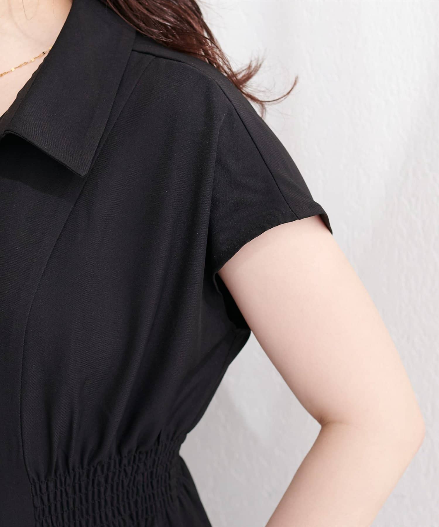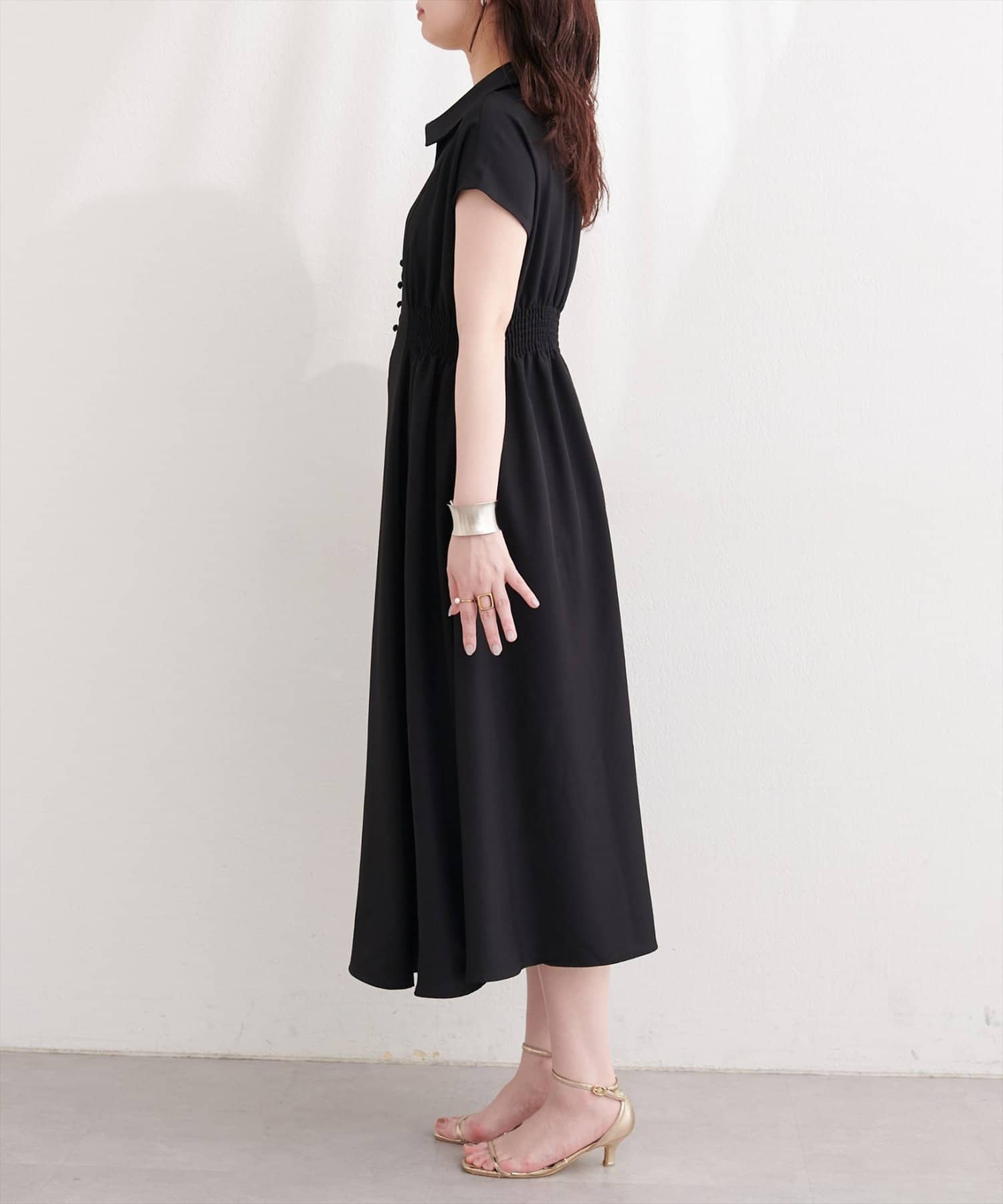ウエスト部分に施されたシャーリングが、さりげなくスタイルアップを叶え、美しいシルエットを演出します。