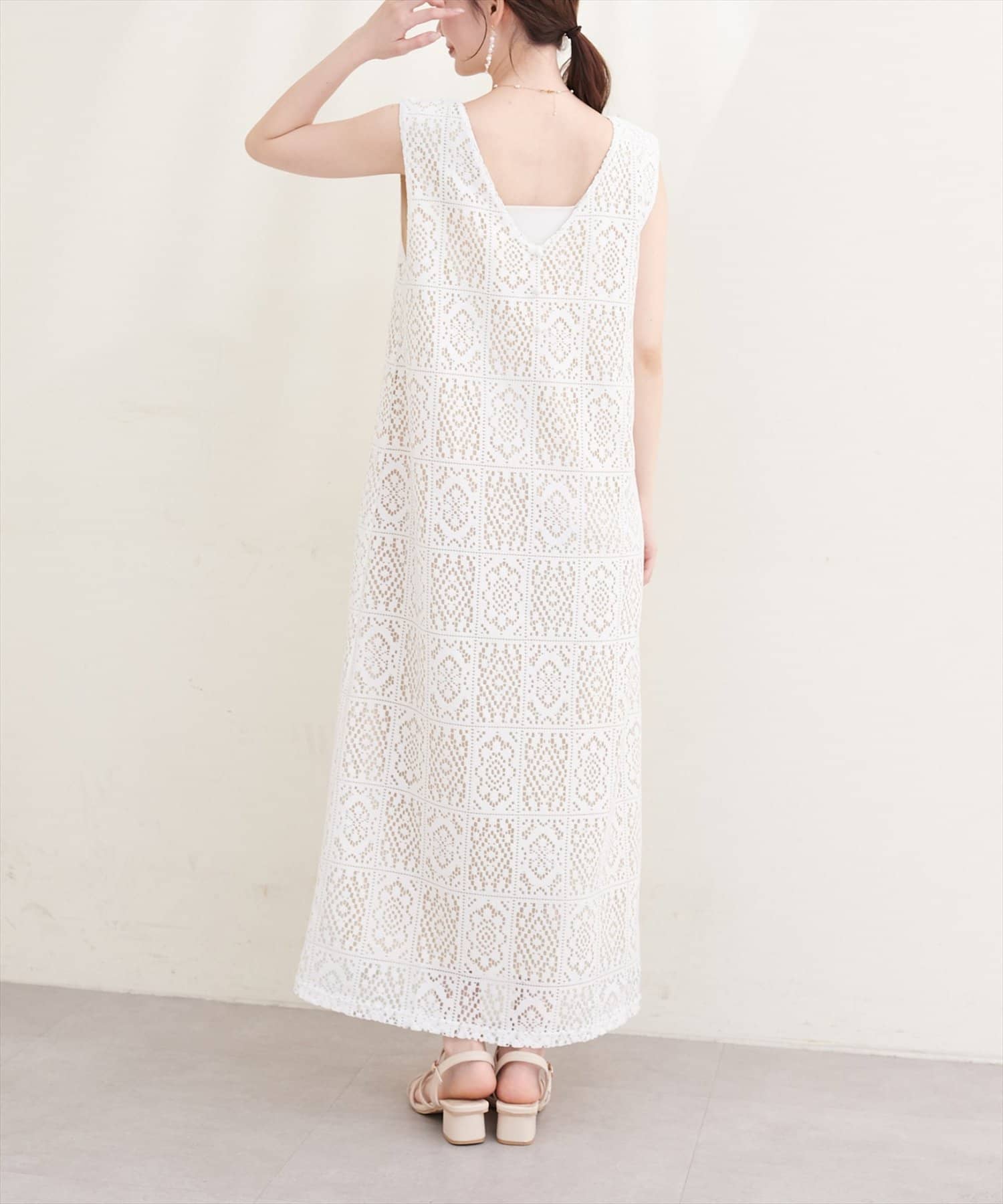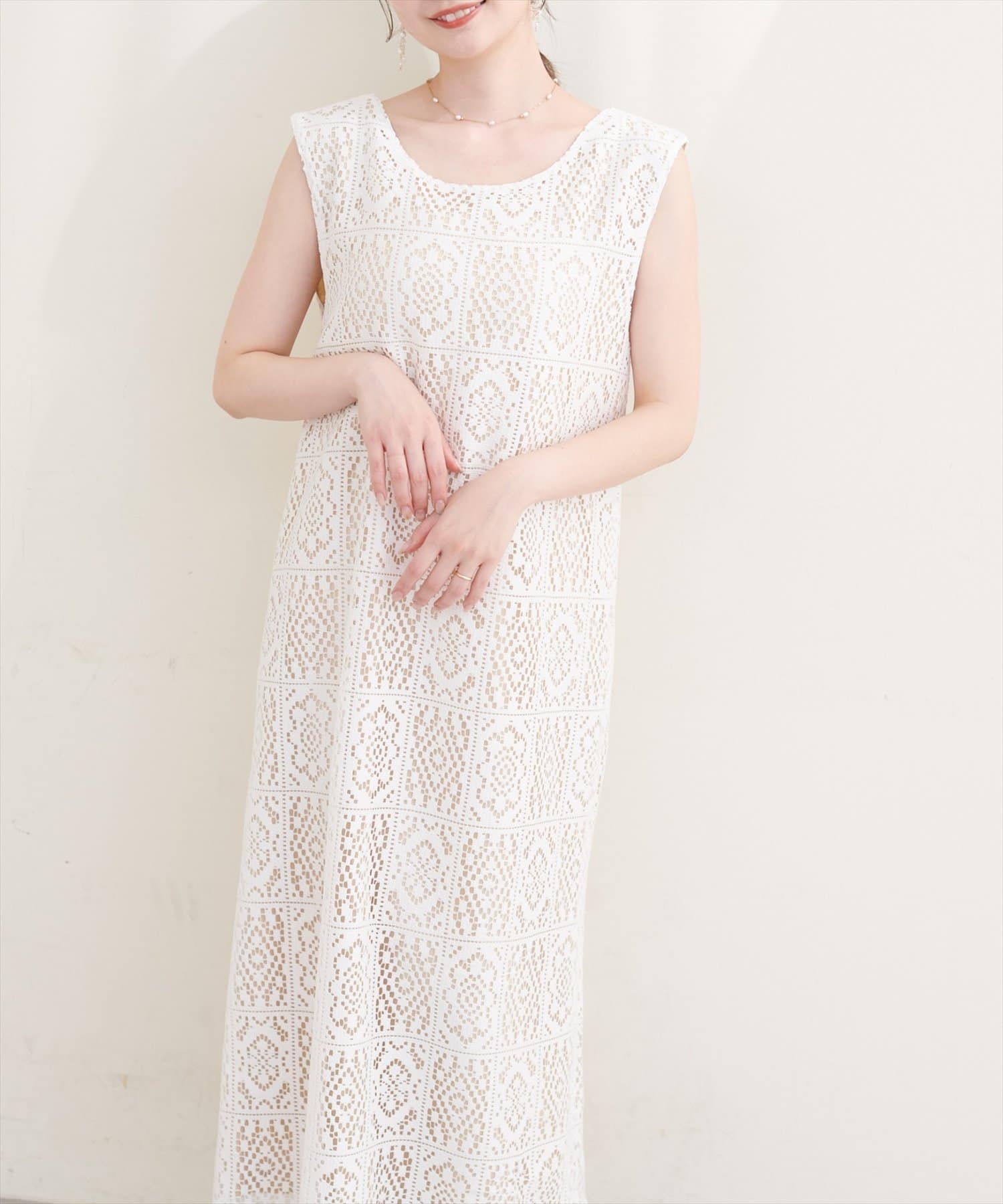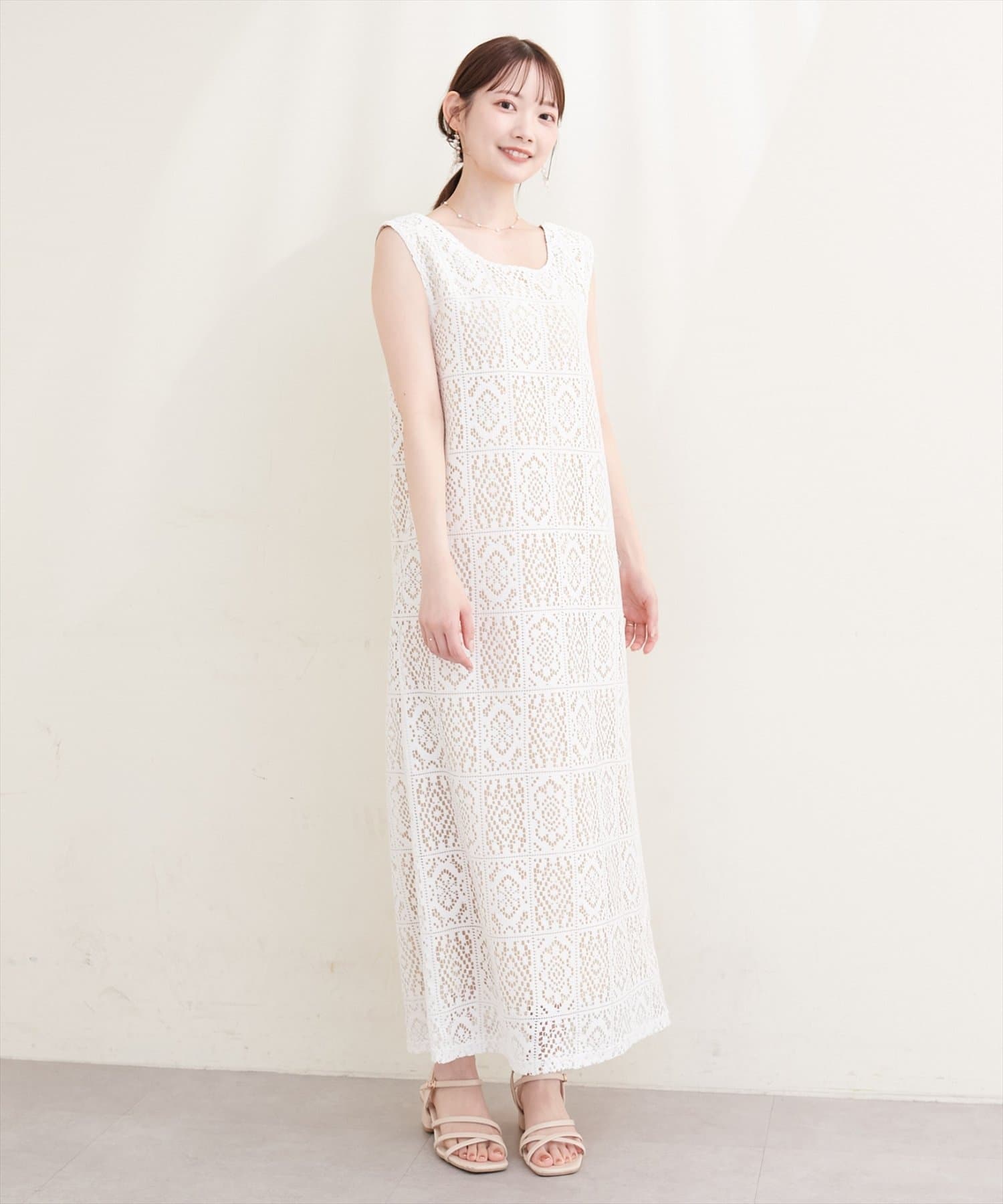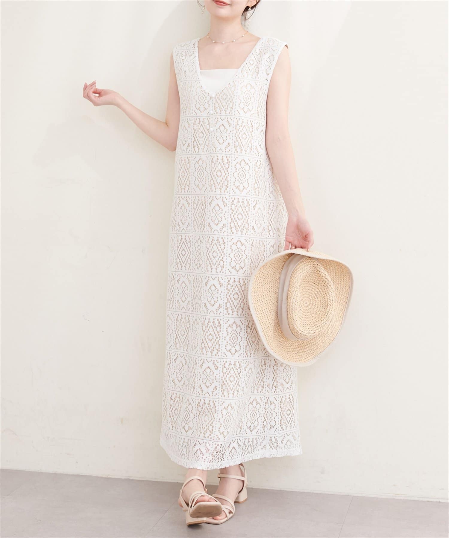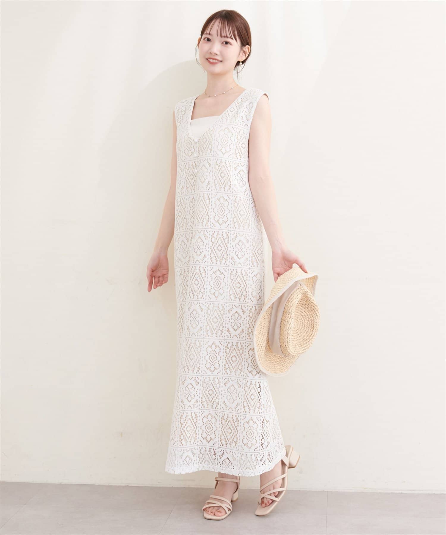 シンプルなIラインのシルエットに、レースの抜け感がプラスされ、この夏に活躍するワンピースです。