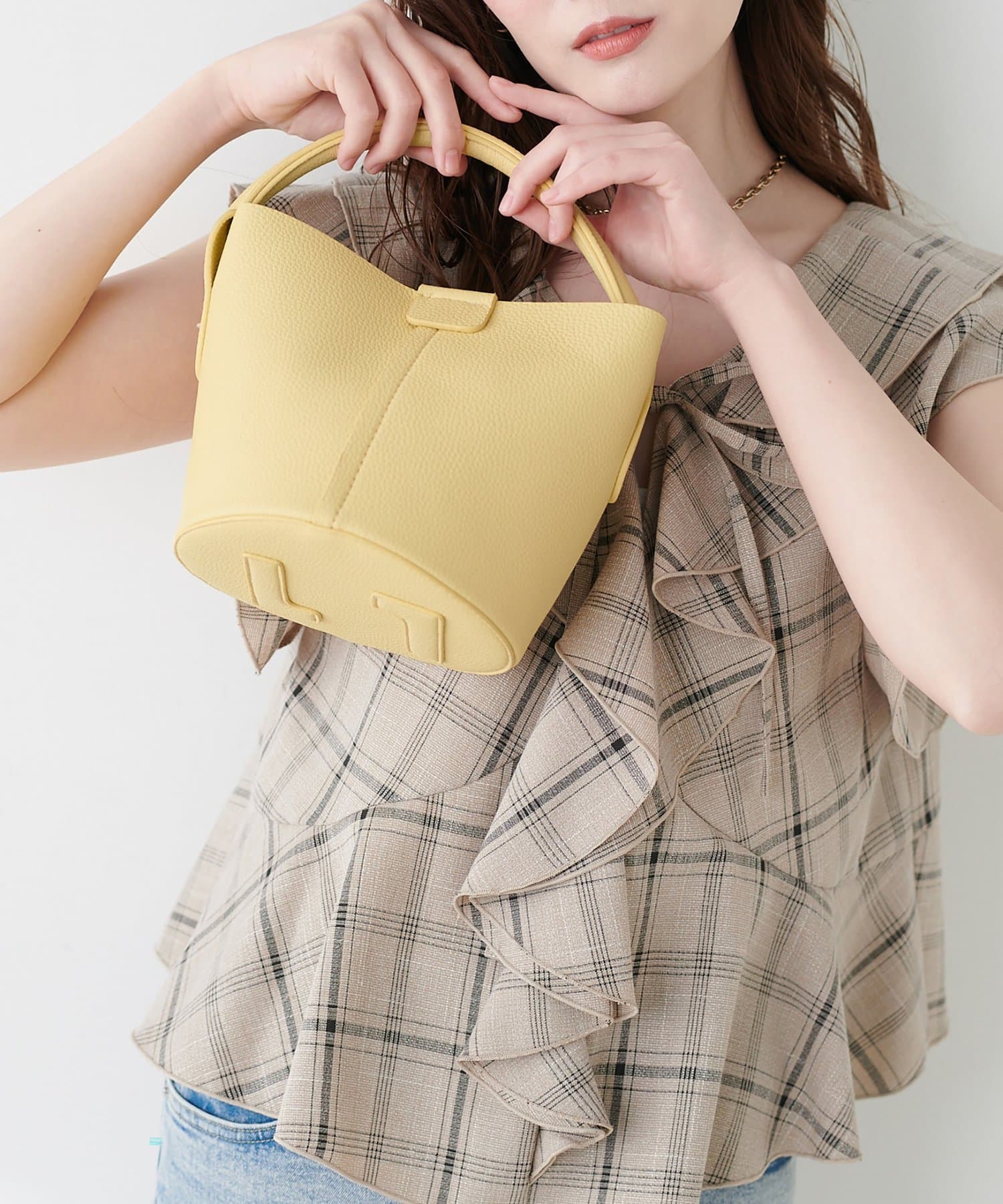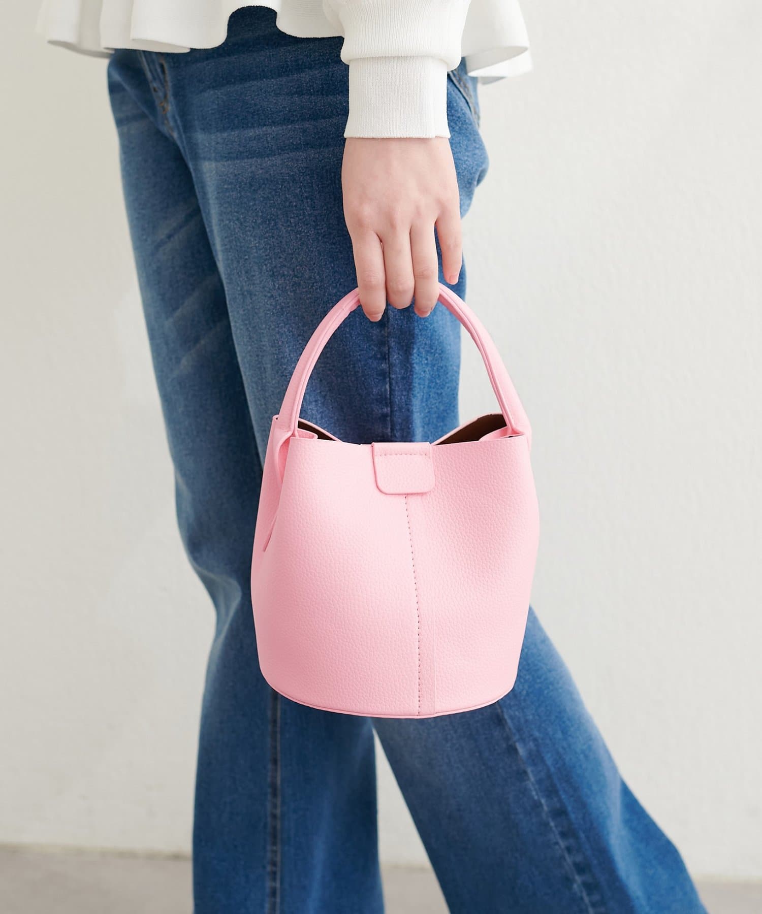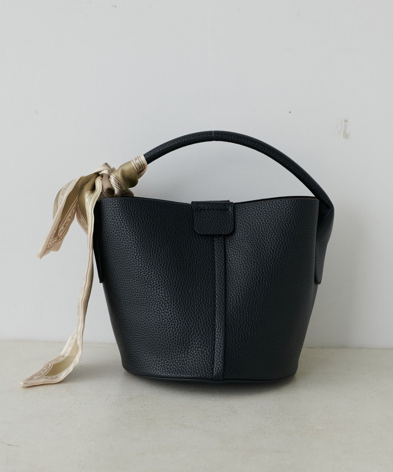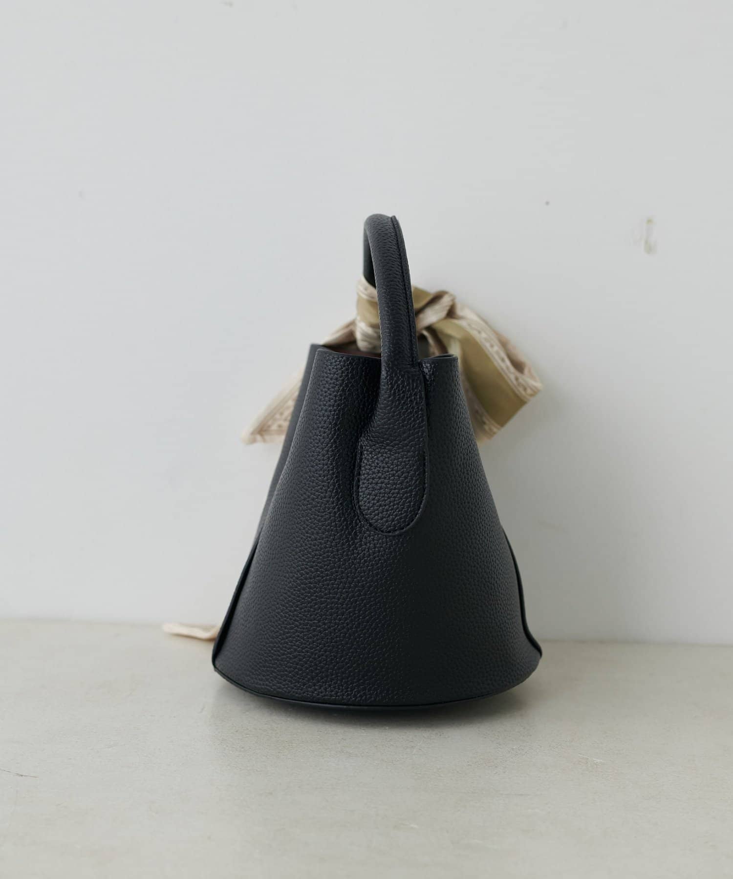 ころんとしたフォルムが愛らしいバケツ型デザインは、持つだけで女性らしさを引き立てます。