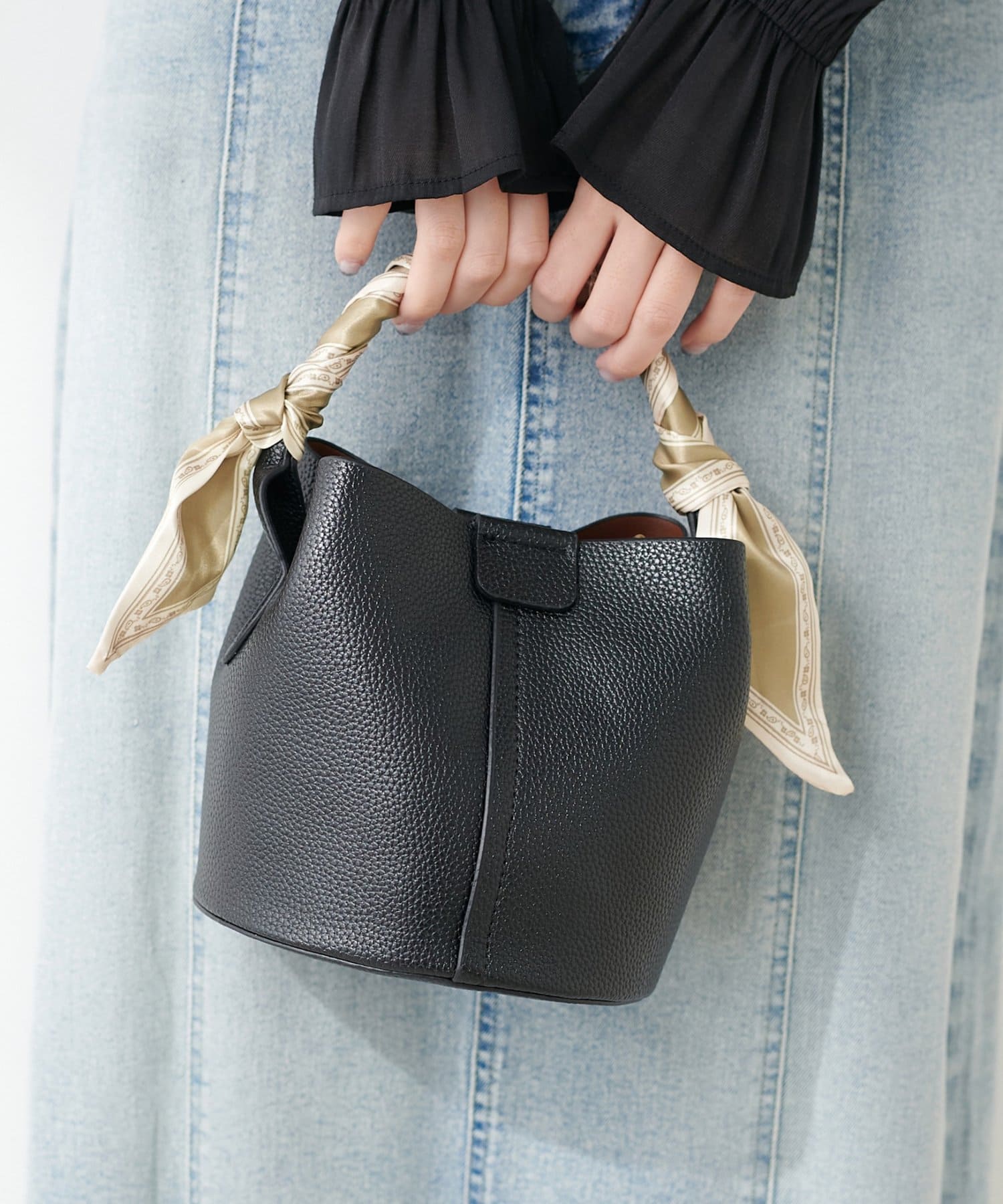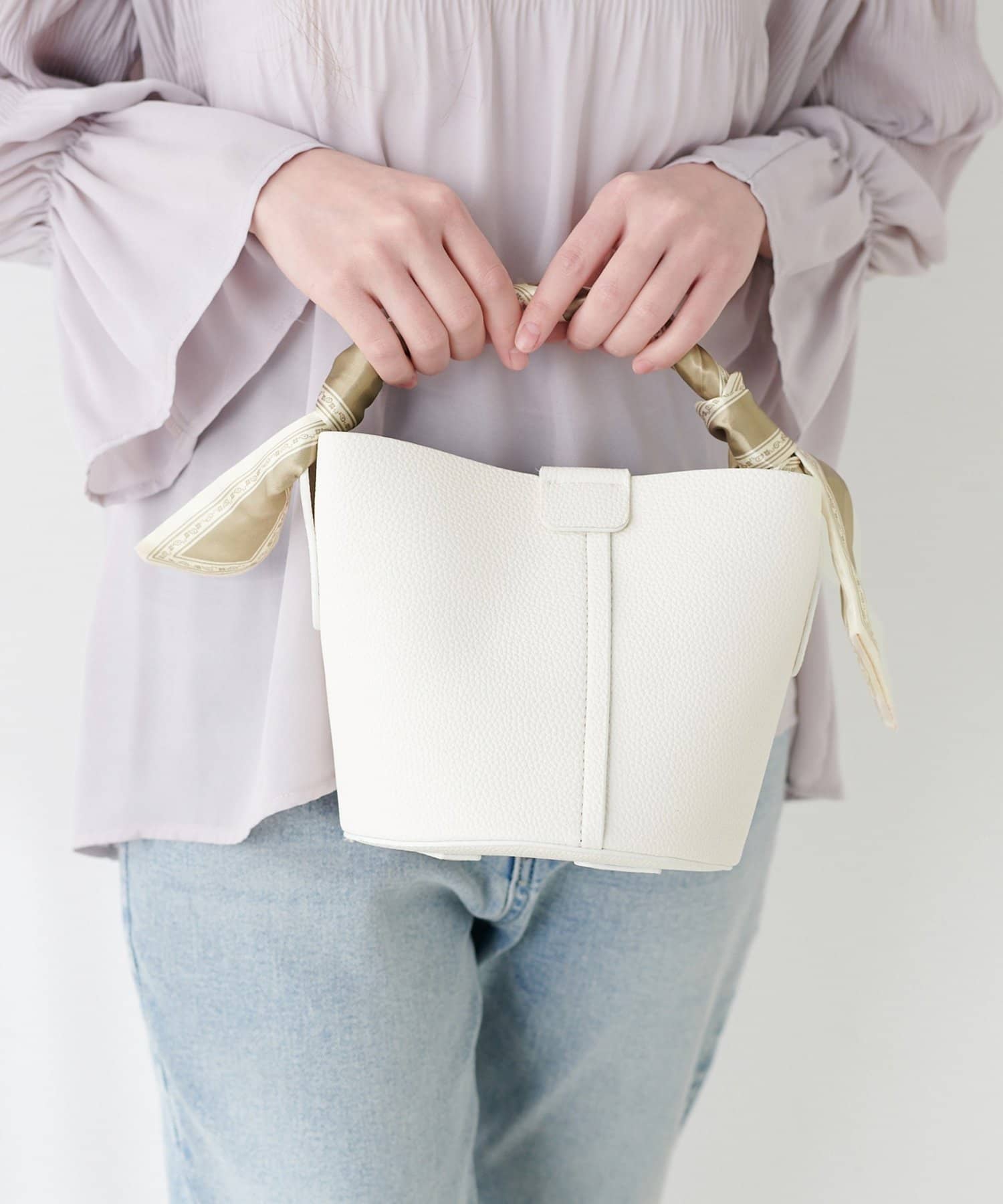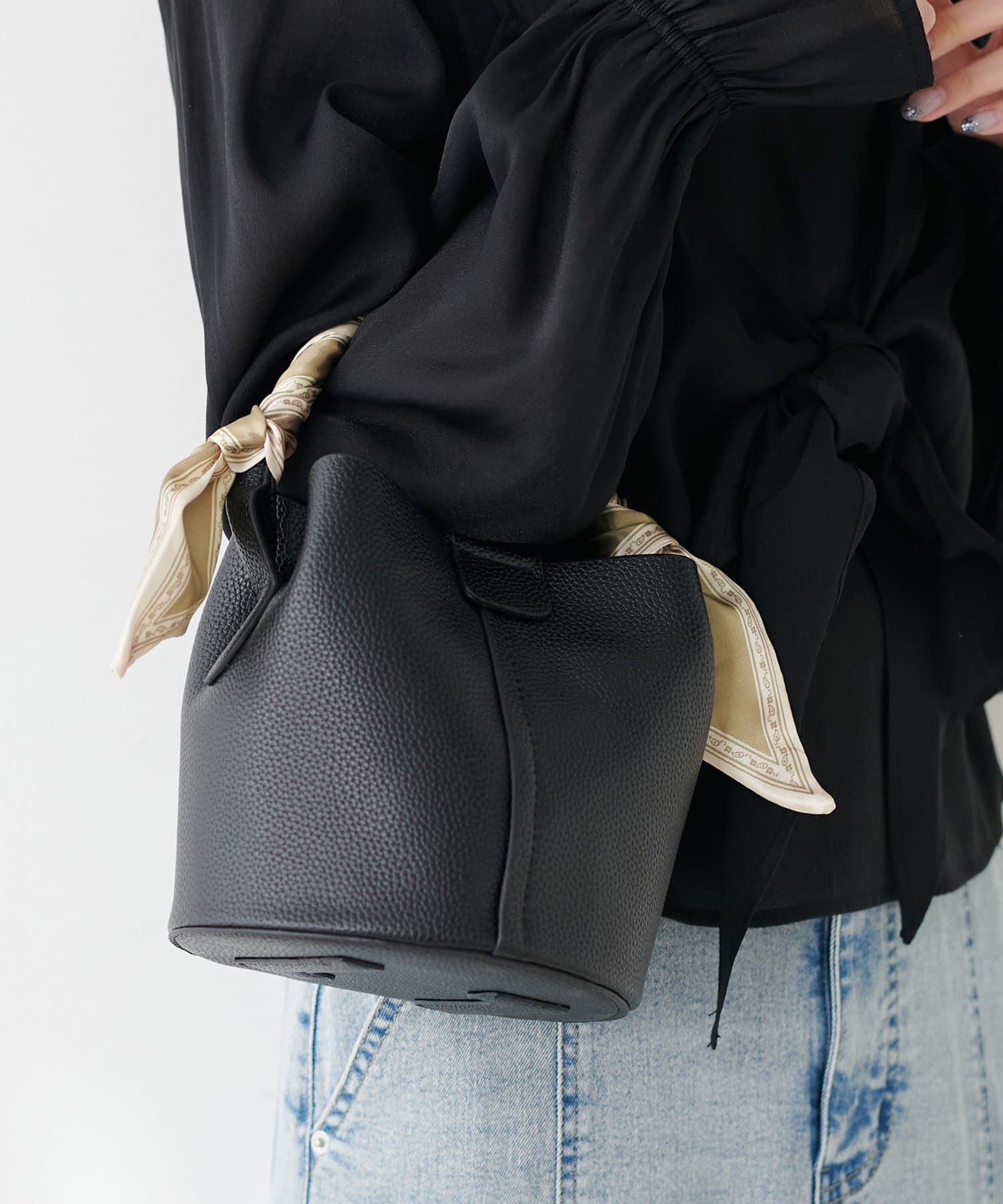ころんとしたフォルムが愛らしいバケツ型デザインは、持つだけで女性らしさを引き立てます。