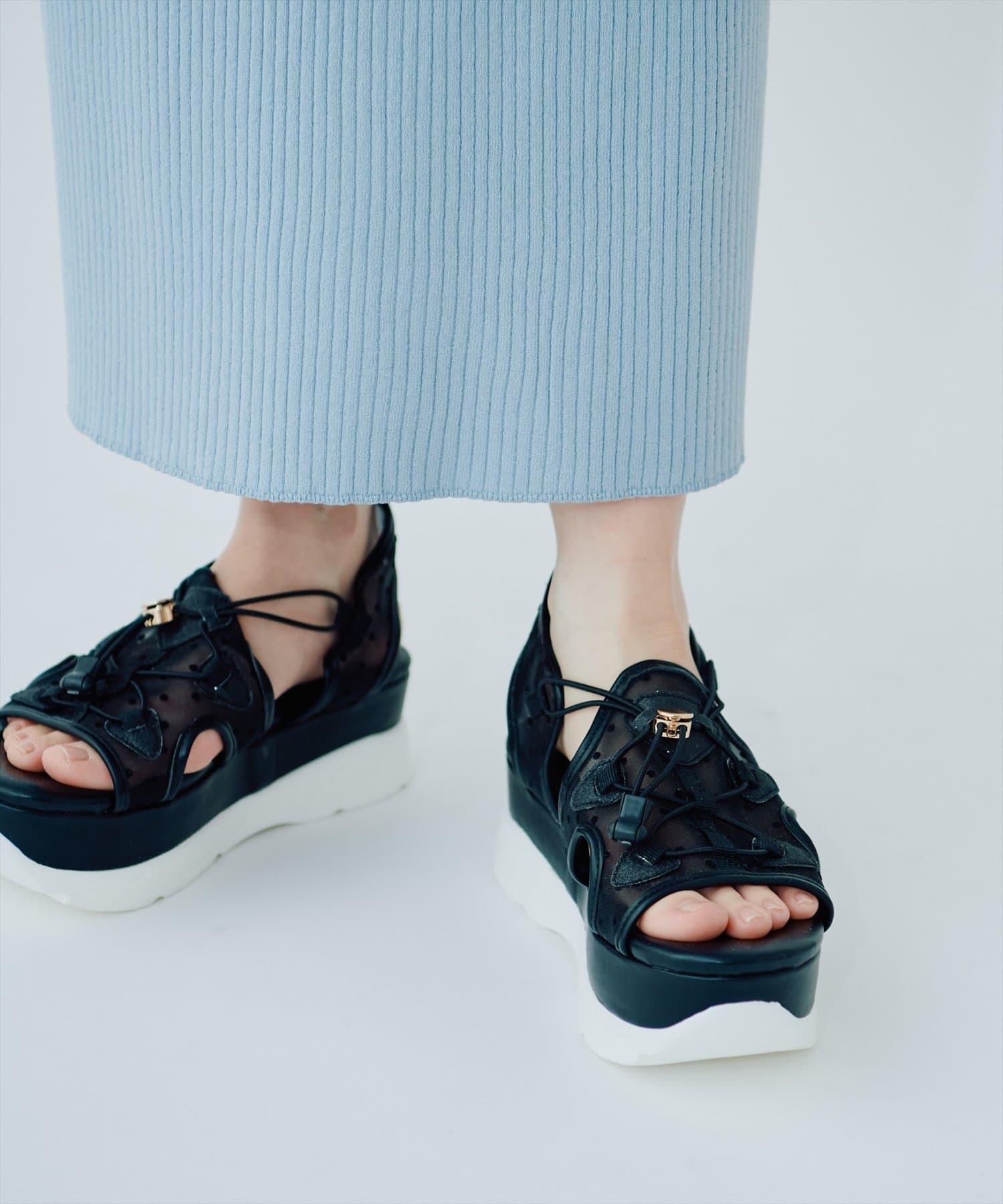 繊細なチュール素材をアッパーにあしらい、足元に軽やかさと抜け感をプラス。