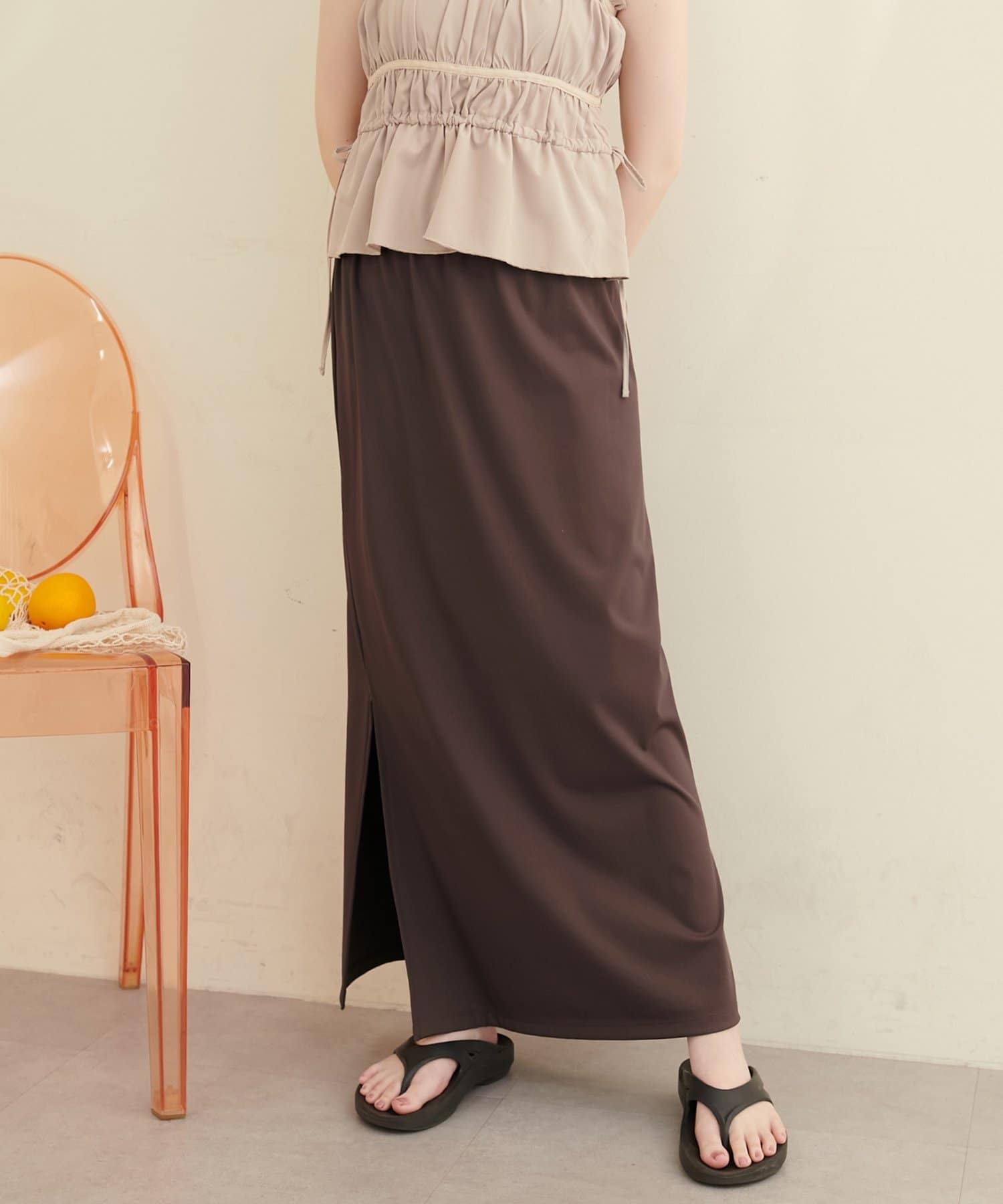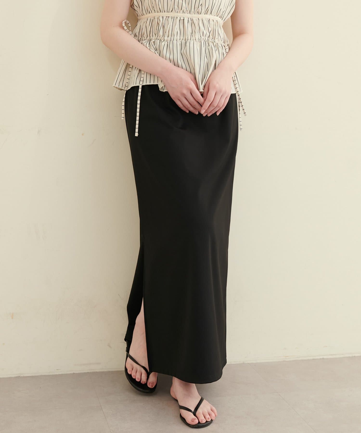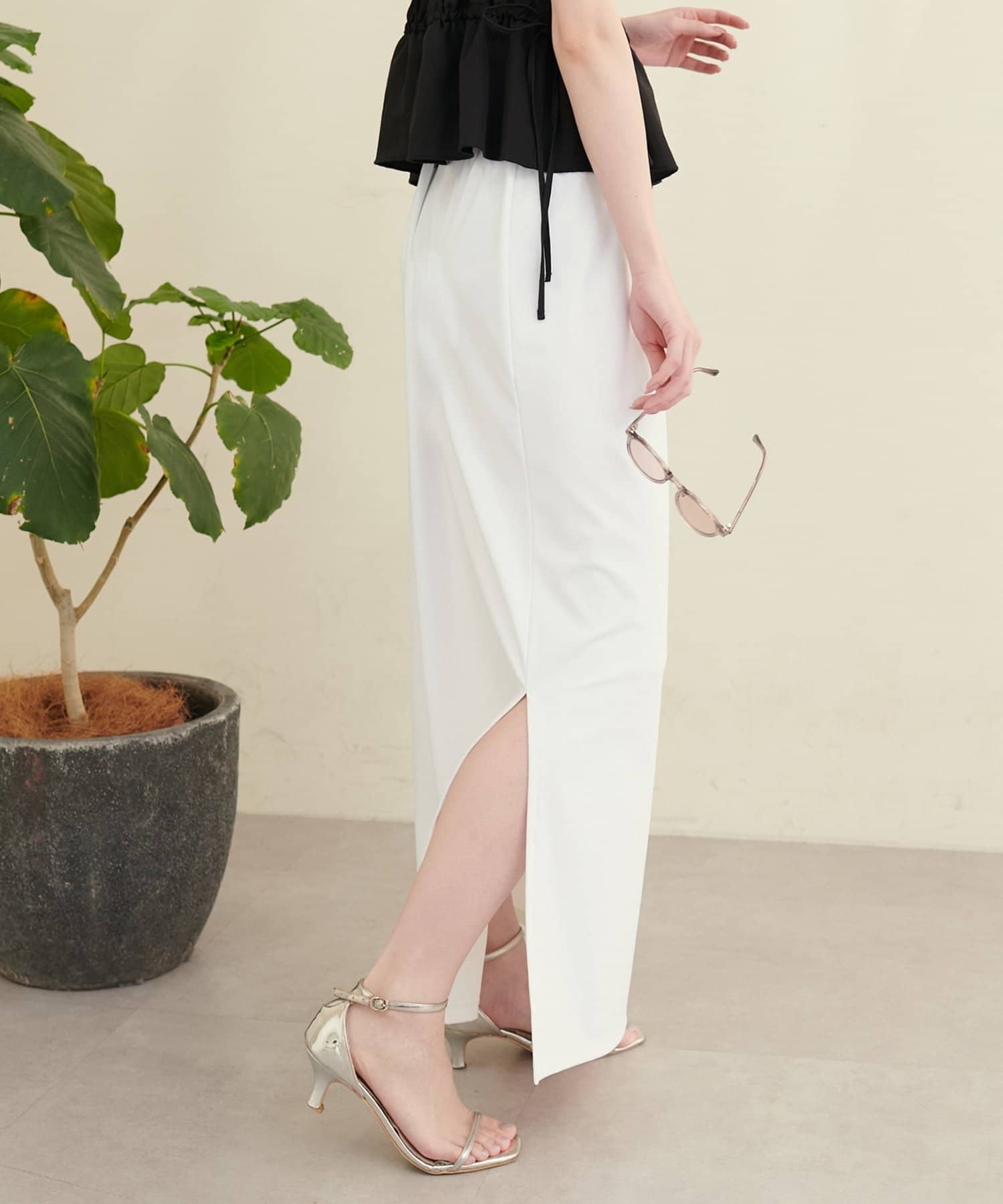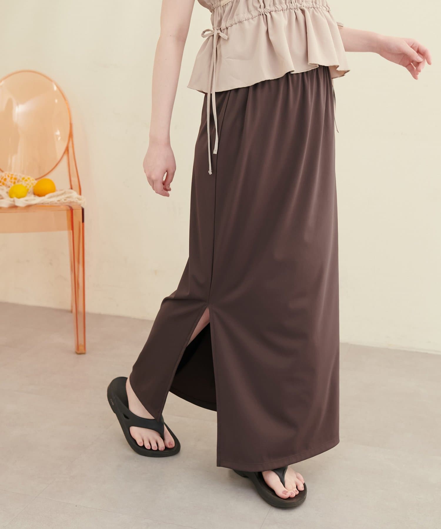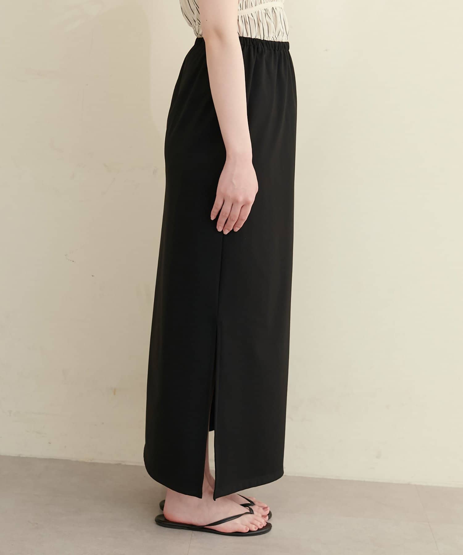 深めのスリットは、足元をすっきりと見せ、スタイルアップ効果も期待できます。