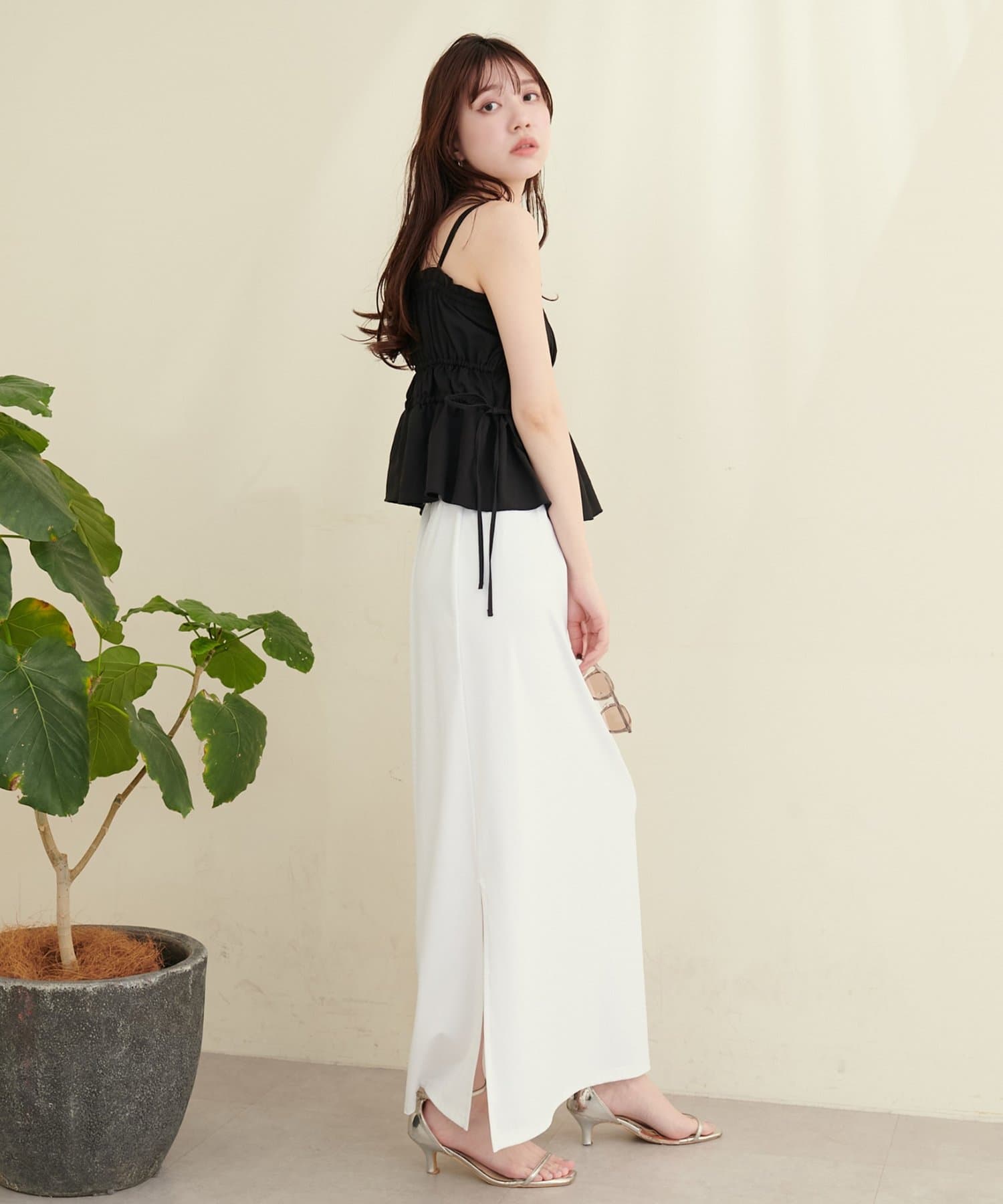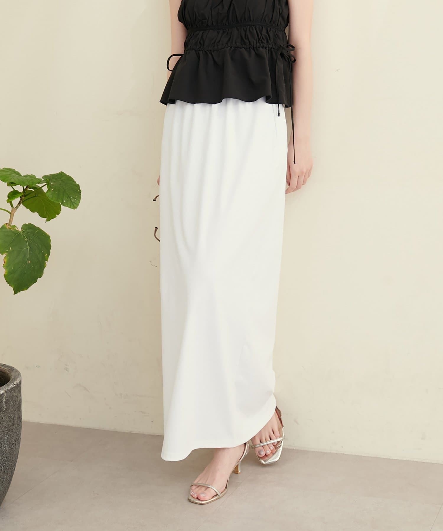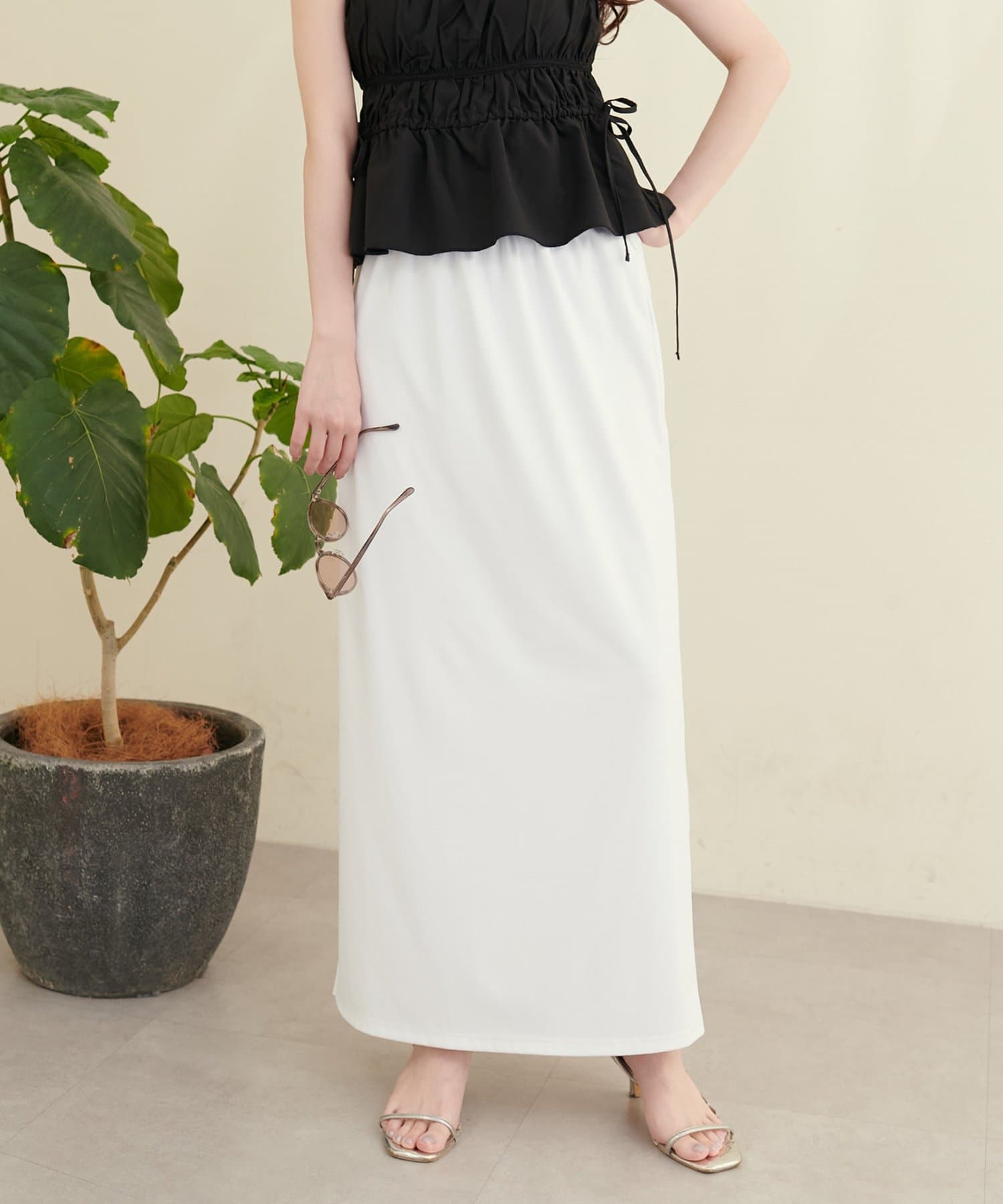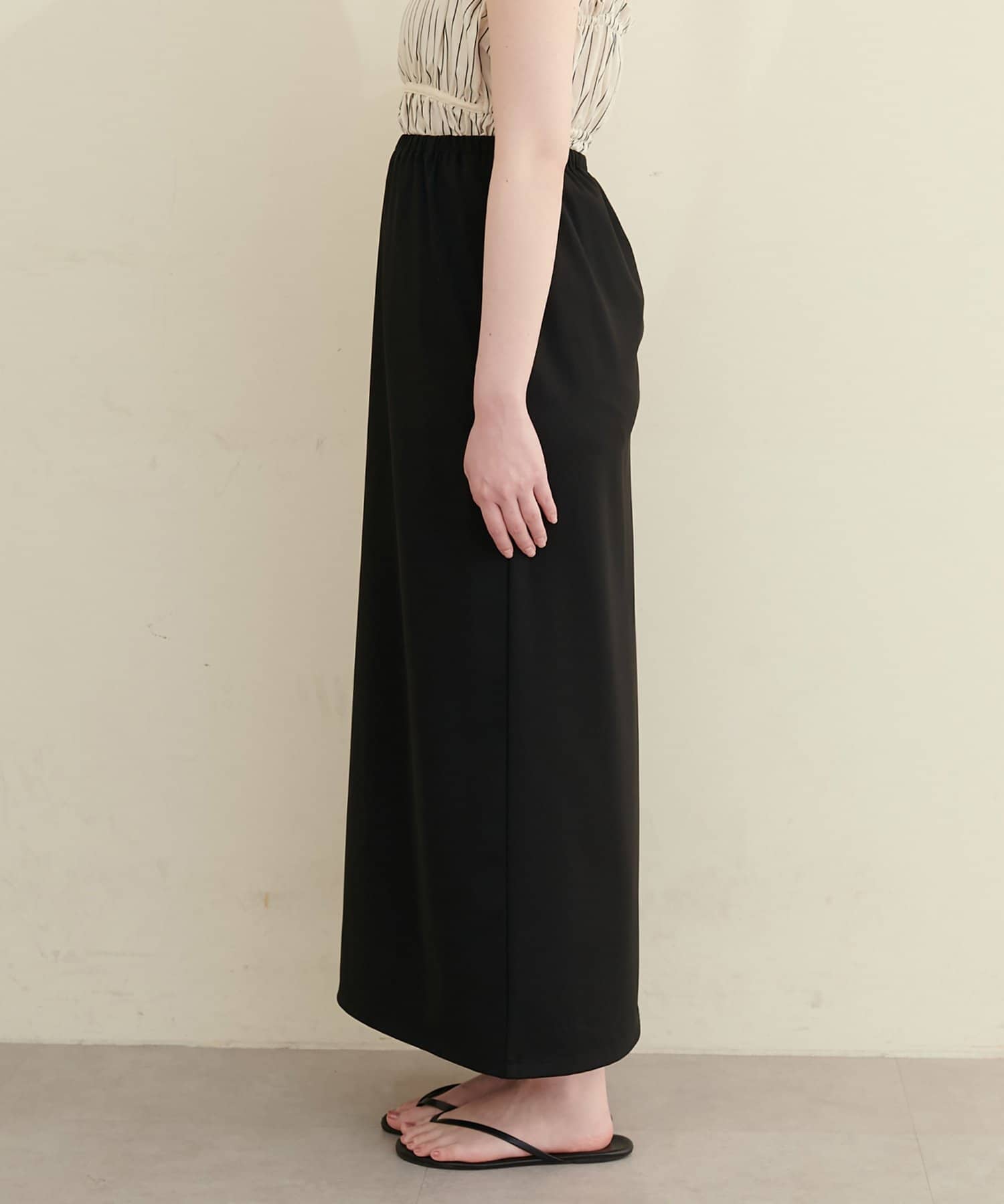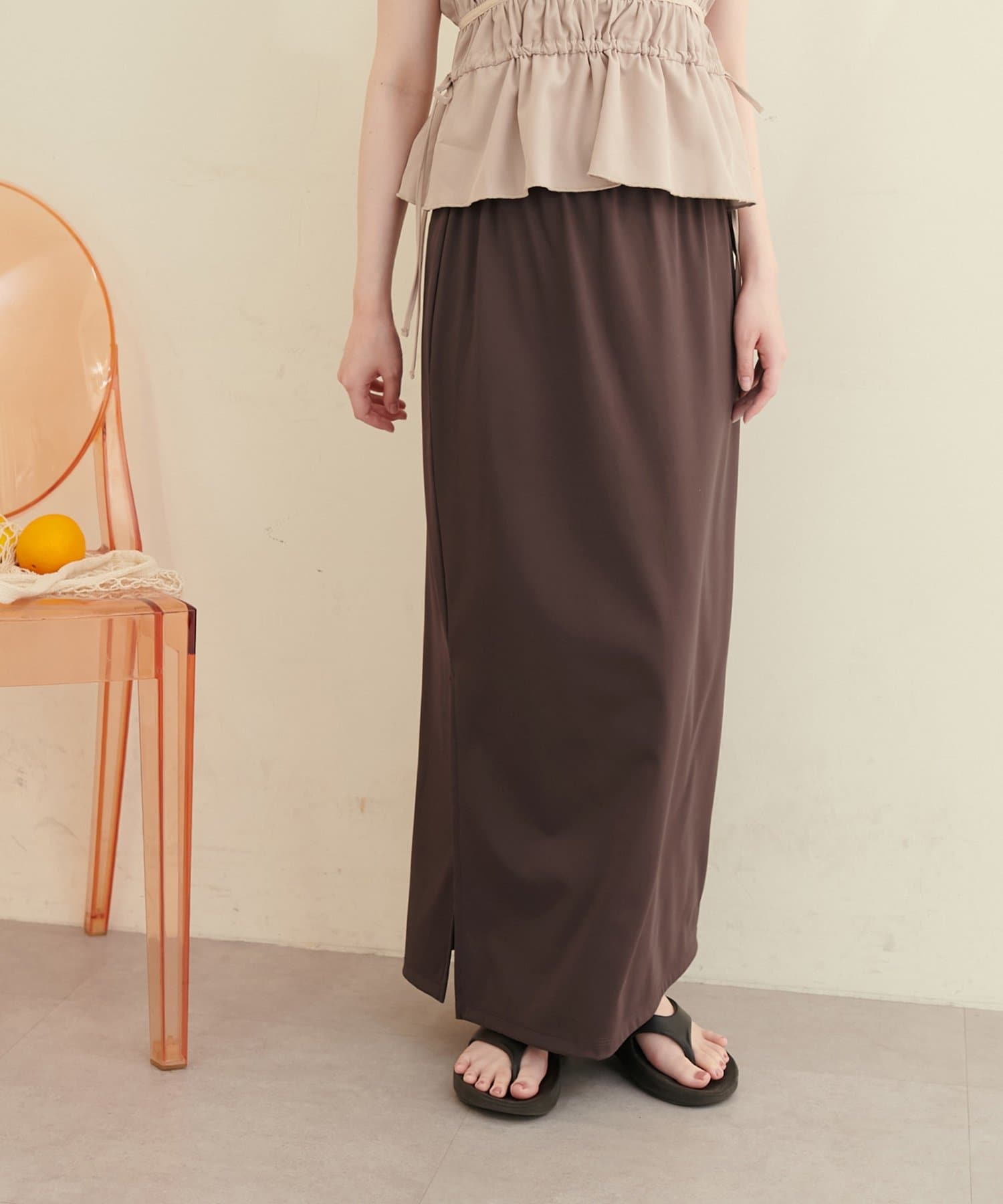 深めのスリットは、足元をすっきりと見せ、スタイルアップ効果も期待できます。