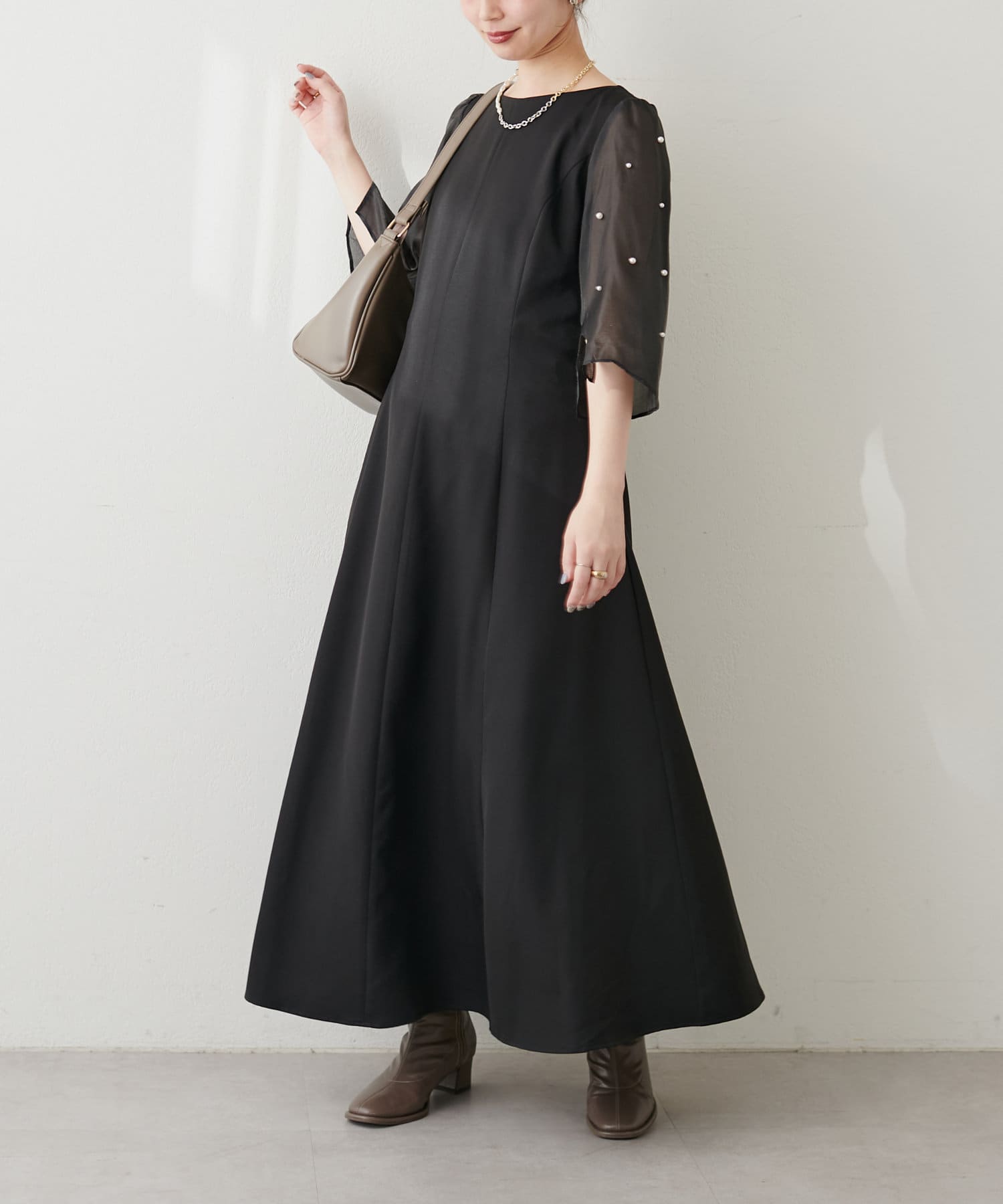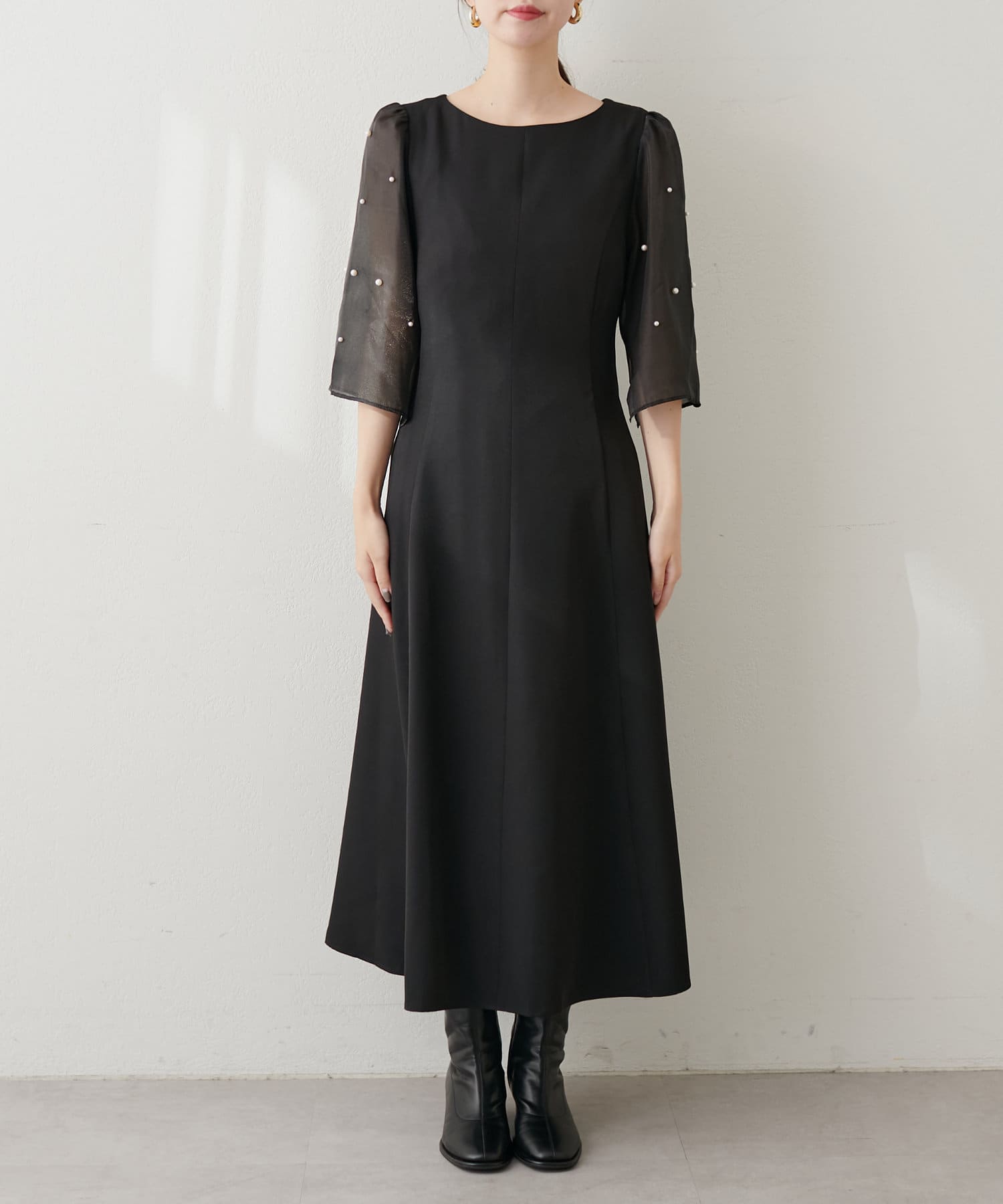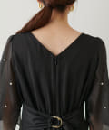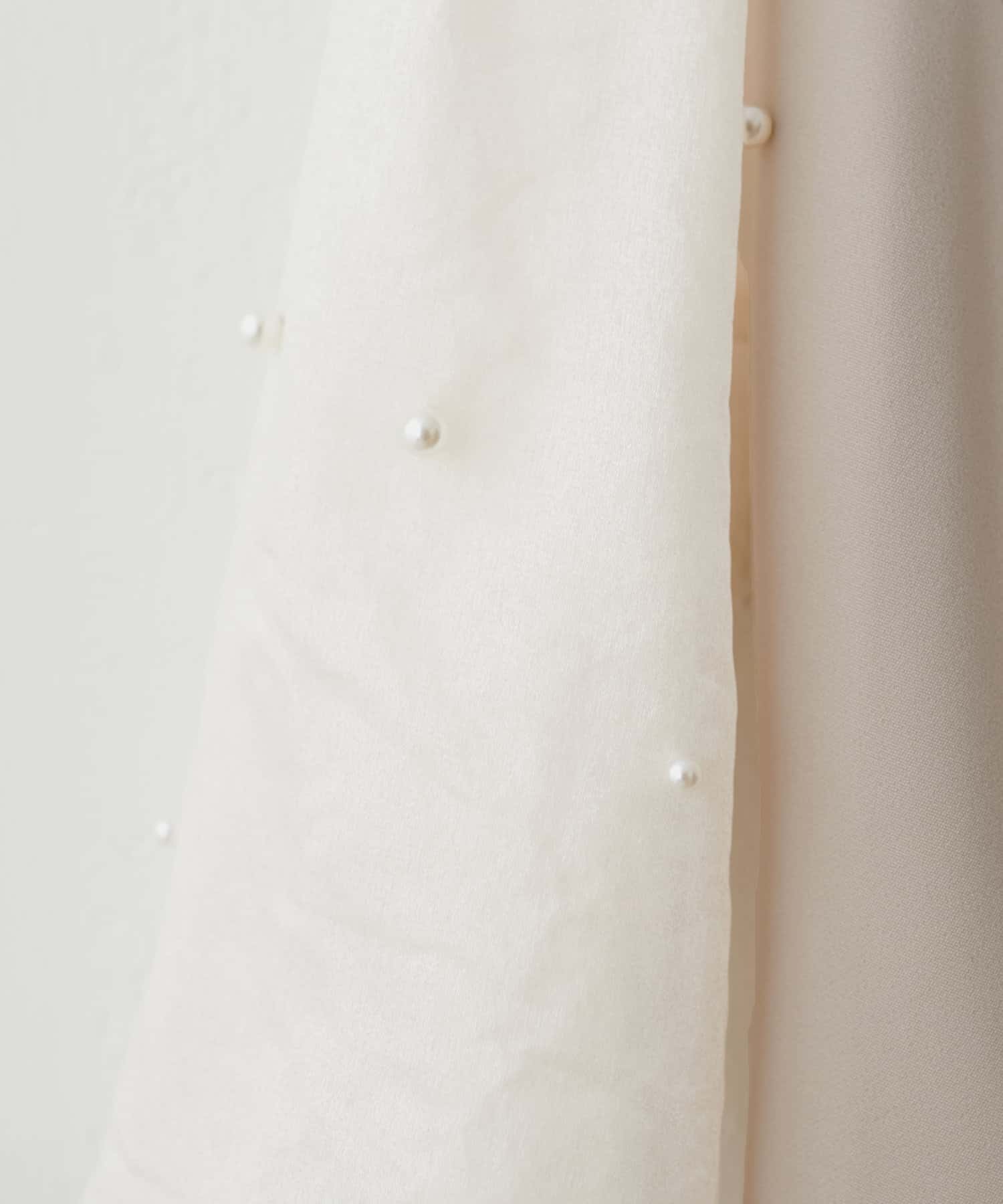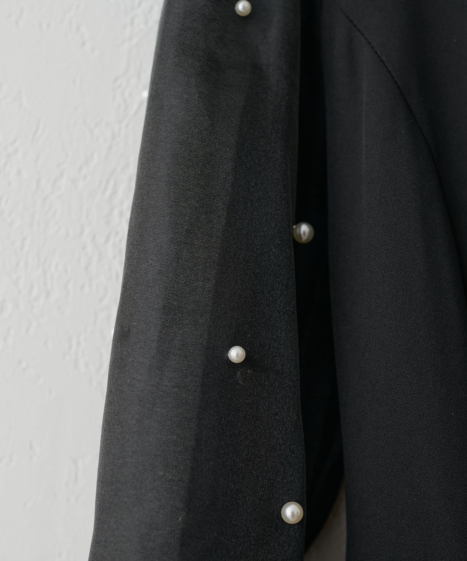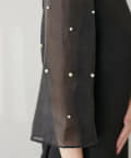 きらっとしたシアー素材の袖には、小さめパールをちりばめています。パールはパンチング加工されているため、外れにくい仕様です。