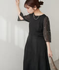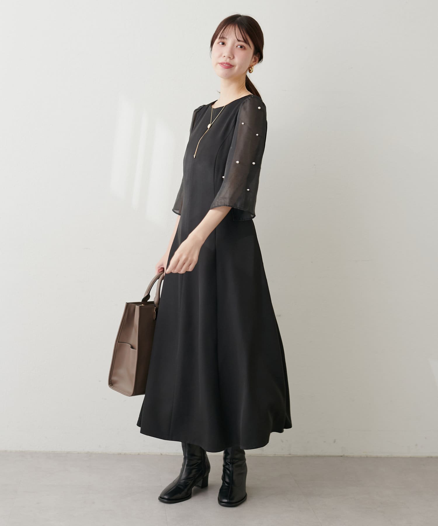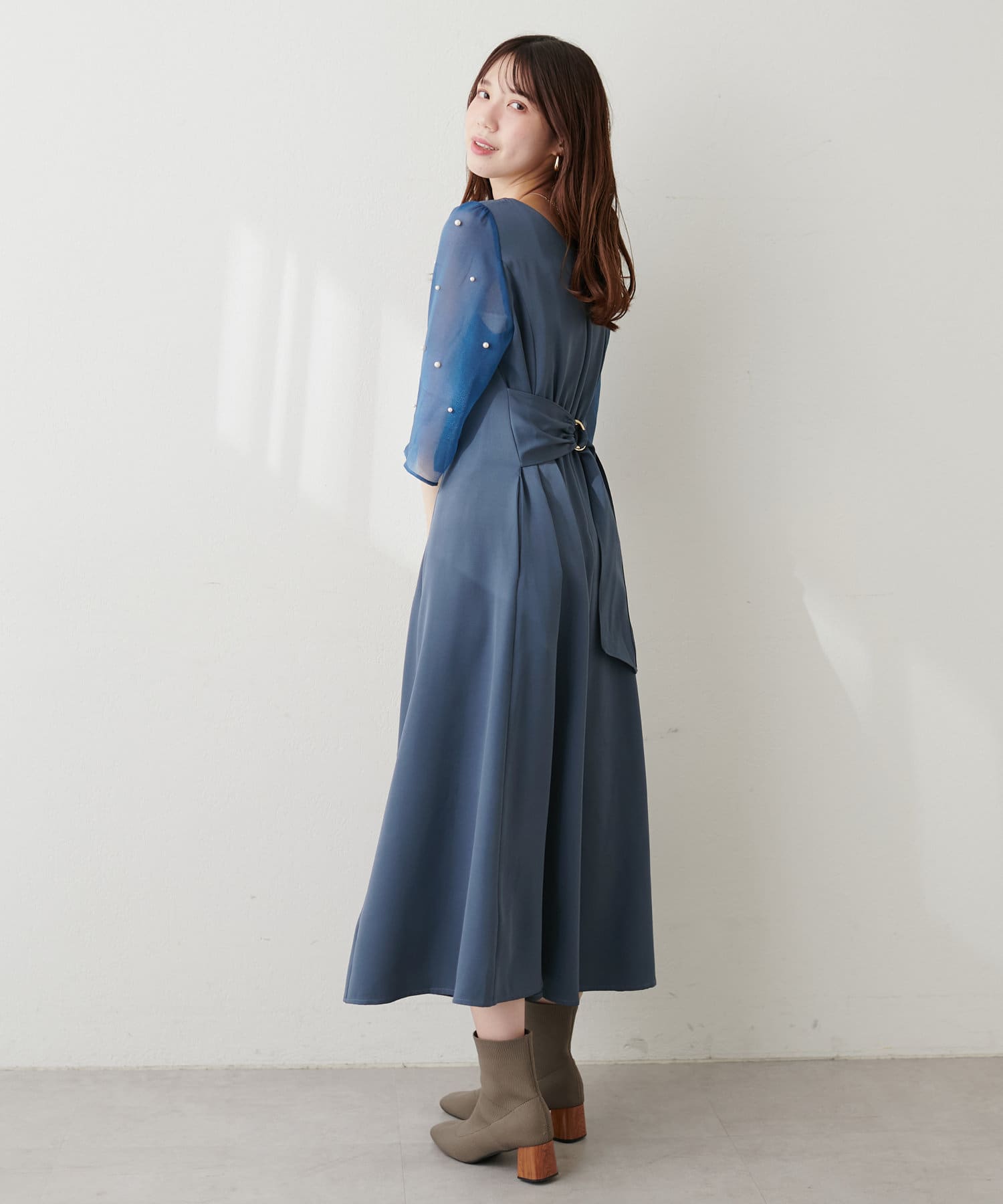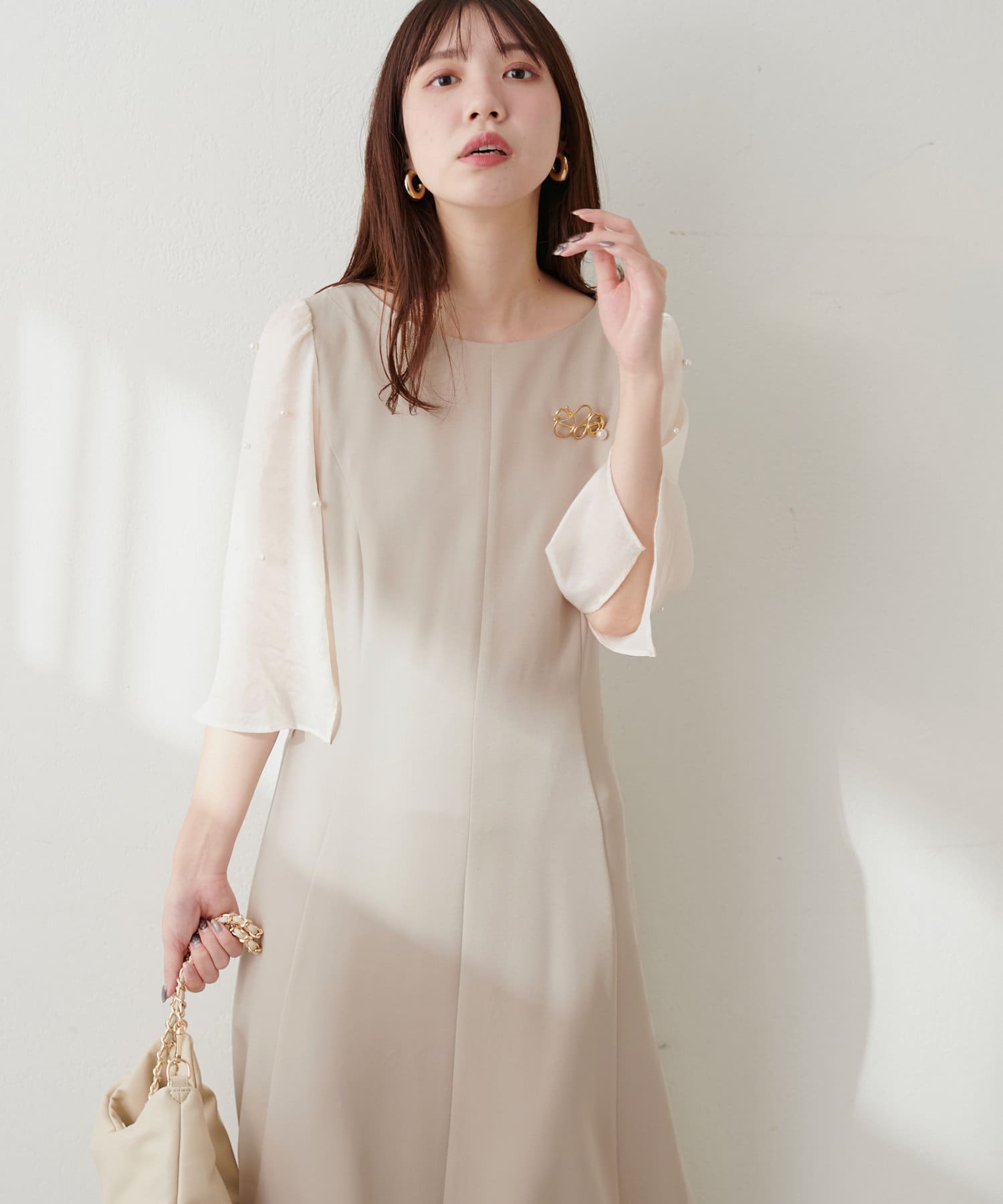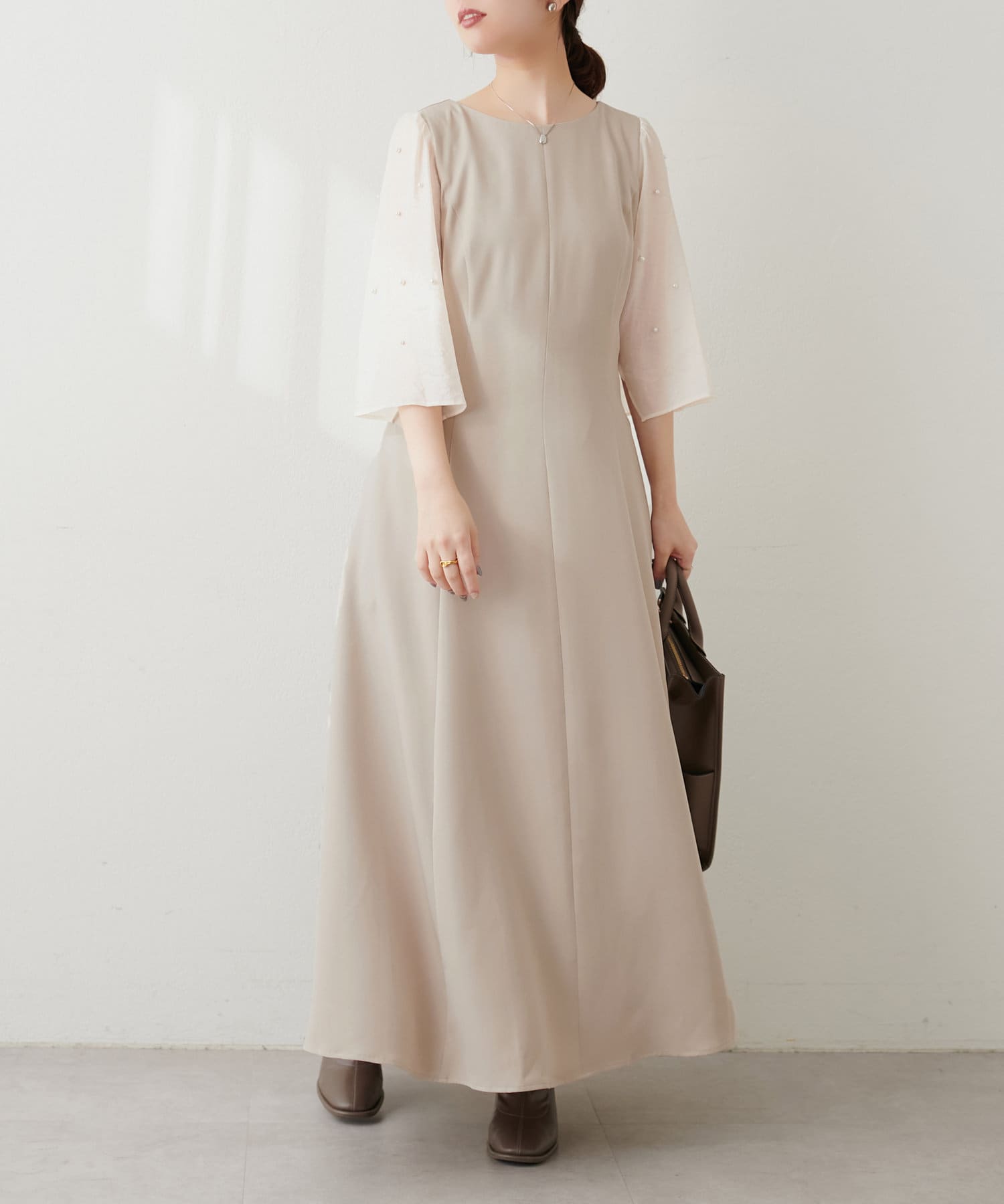 きらっとしたシアー素材の袖には、小さめパールをちりばめています。パールはパンチング加工されているため、外れにくい仕様です。