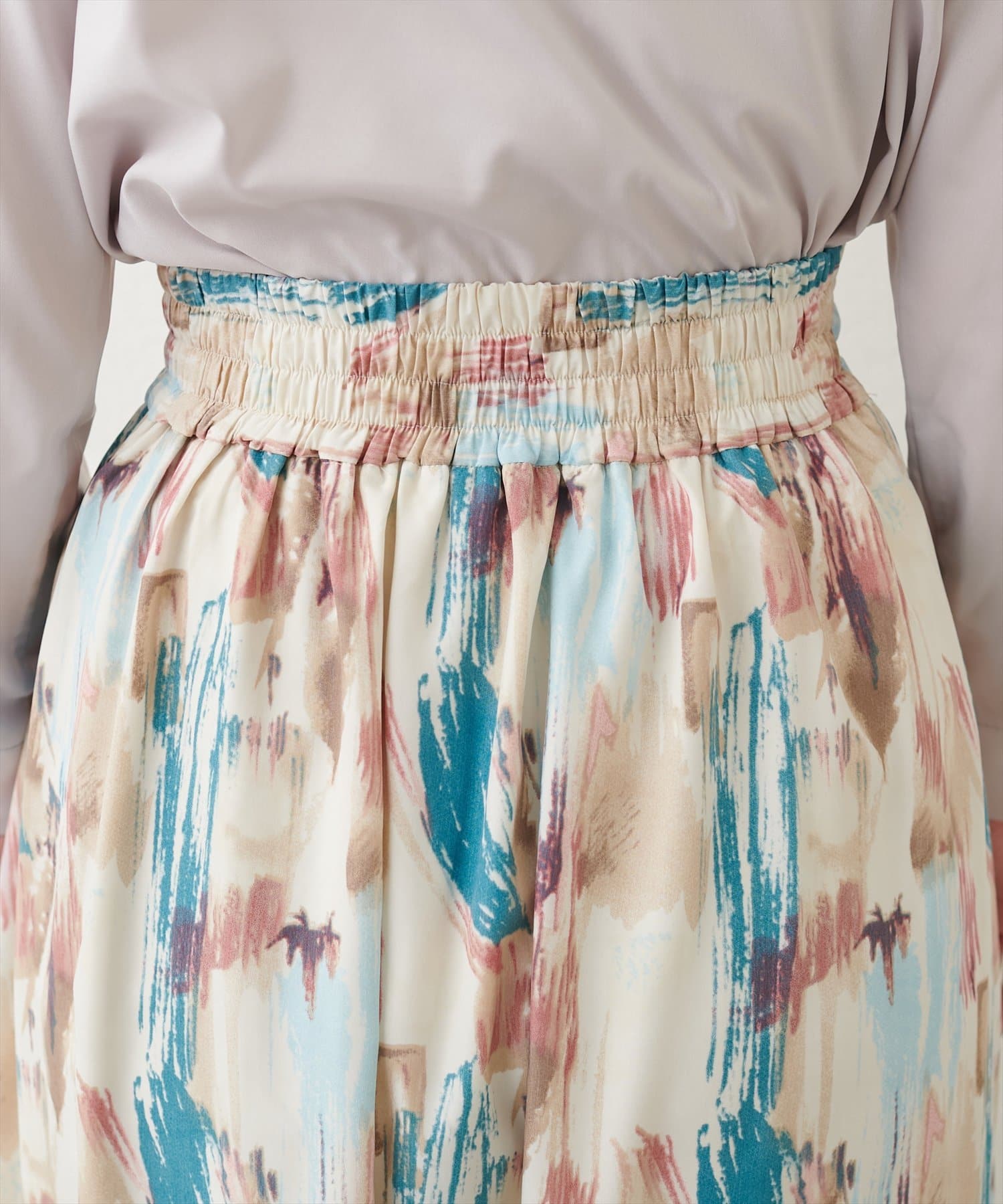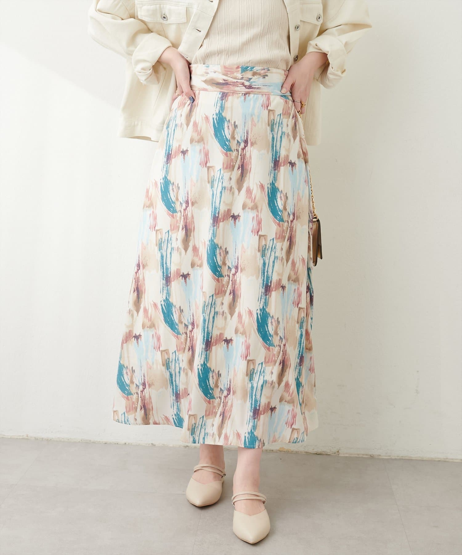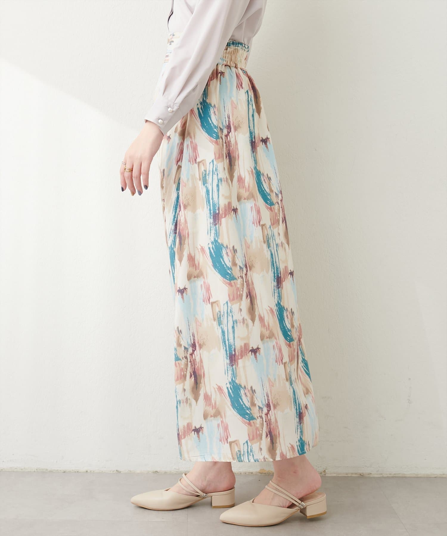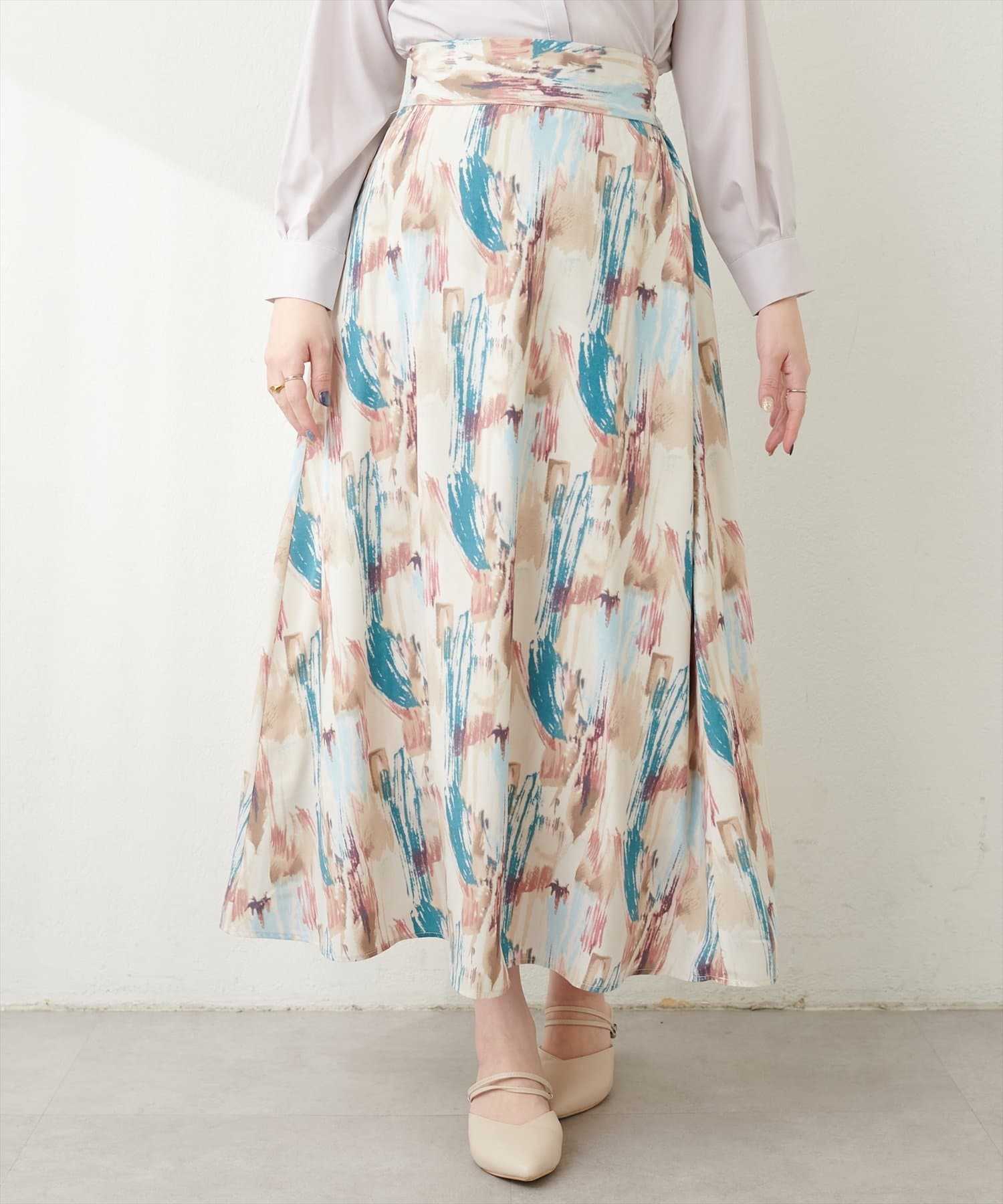 アート柄を全体にデザインし、裾にかけて緩やかなフレアラインに仕上げた、履くだけでお洒落感が増す1着。