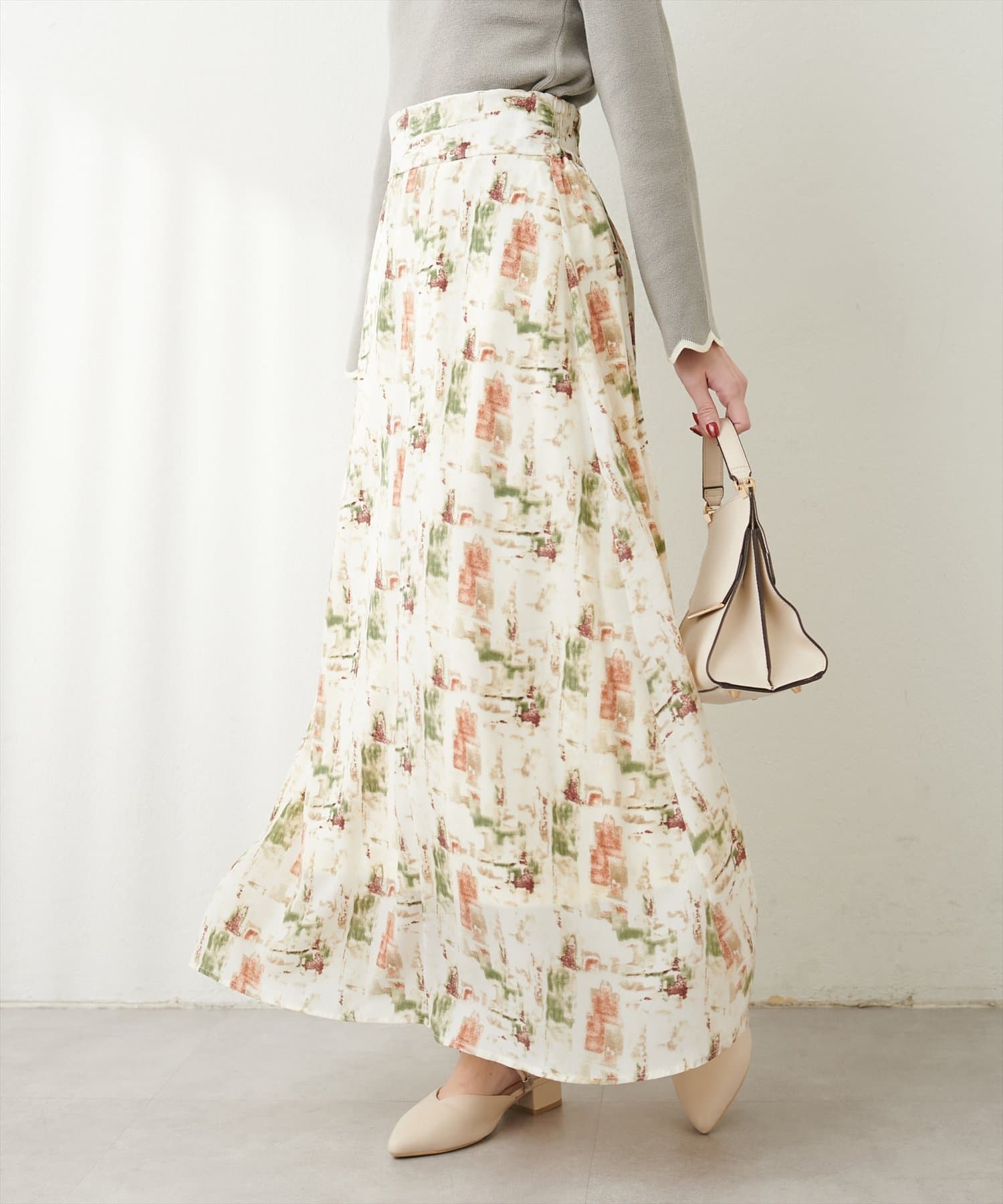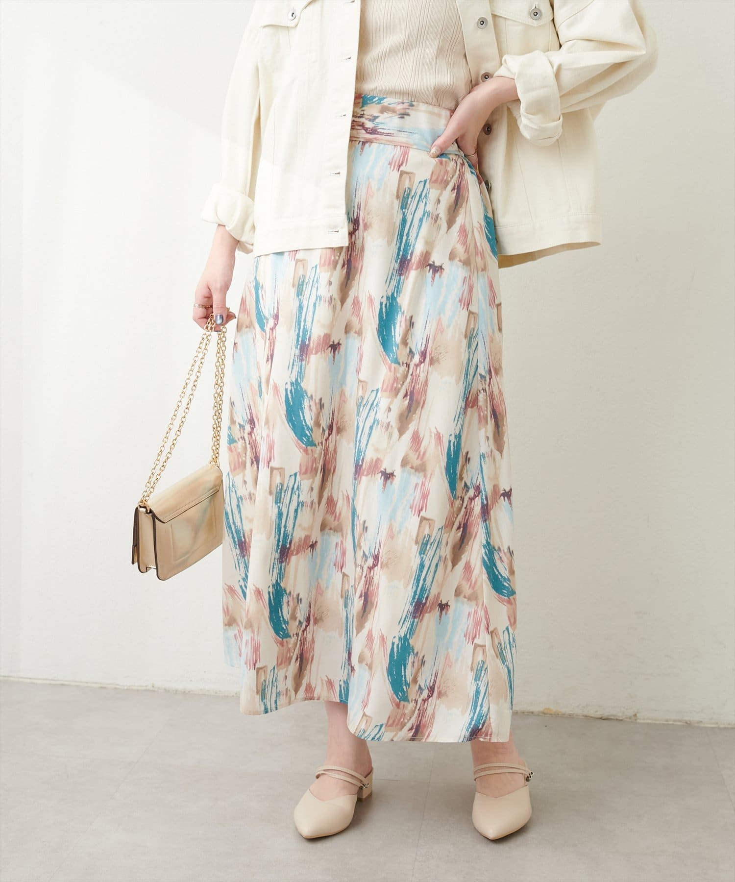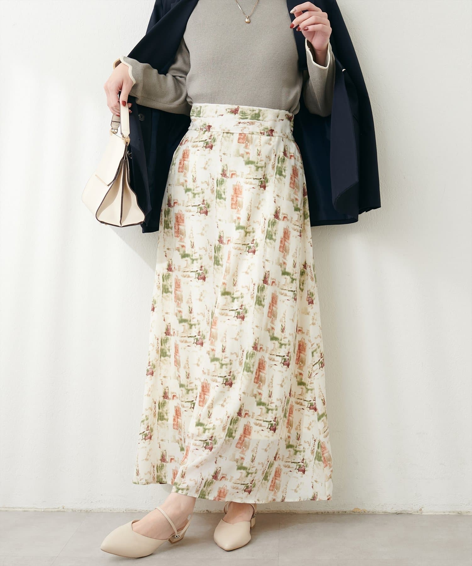 アート柄を全体にデザインし、裾にかけて緩やかなフレアラインに仕上げた、履くだけでお洒落感が増す1着。