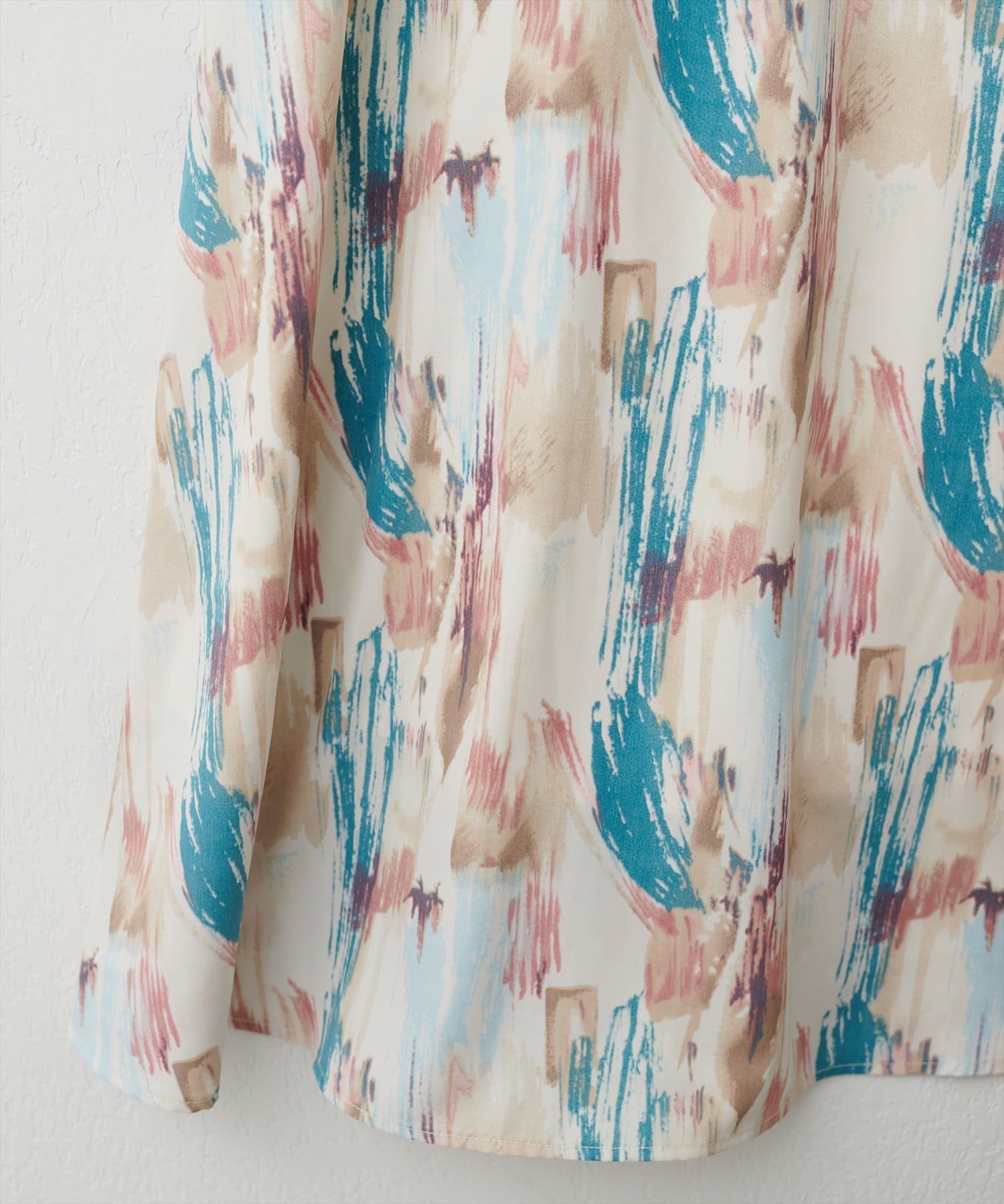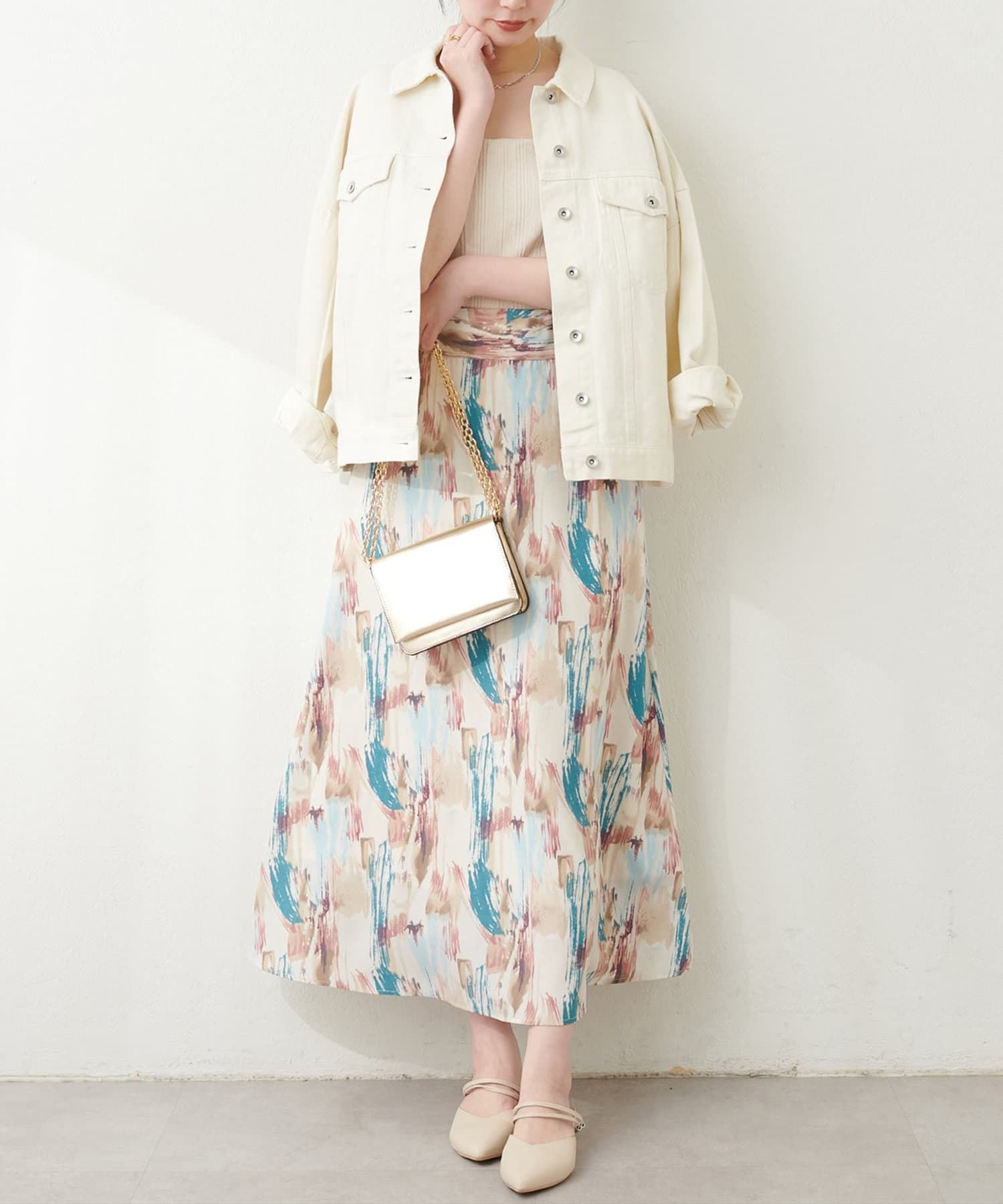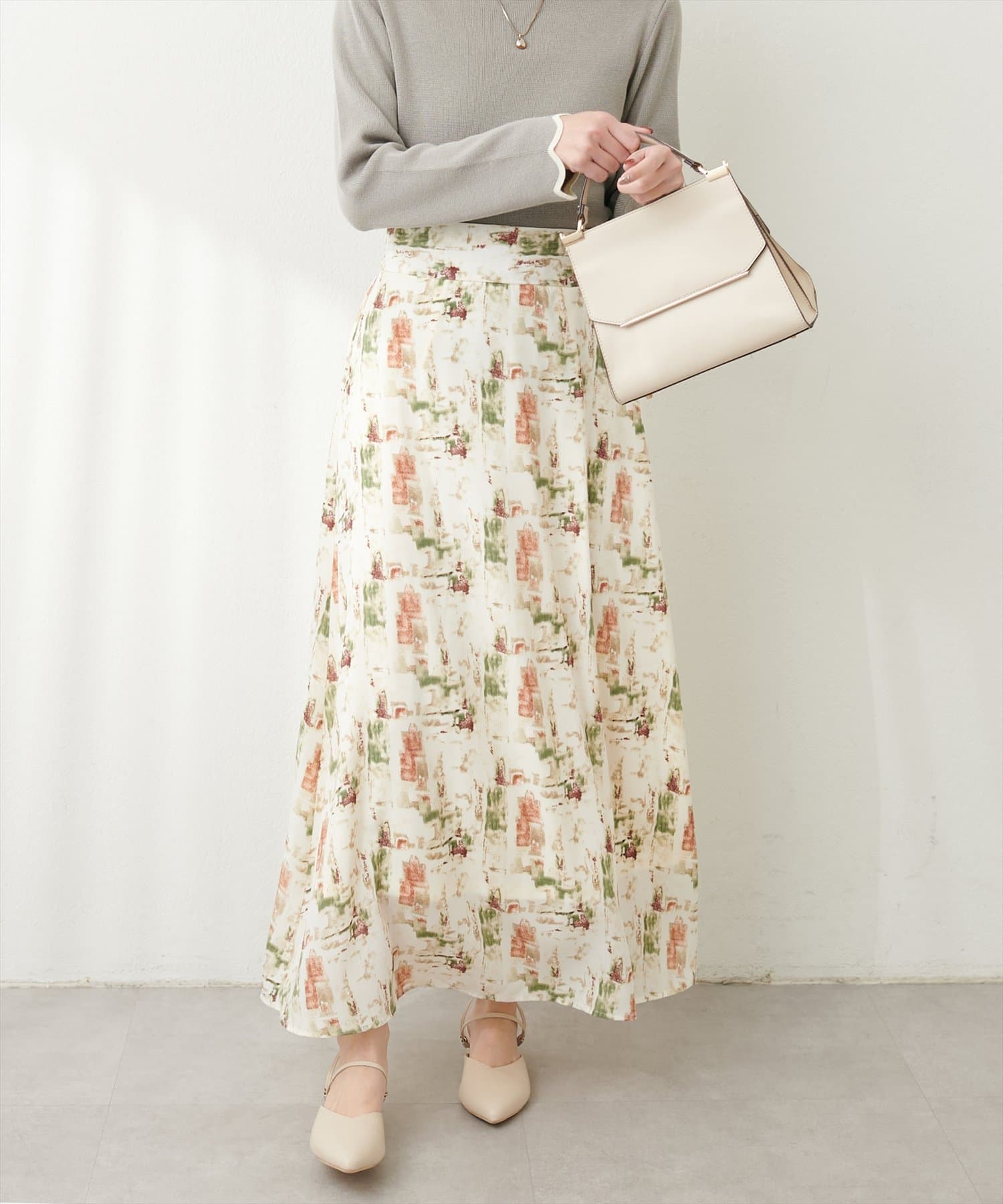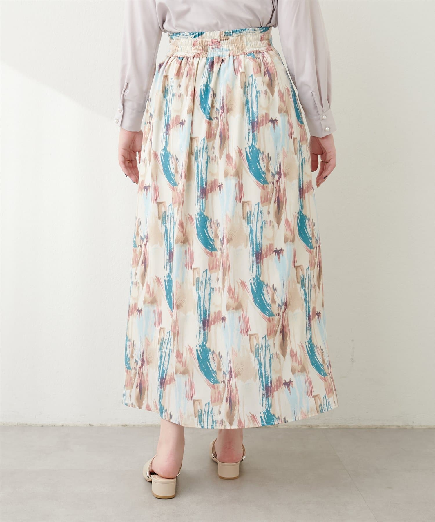 アート柄を全体にデザインし、裾にかけて緩やかなフレアラインに仕上げた、履くだけでお洒落感が増す1着。