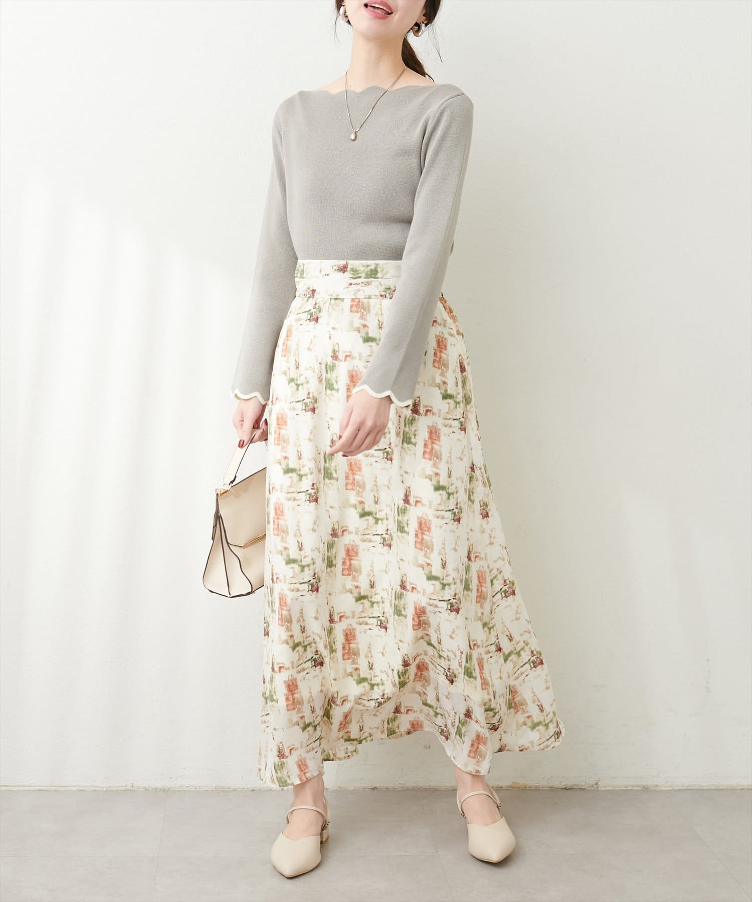 シンプルなハイネックニットやすっきりめのブラウスを合わせると、スカートのデザインが引き立ちます。