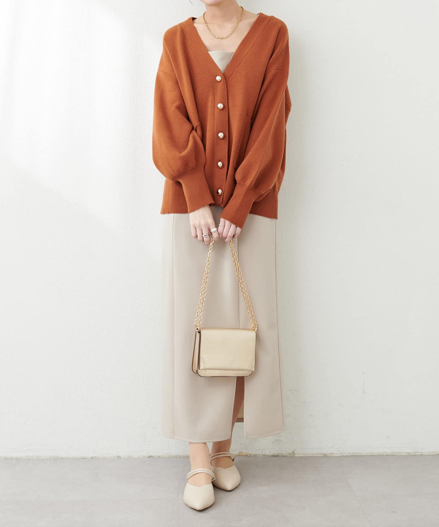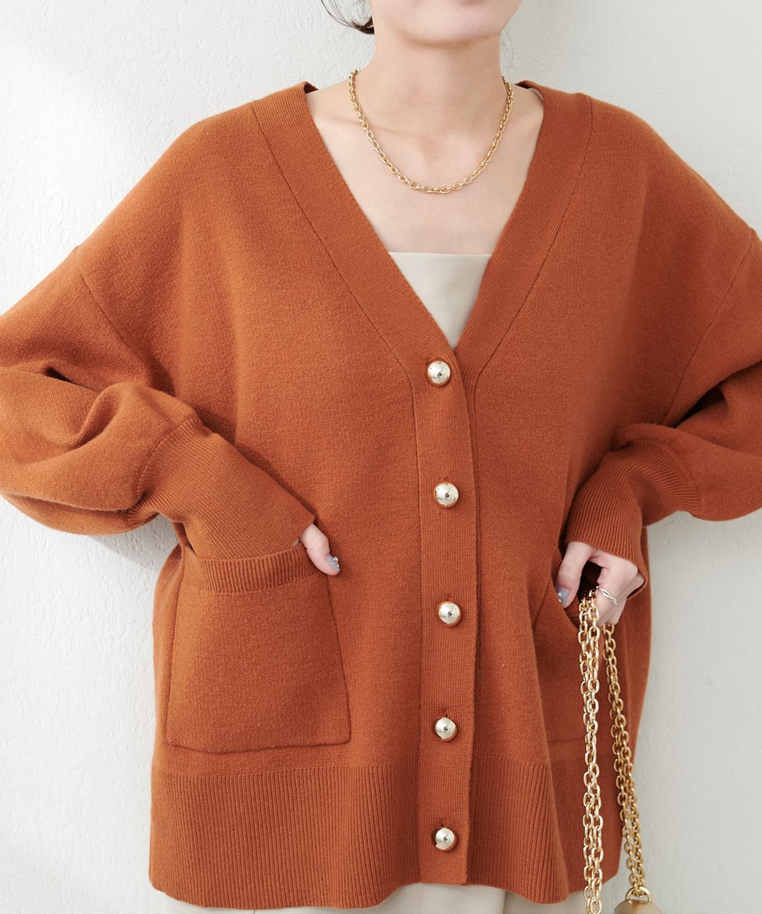 ぷっくりとした金ボタンが特徴のミドル丈カーディガン。