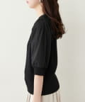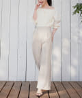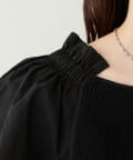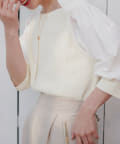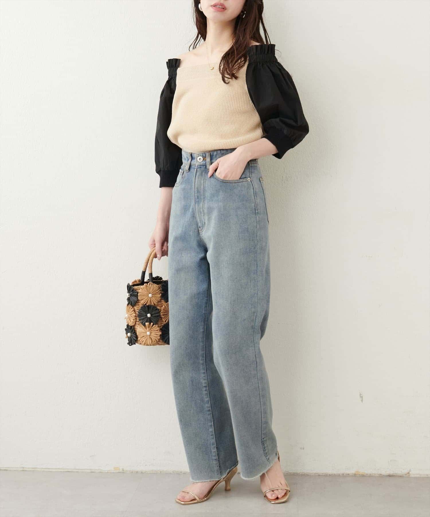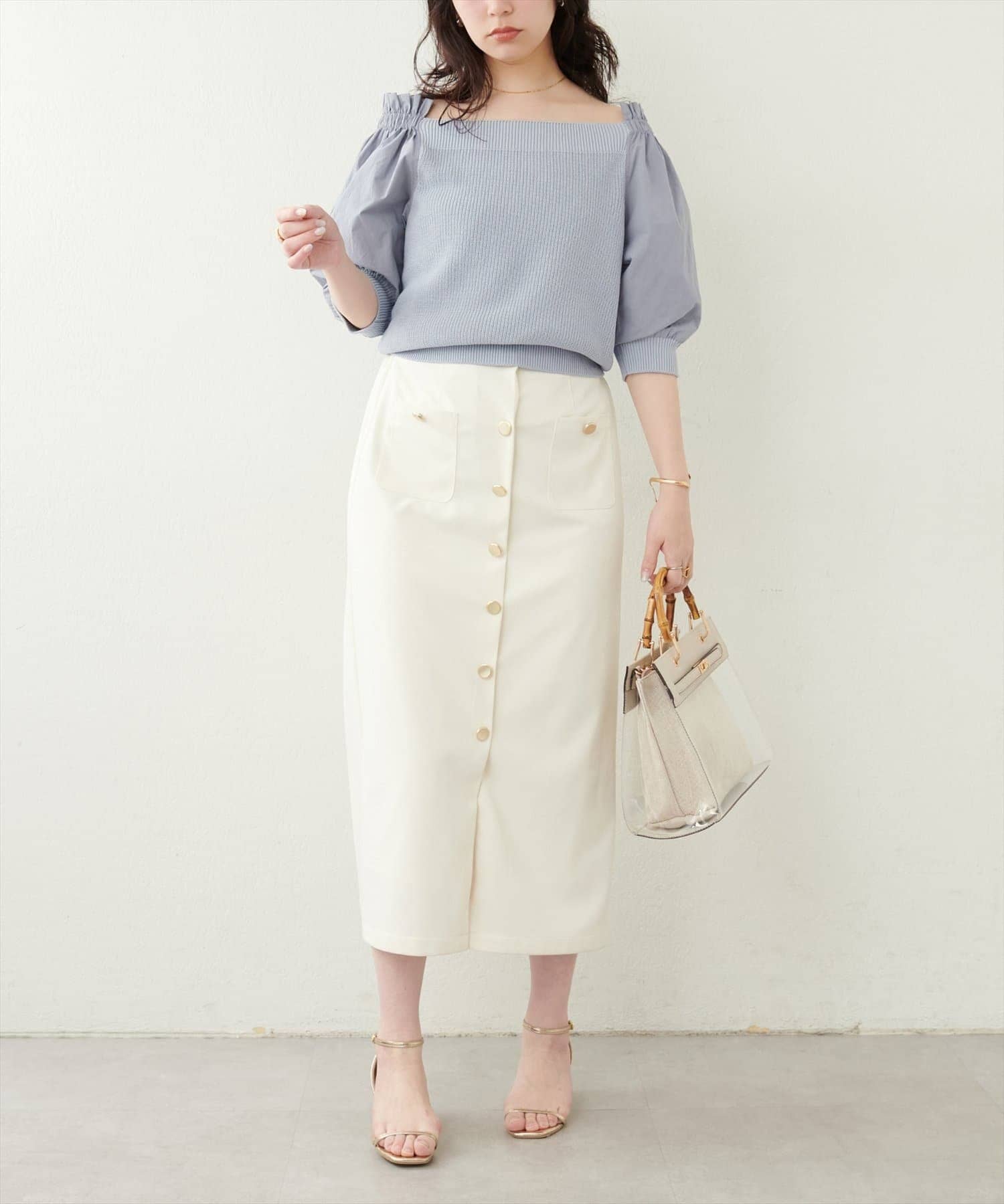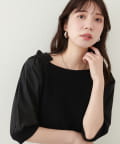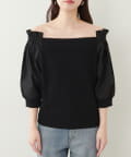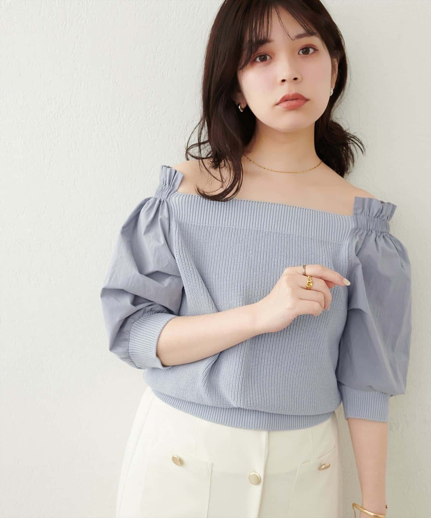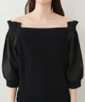 肩のフリルは鎖骨周りをスッキリ見せてくれ、ボリューム感のある袖もポイント。