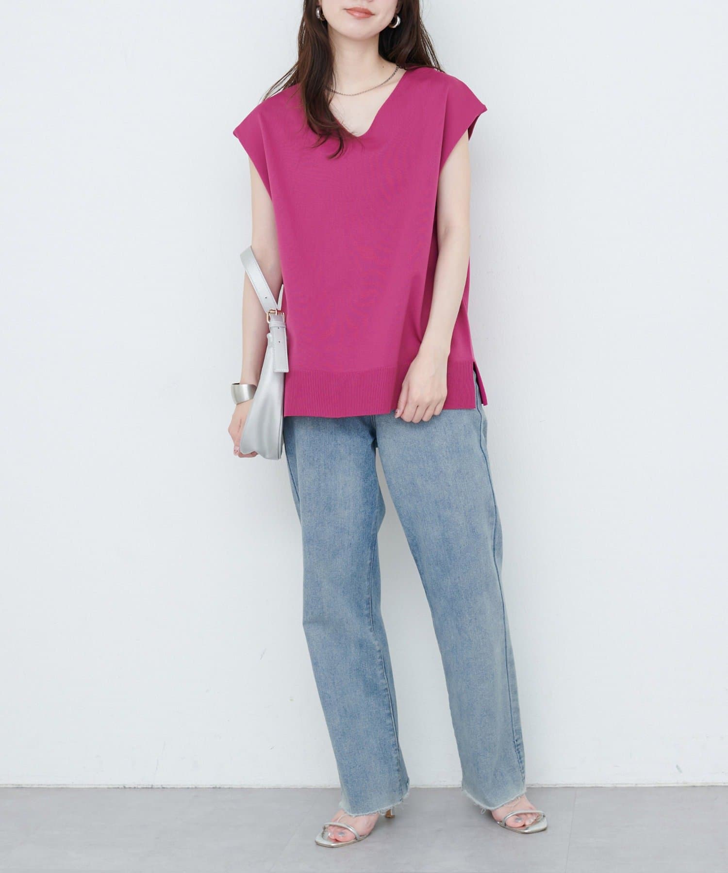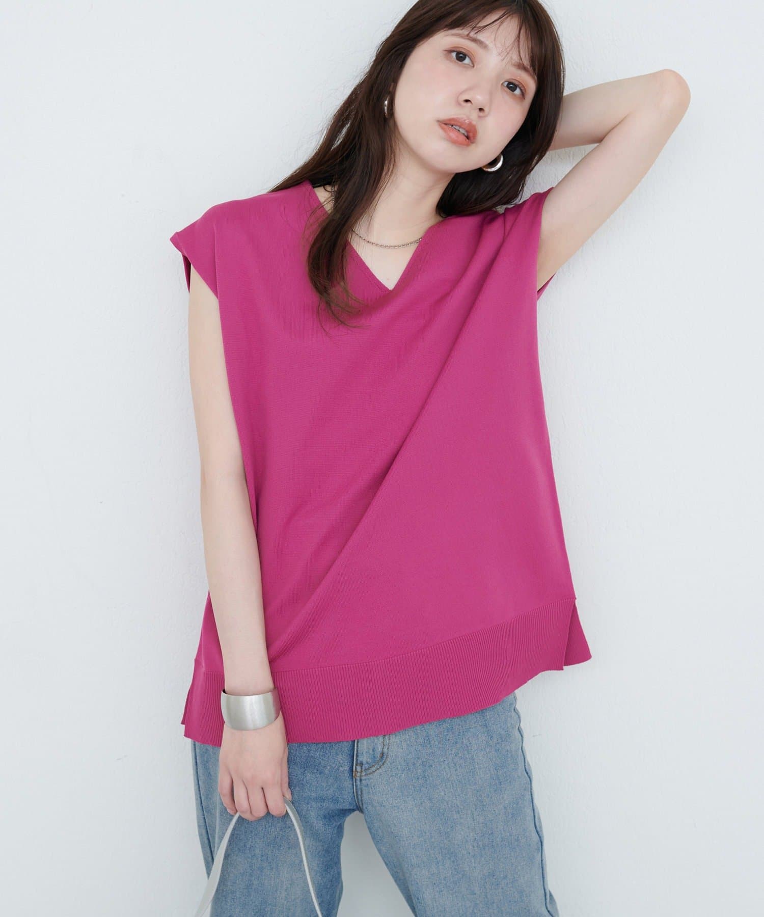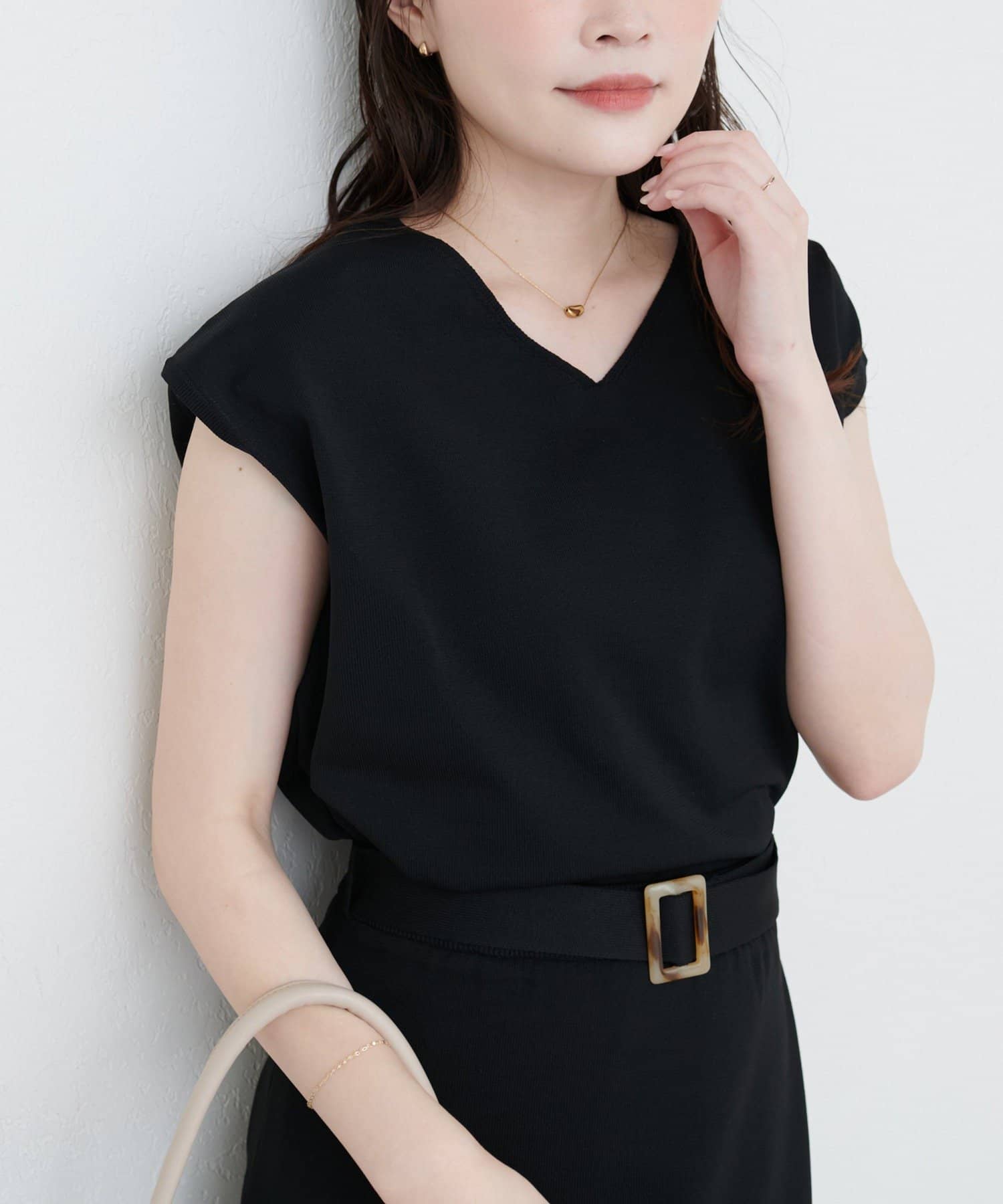 シンプルなデザインの中に、女性らしさと上品さを兼ね備えたVネックノースリーブニット。