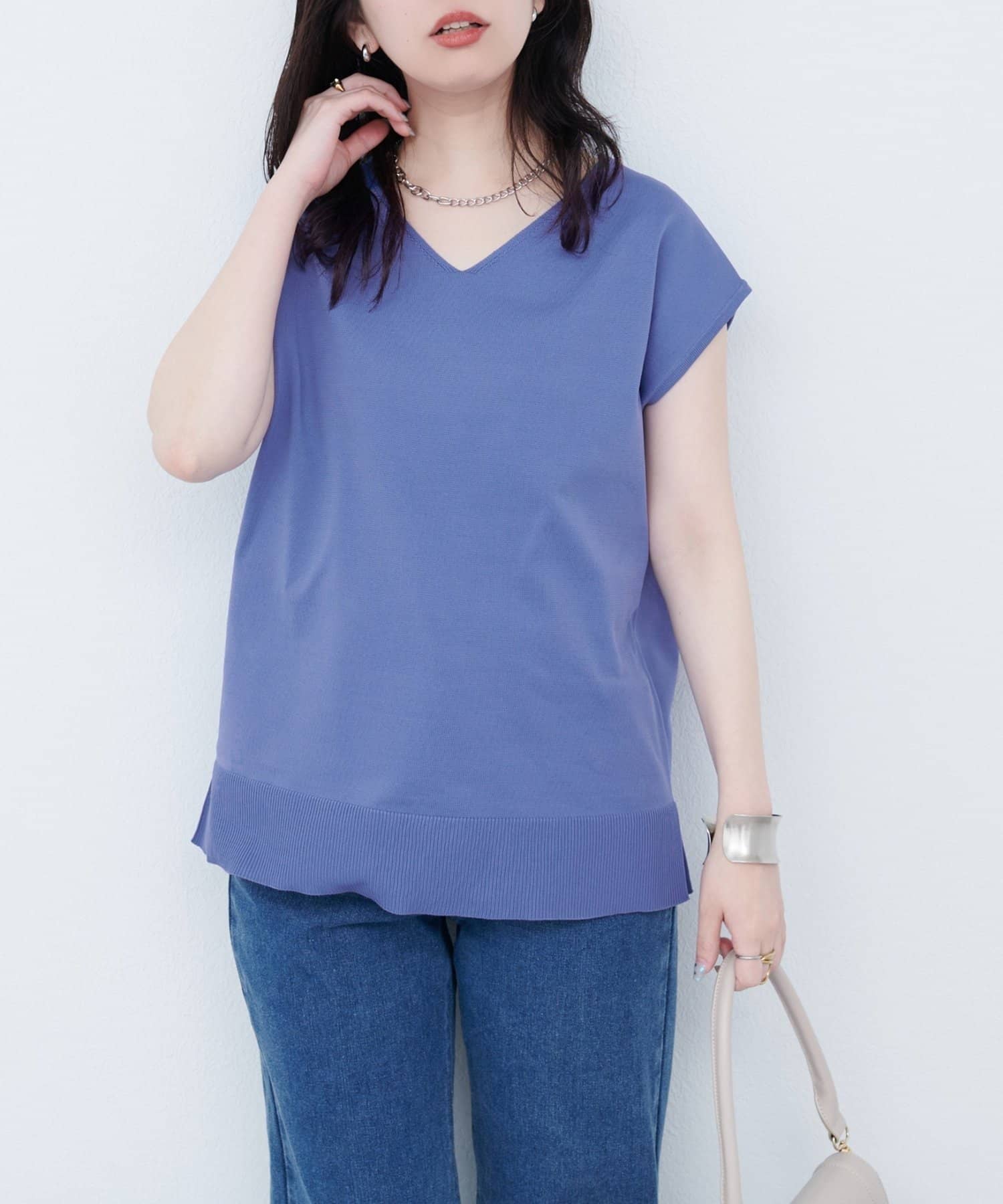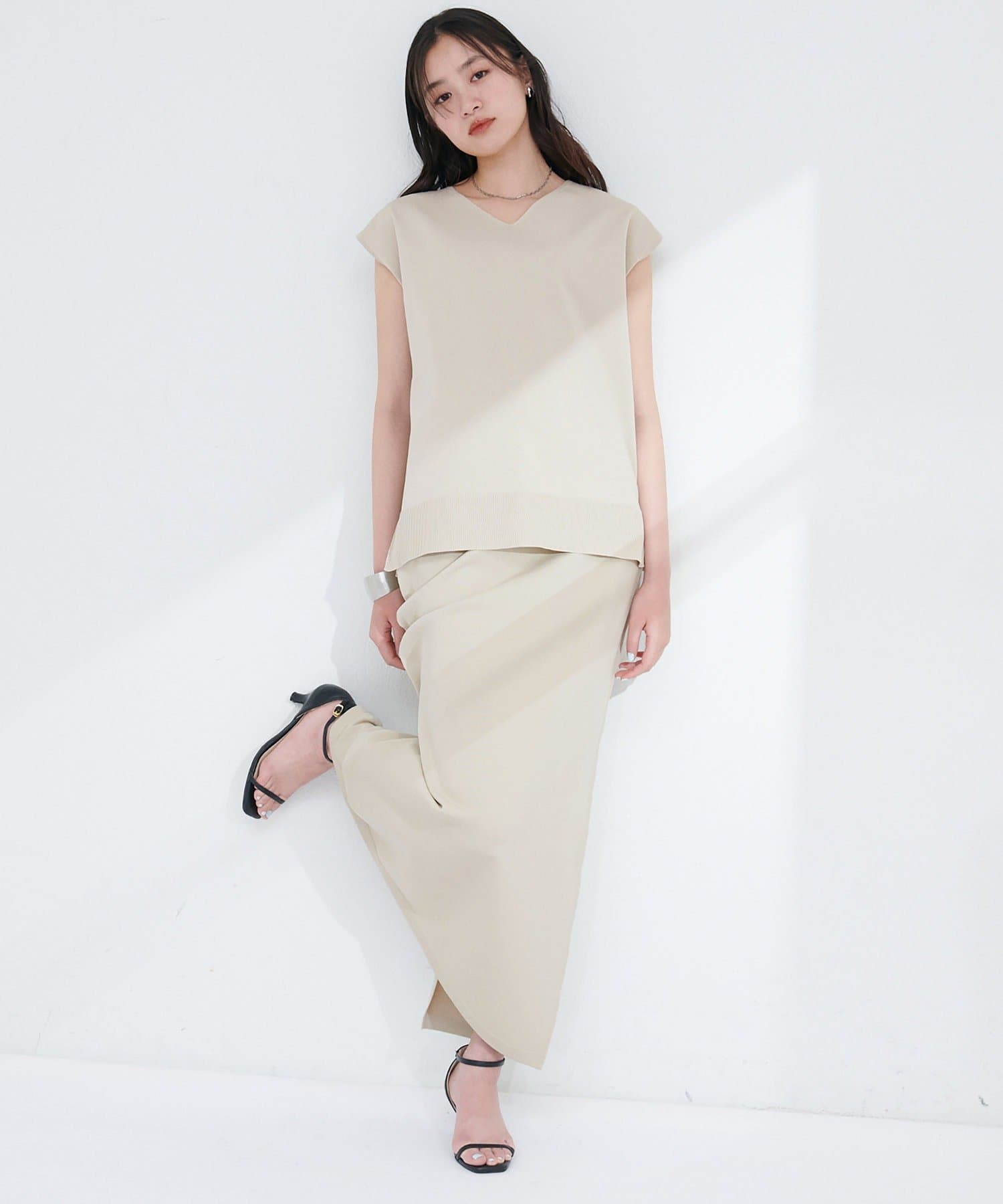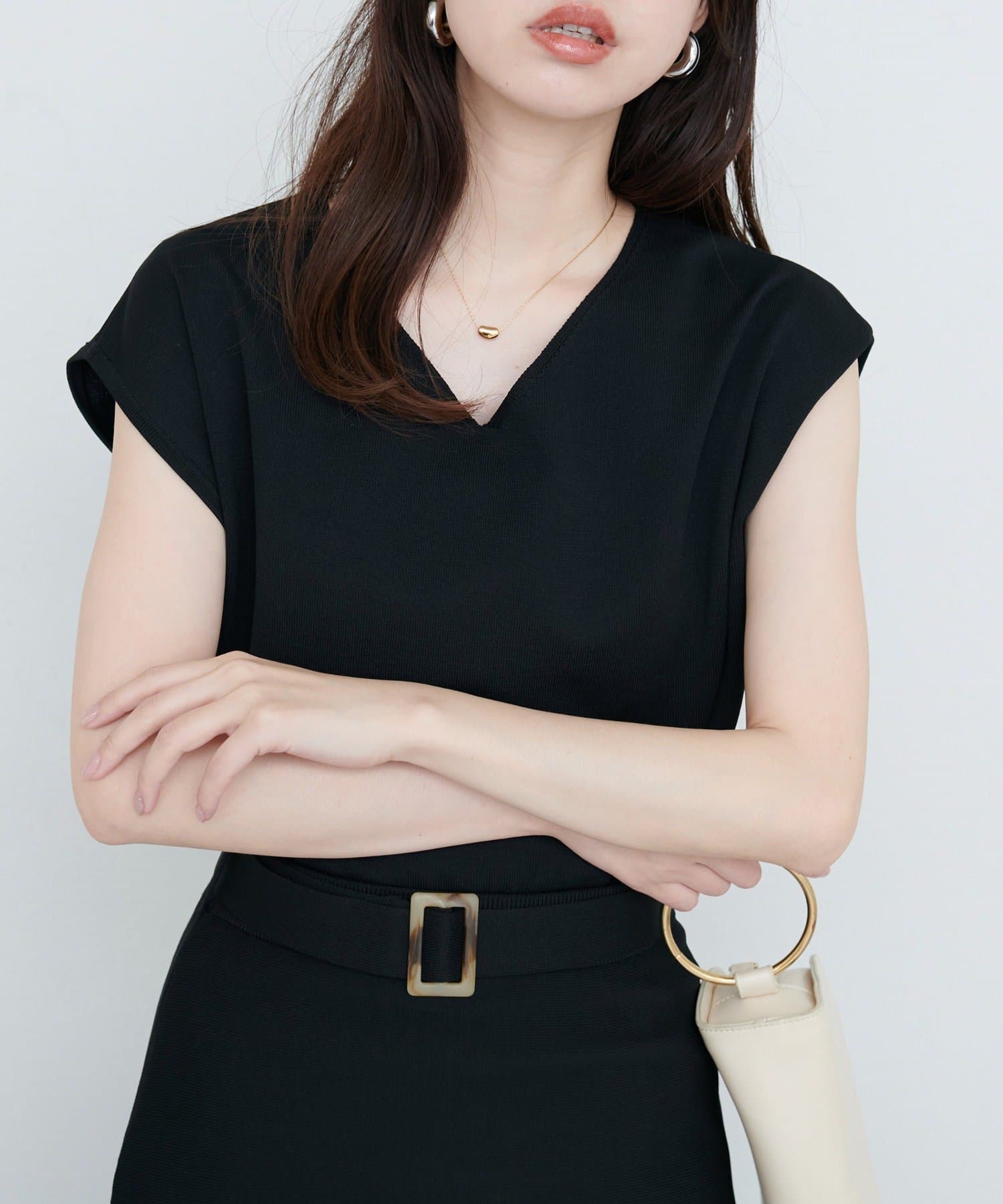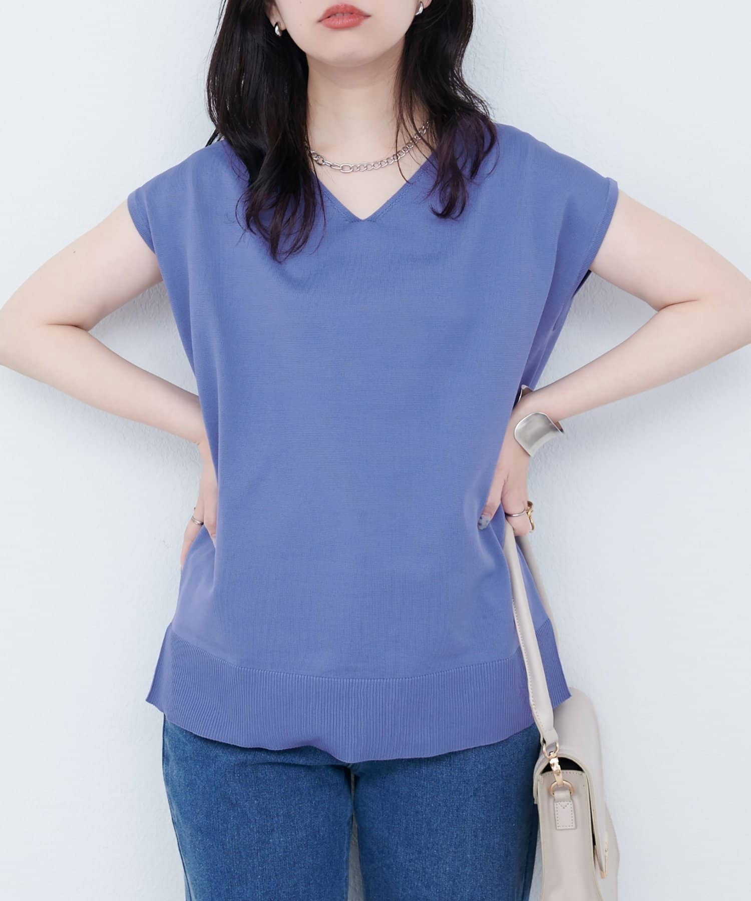 シンプルなデザインの中に、女性らしさと上品さを兼ね備えたVネックノースリーブニット。