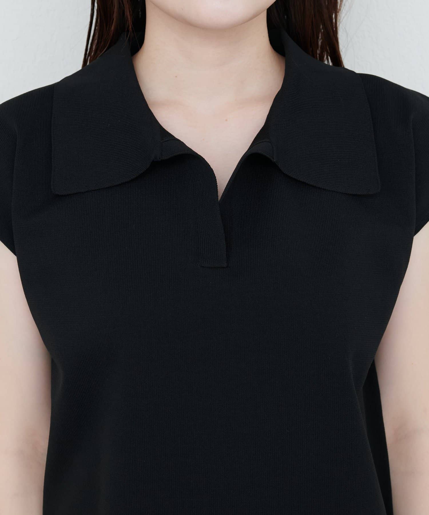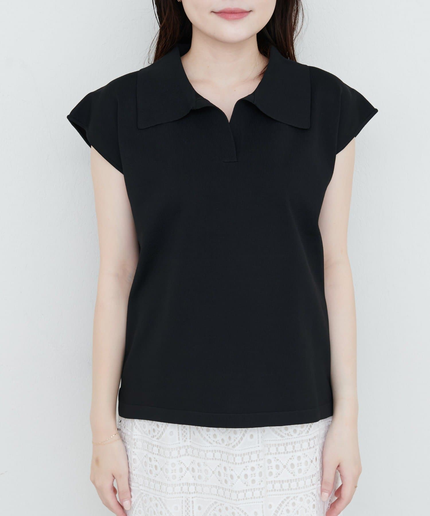 都会的で洗練された印象を与える、襟付きニットポロトップス。