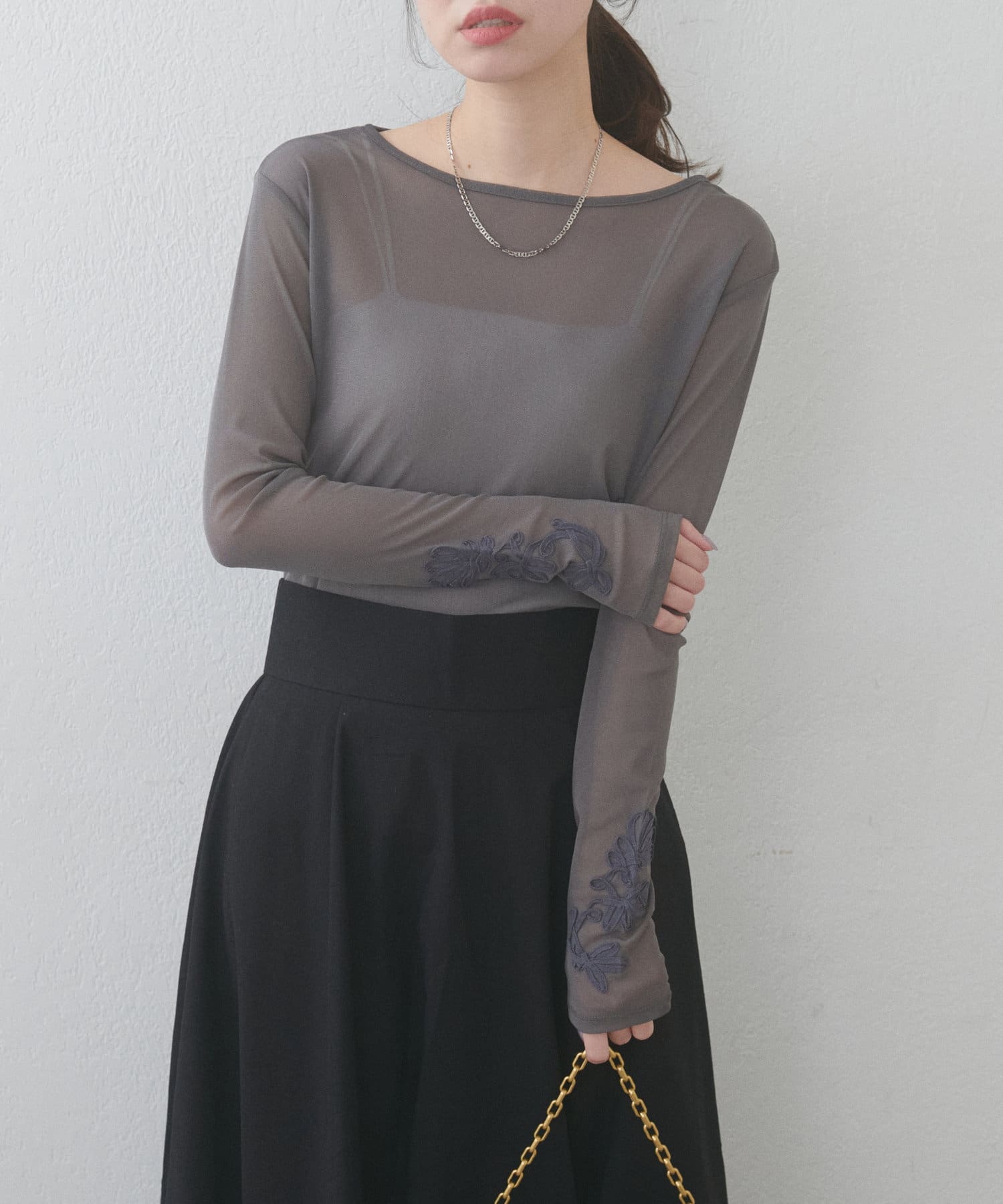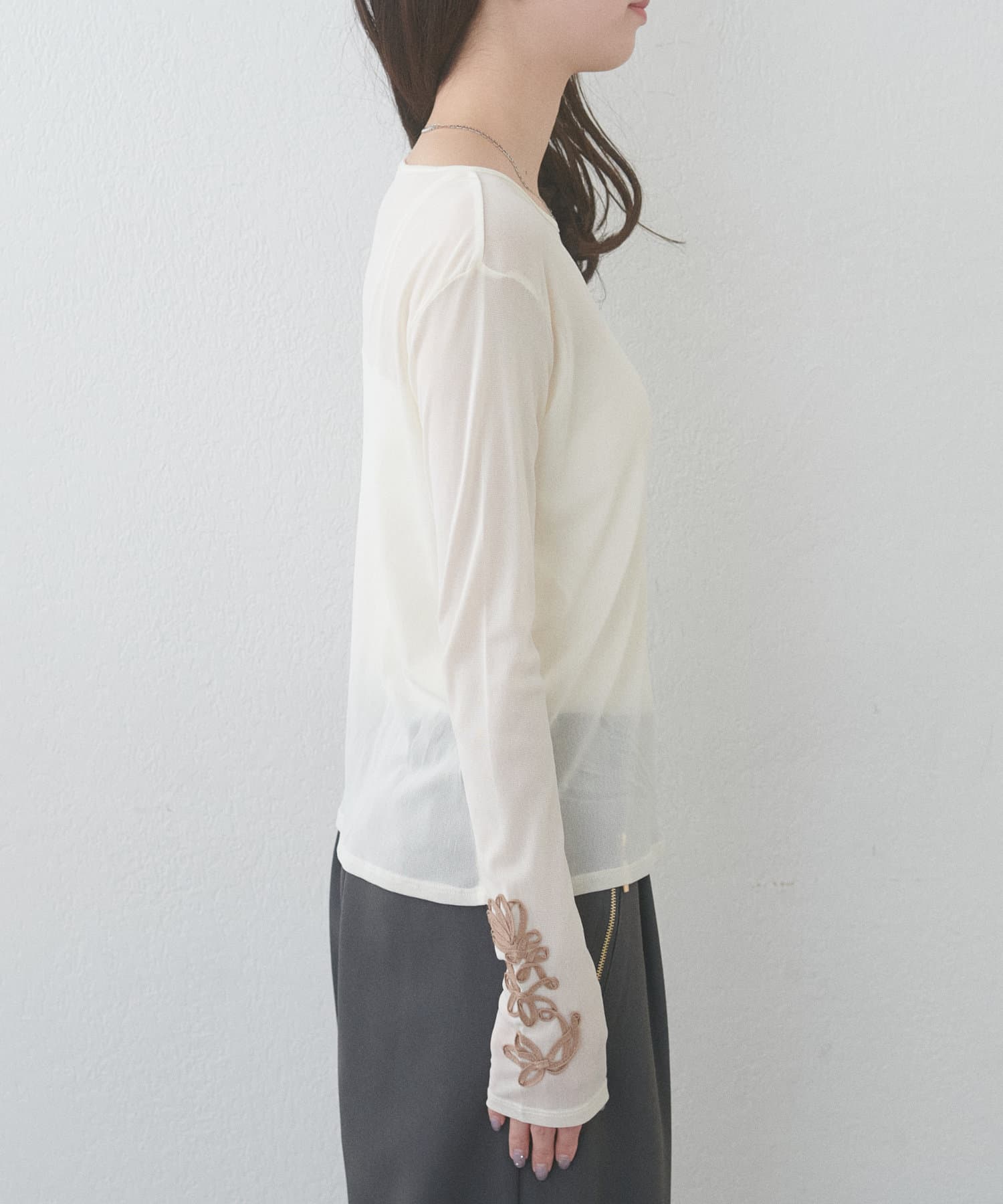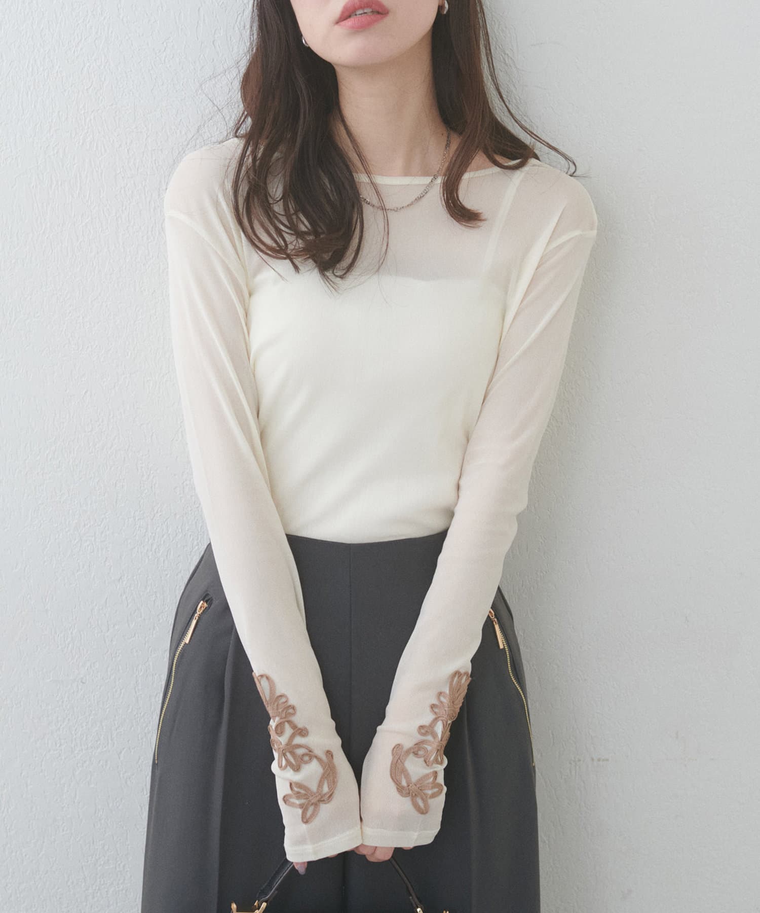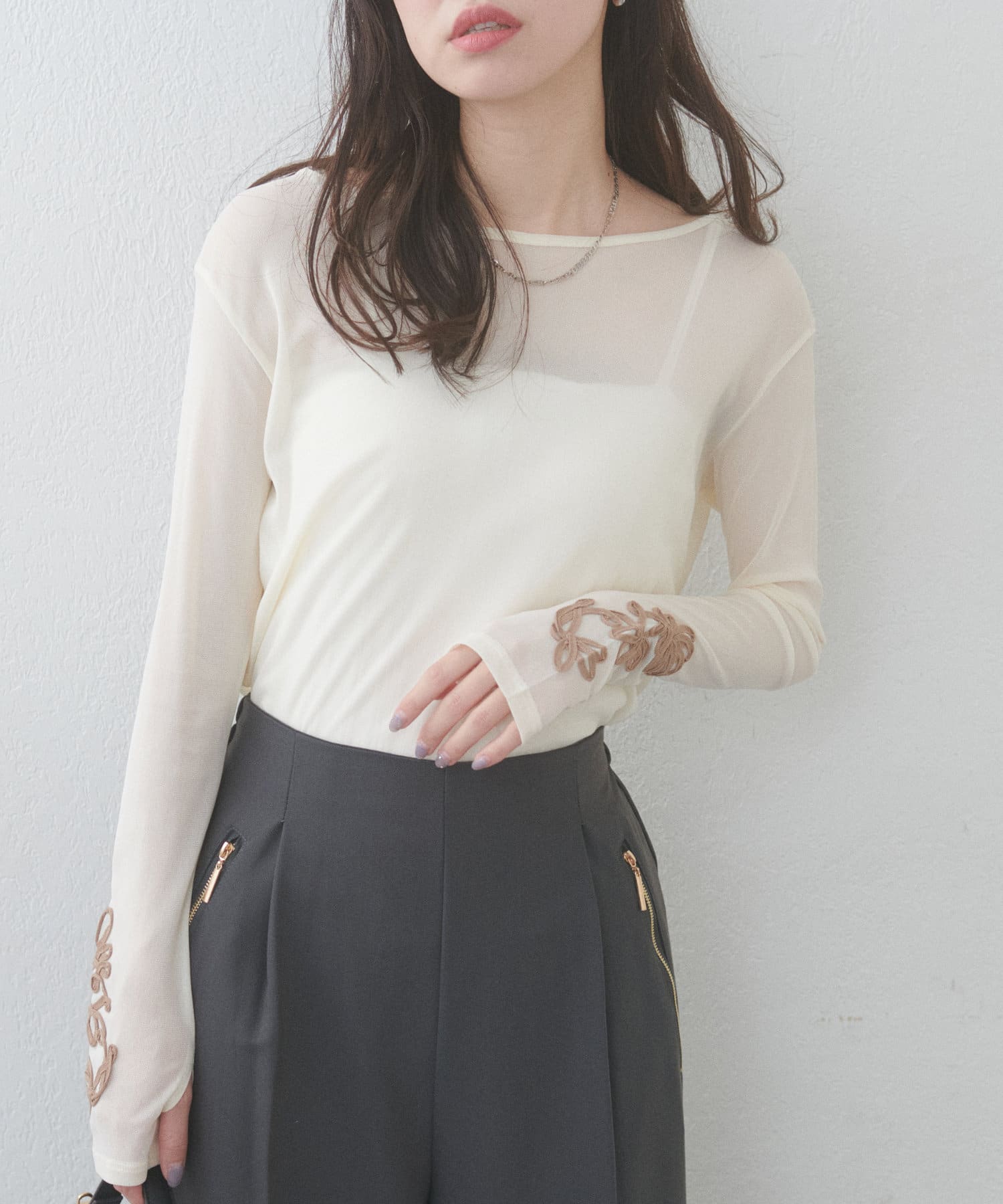 シアー素材で抜け感を演出し、袖の配色刺繍がポイントに。