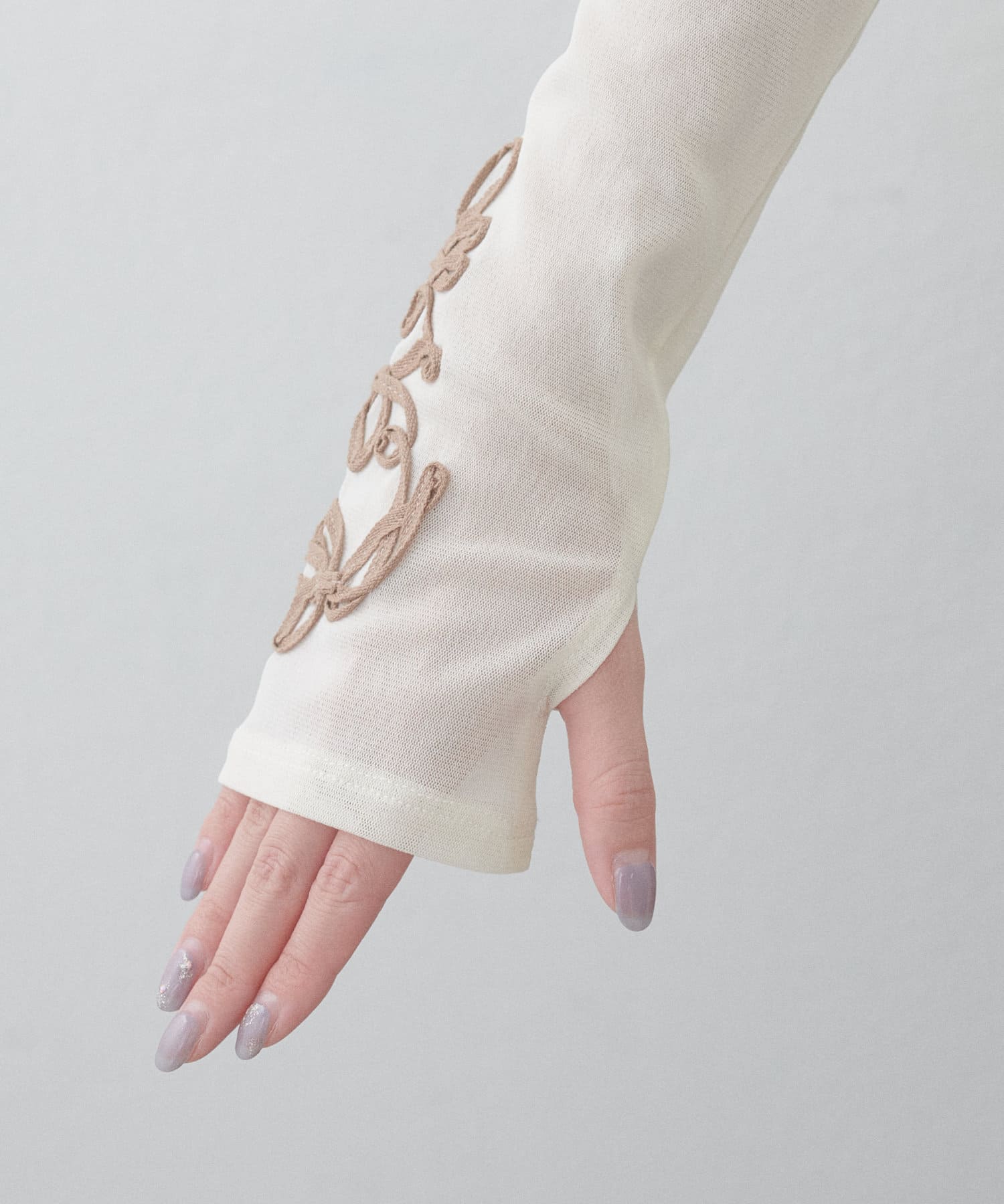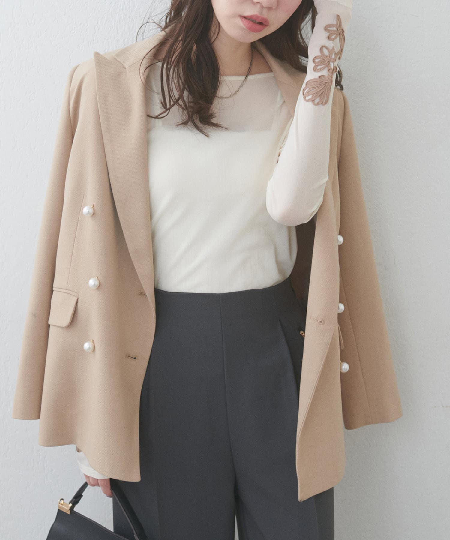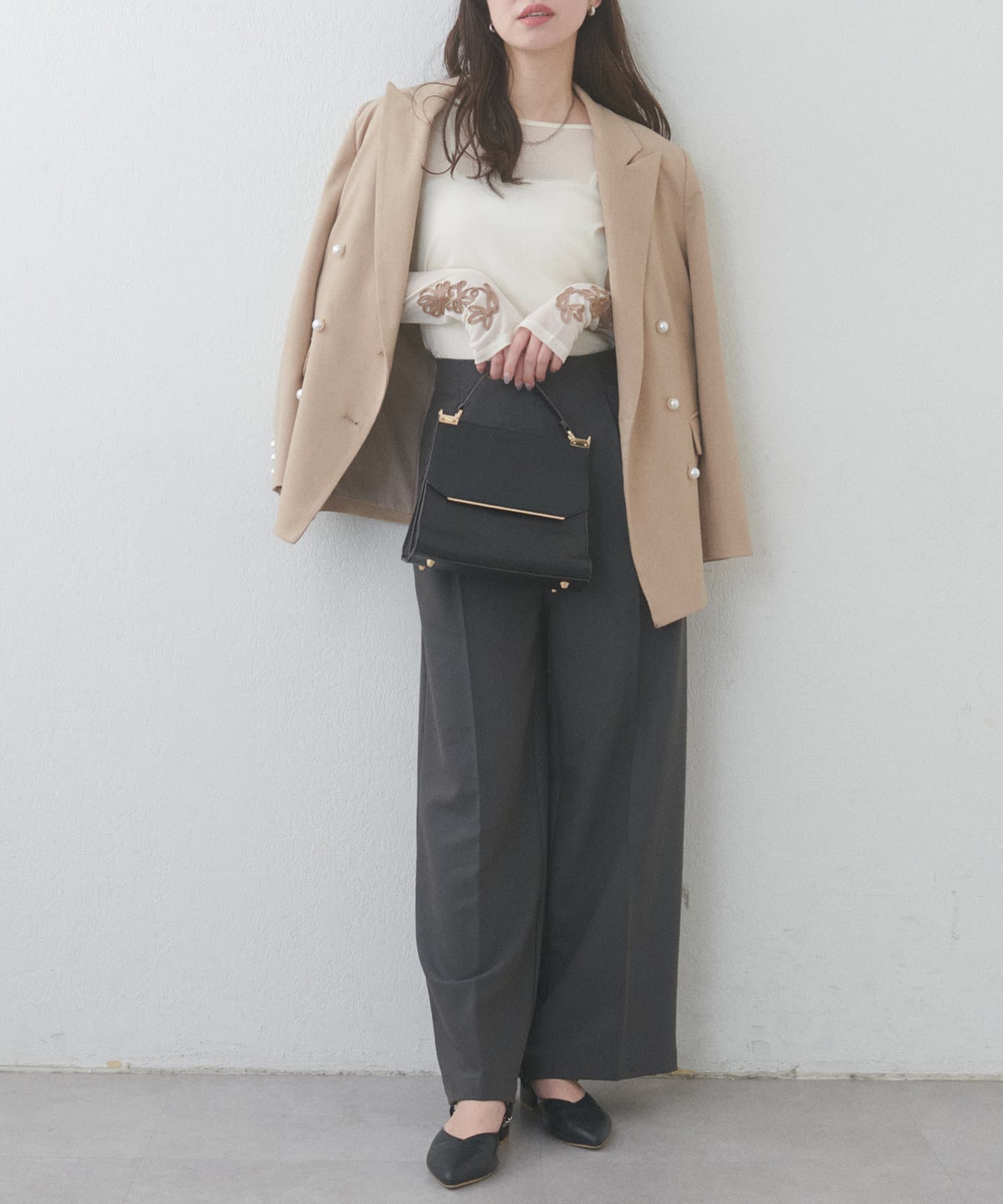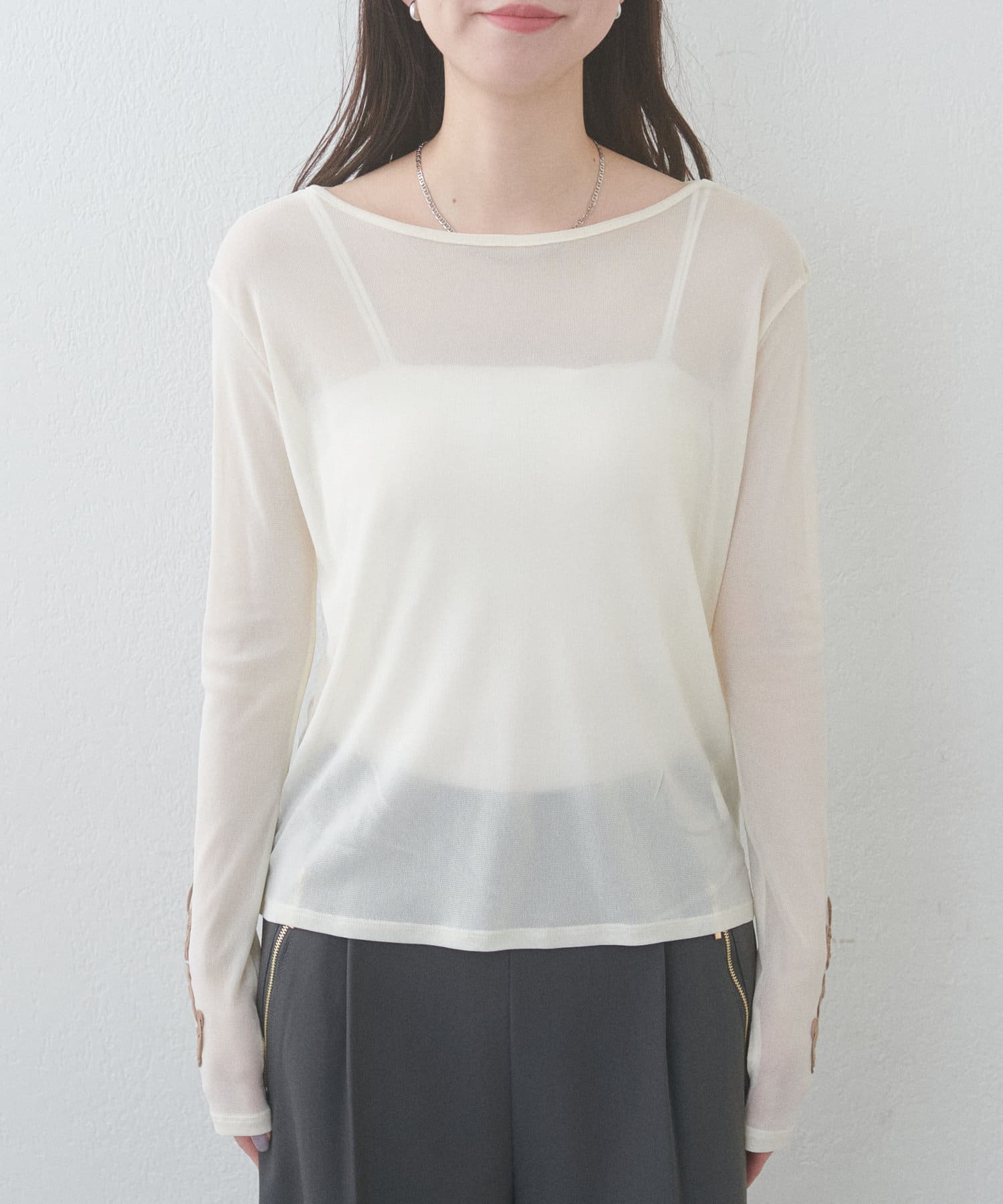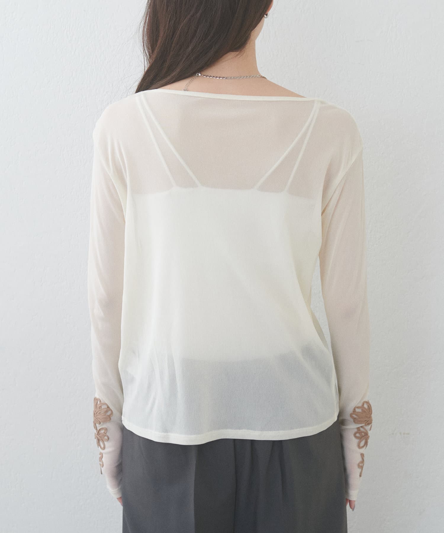 シアー素材で抜け感を演出し、袖の配色刺繍がポイントに。